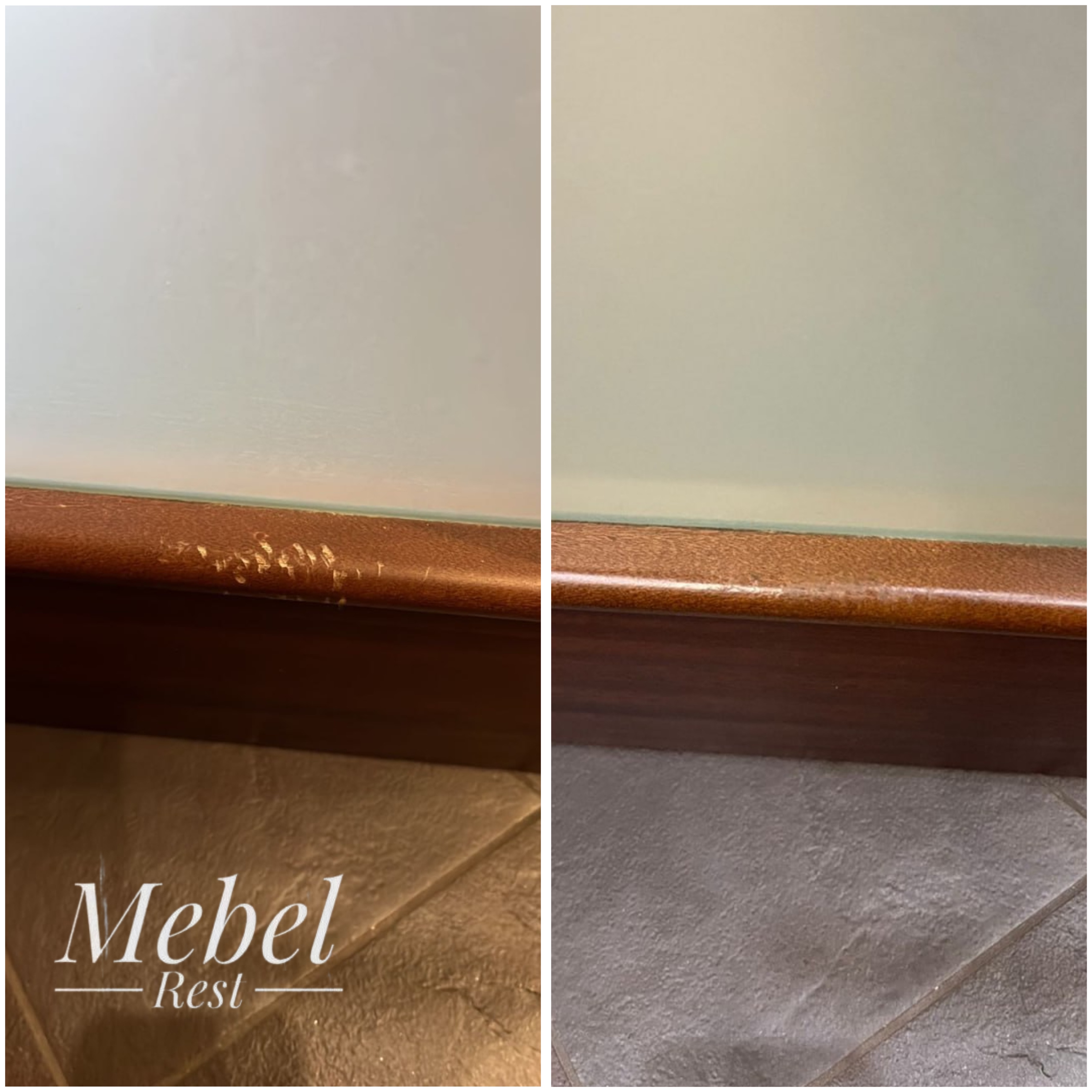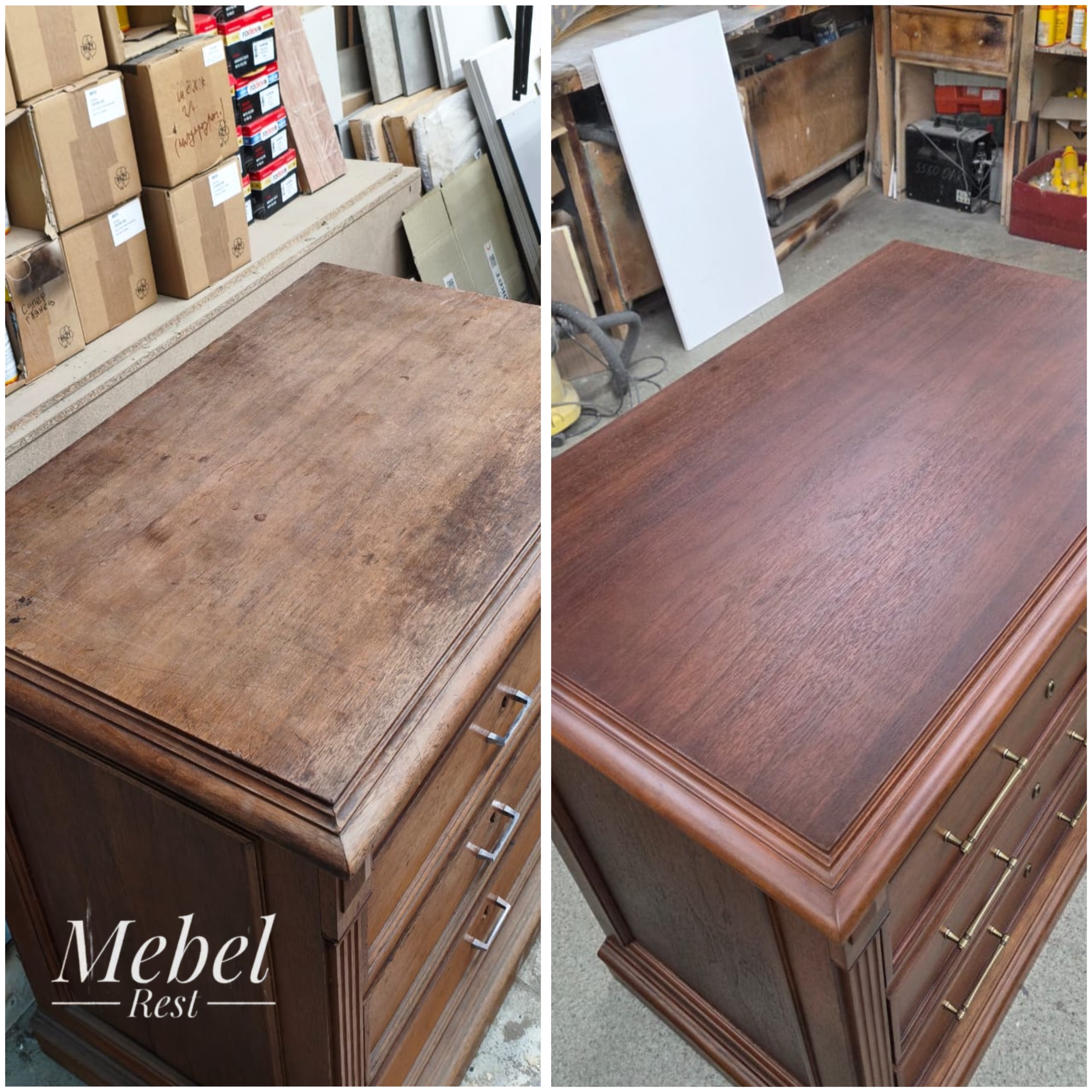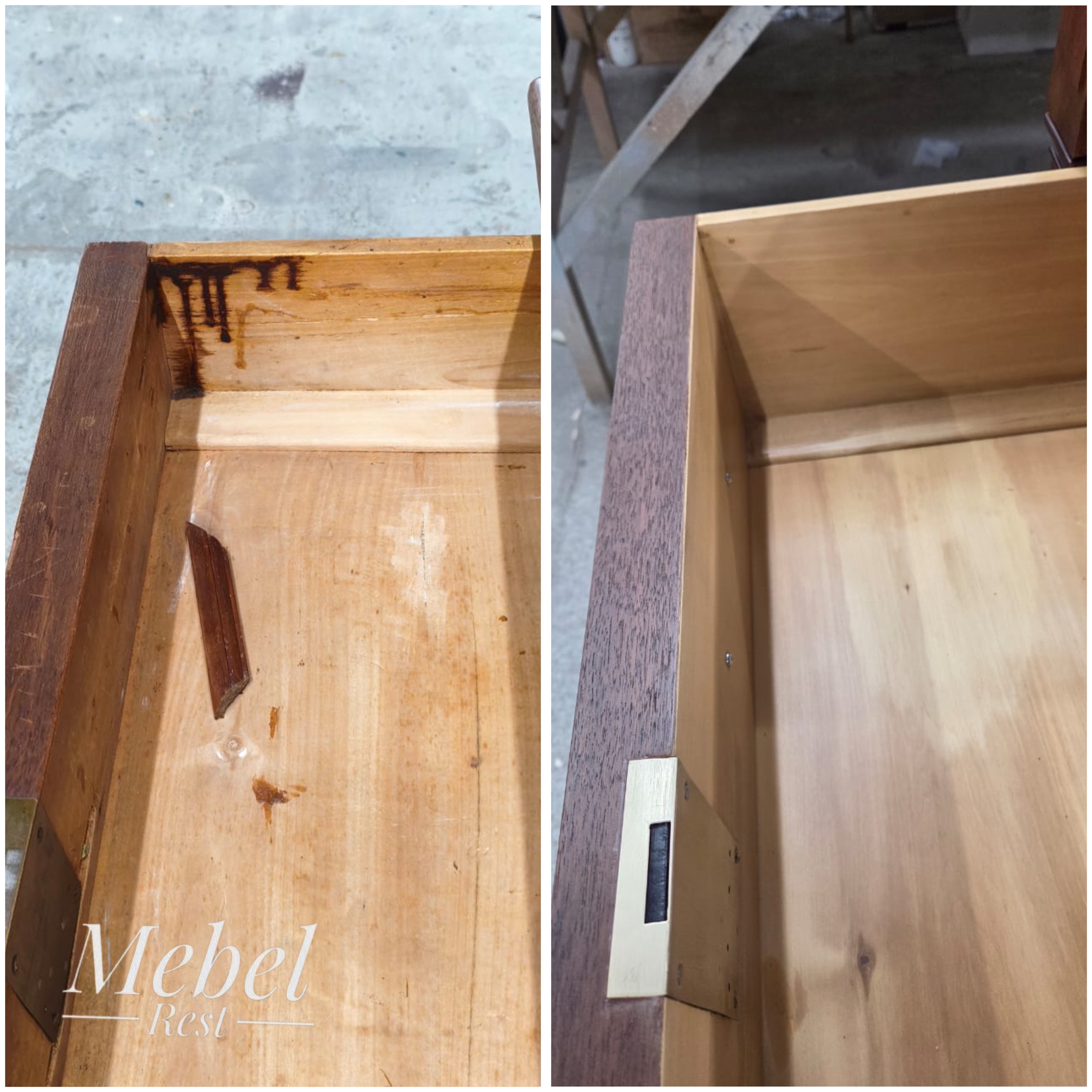 На второй день уже укрепленное место точечно было запаяно реставрационным воском, и подбирался тон фактуры дерева. На следующем этапе место реставрации было покрыто матовым водным лаком. На третий и четвертый день то же самое проделали с другим местом слома. Из-за предыдущего непрофессионального ремонта пришлось придать подлокотнику напряжение, чтобы свести две плоскости.
