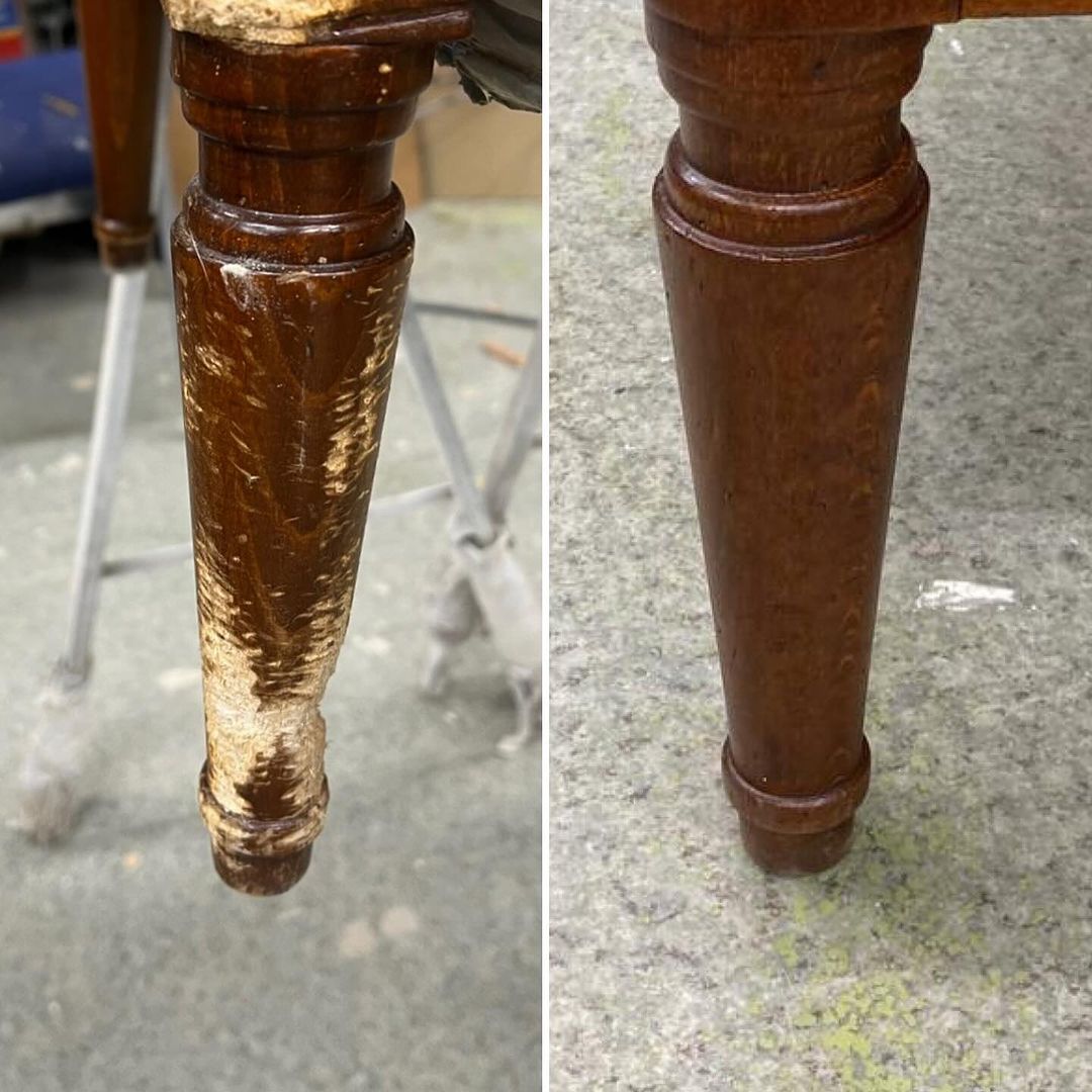 Помимо укрепления конструкции и декоративной отделки, наша мастерская произвела ряд работ по перетяжке сидений и спинок стульев и кресел, были установлены новые ремни, взамен раскрошившегося со временем поролона был положен современный, более прочный, старую ткань заменили новой, льняной, по краю ткани был пущен в два ряда кант из хлопкового шнура.