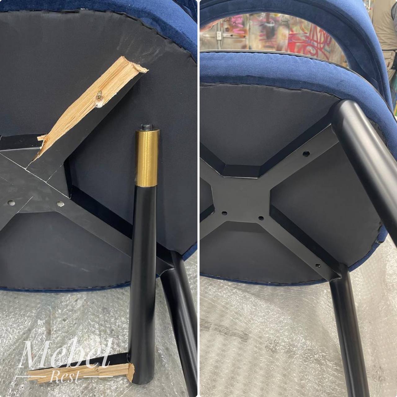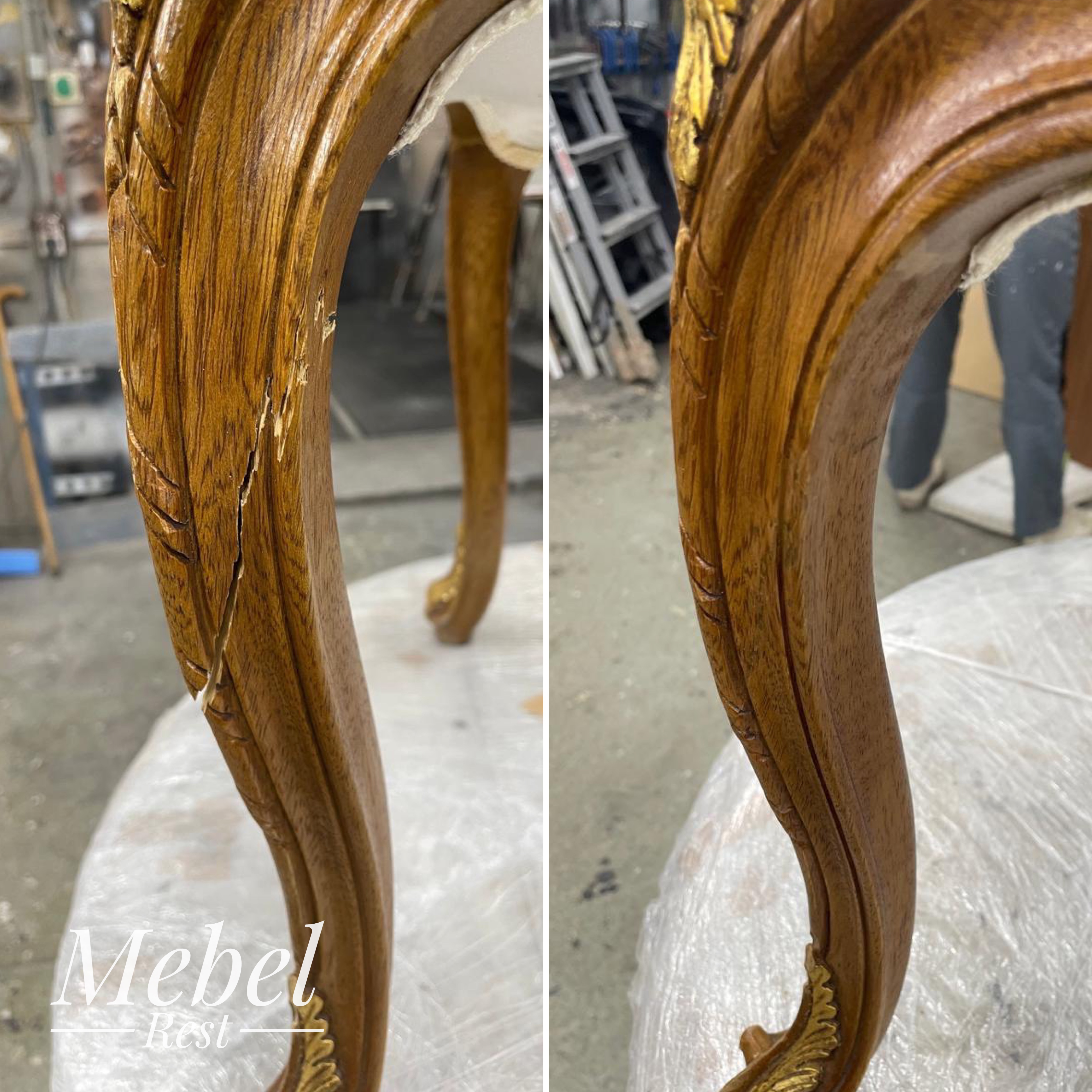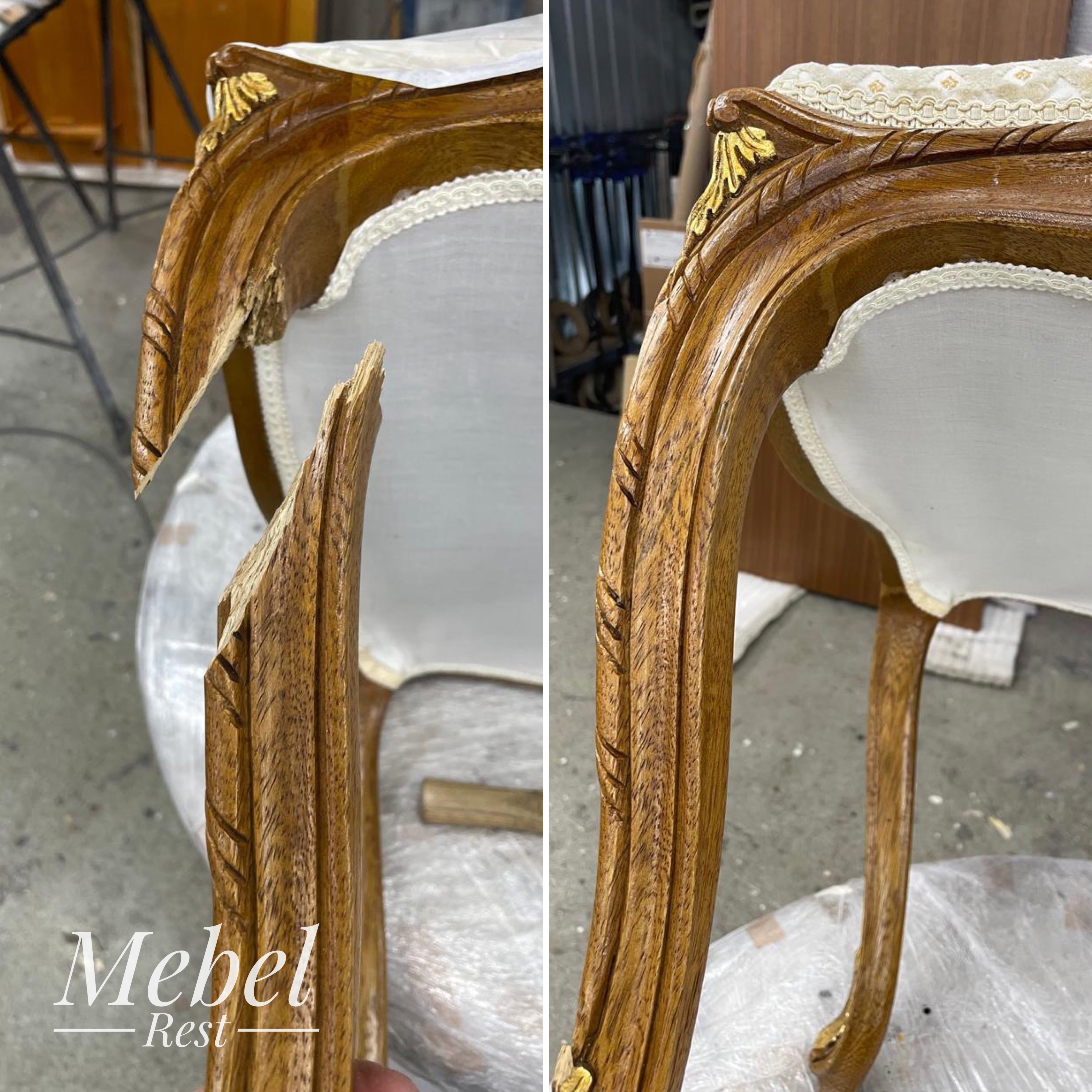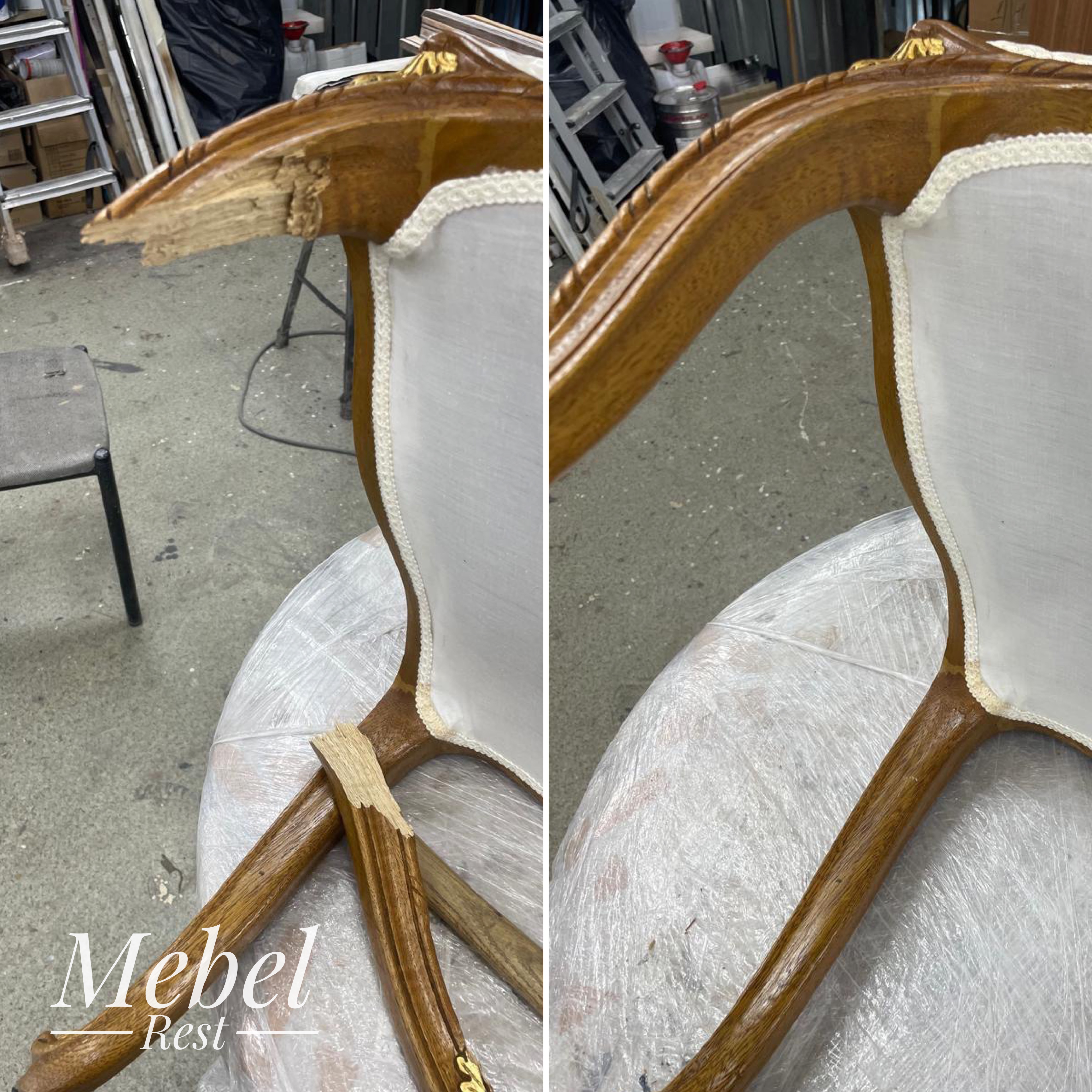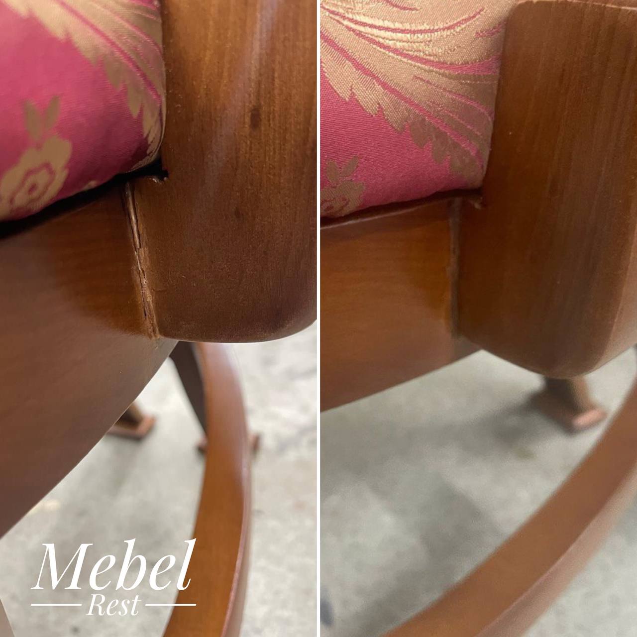 При неудачном падении у данного стула лопнул подлокотник. Ситуацию с восстановлением предмета осложнял еще и тот факт, что до этого стул уже подвергался подобного рода воздействиям, и буквально в паре миллиметров от свежего разлома была обнаружена старая, плохо отреставрированная трещина.