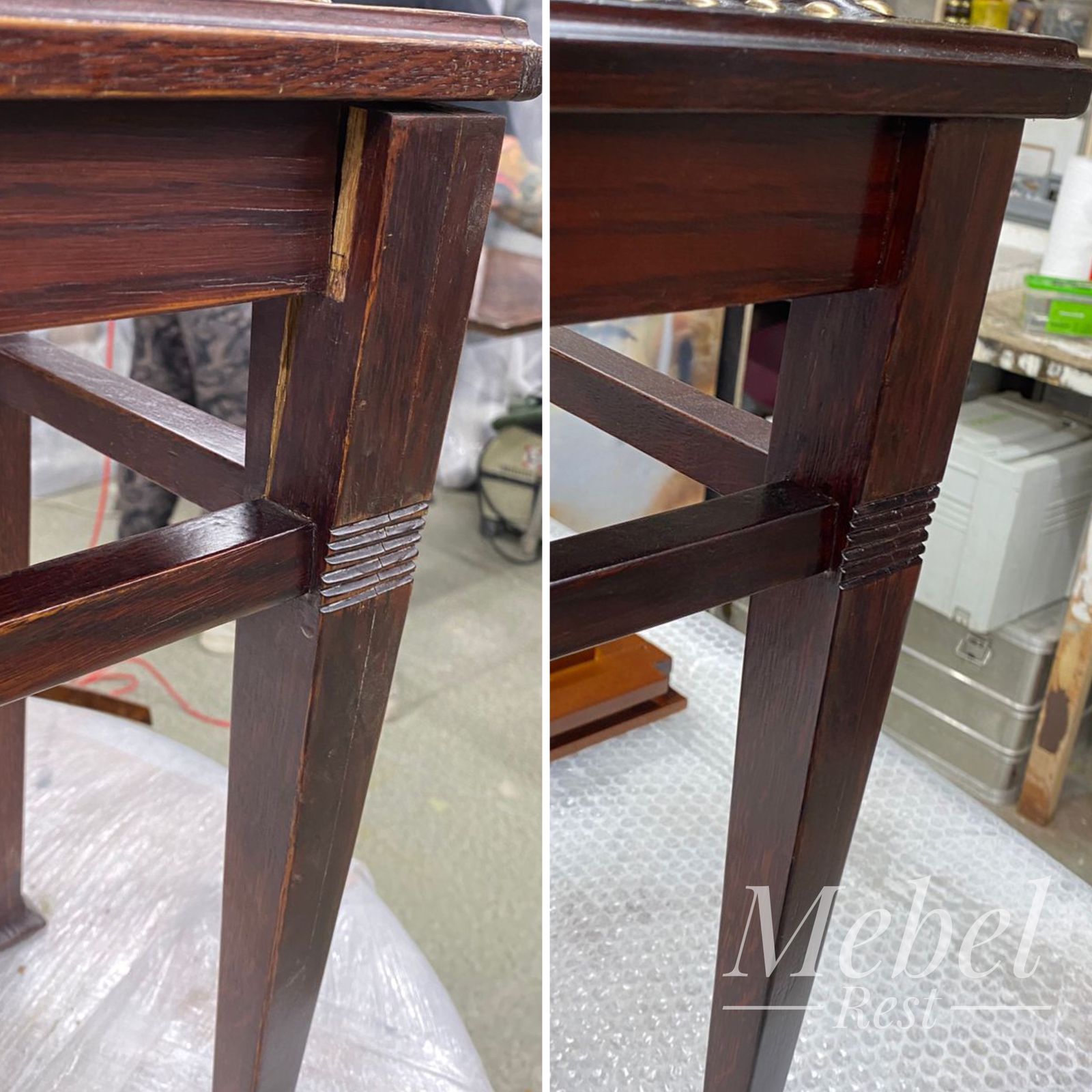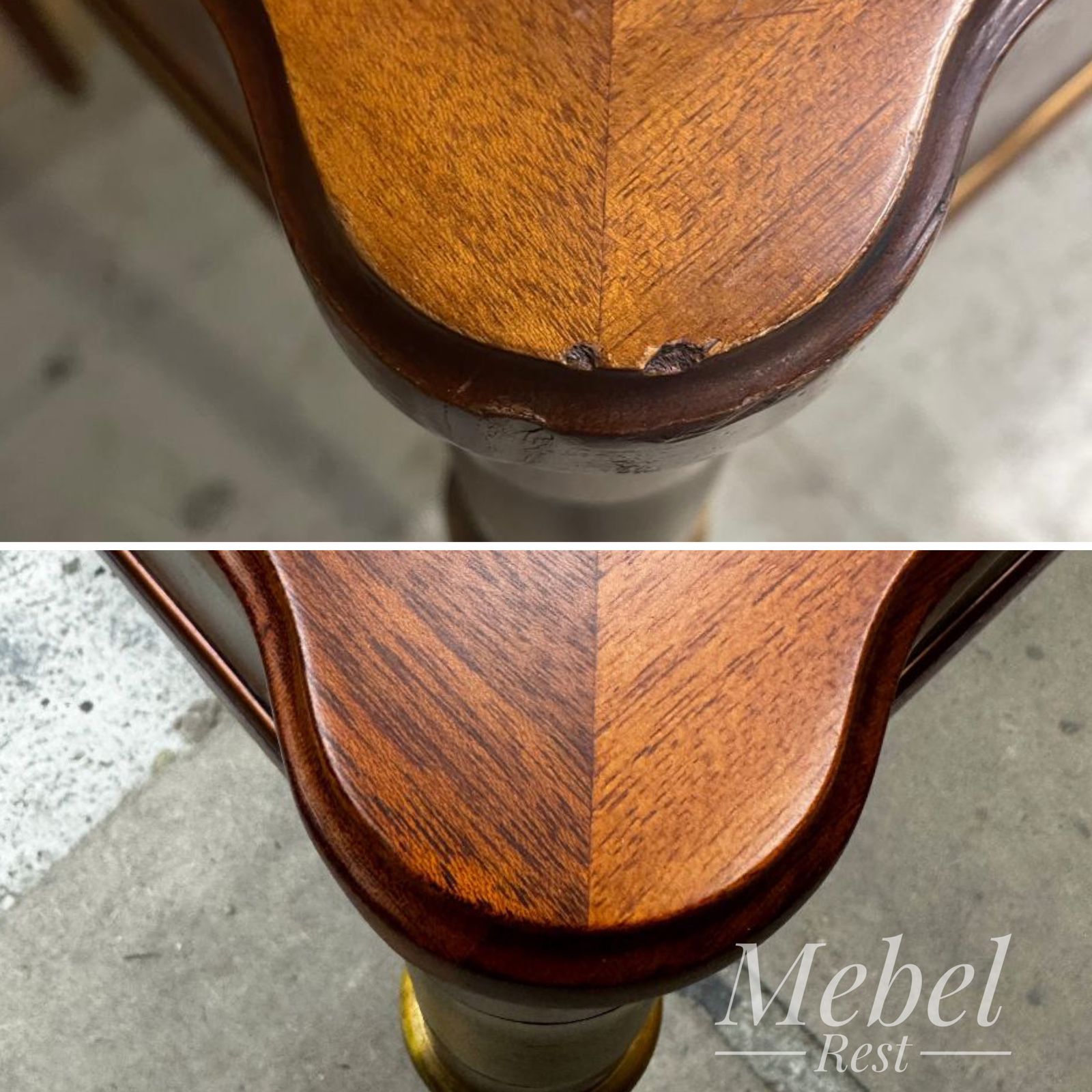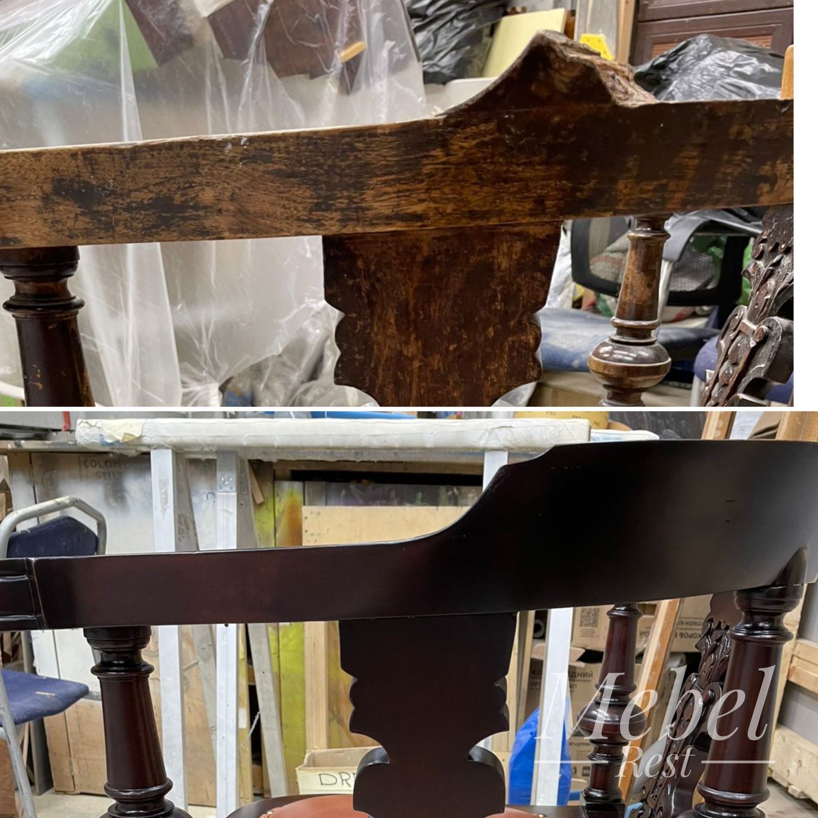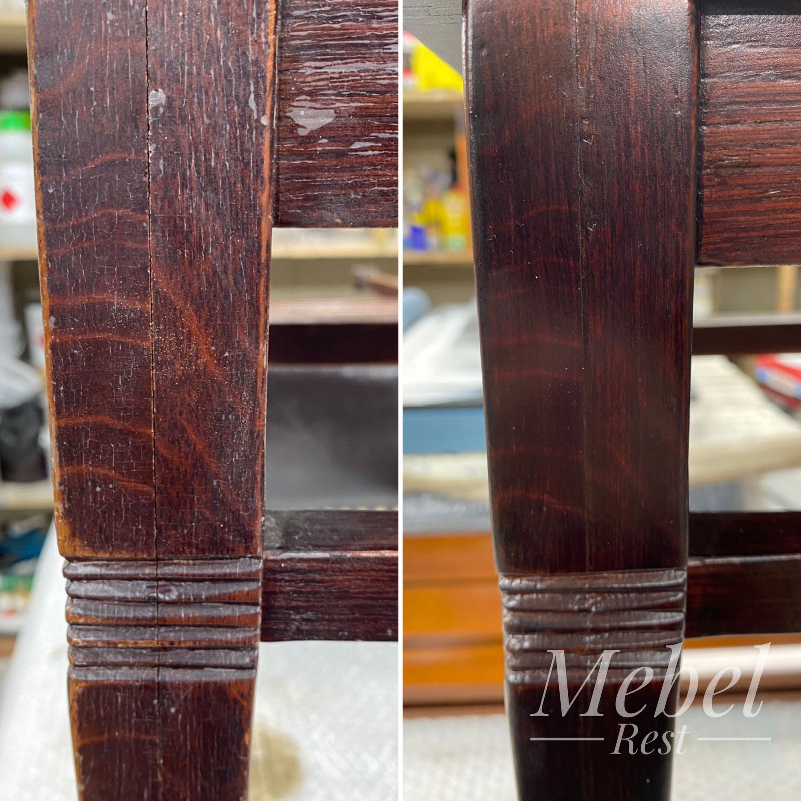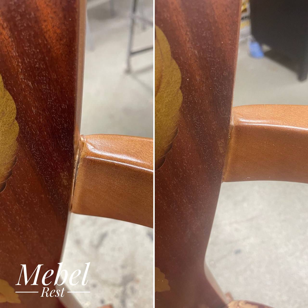 На второй день уже укрепленное место точечно было запаяно реставрационным воском, и подбирался тон фактуры дерева. На следующем этапе место реставрации было покрыто матовым водным лаком. На третий и четвертый день то же самое проделали с другим местом слома. Из-за предыдущего непрофессионального ремонта пришлось придать подлокотнику напряжение, чтобы свести две плоскости.