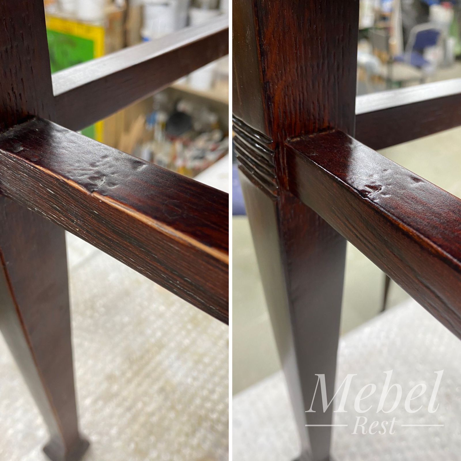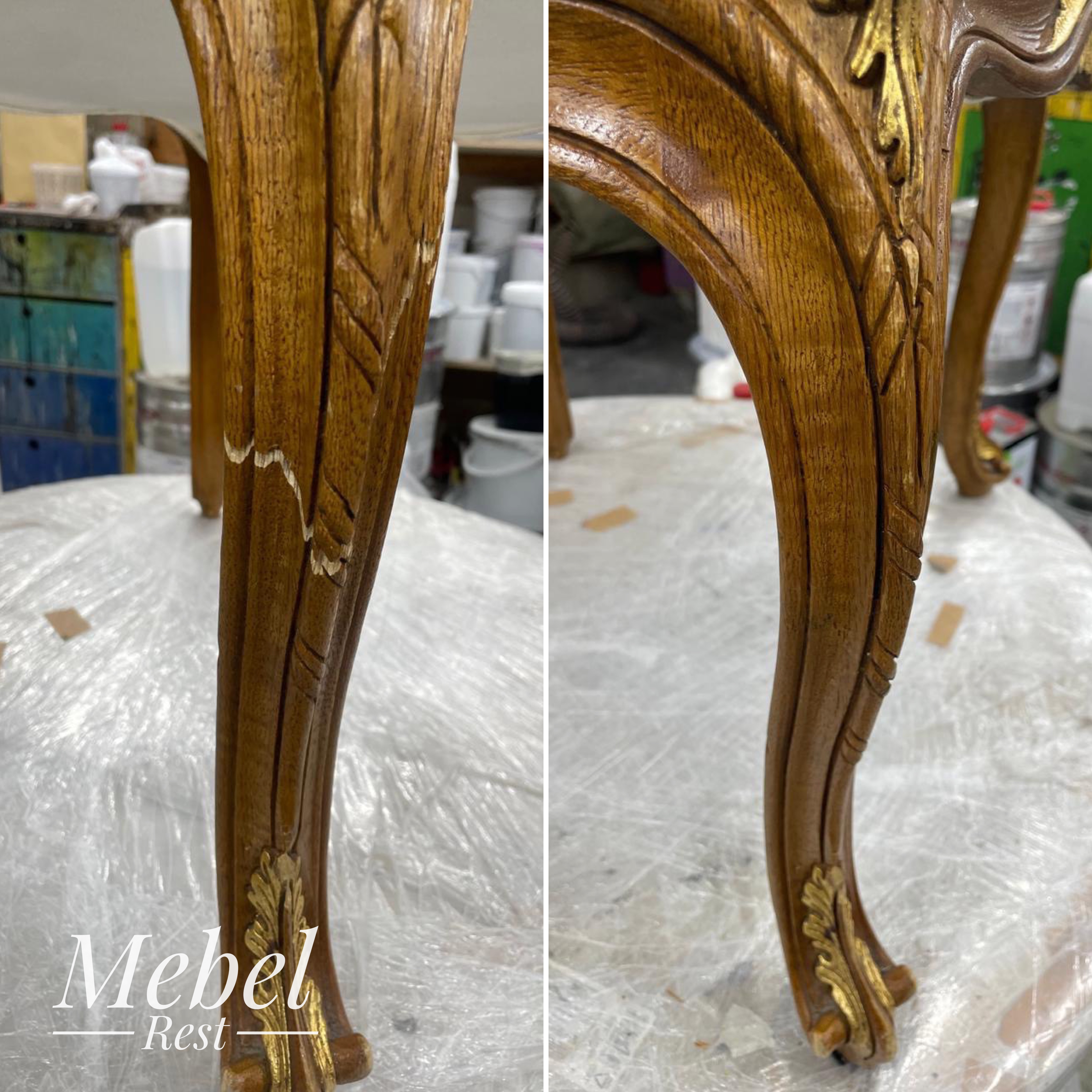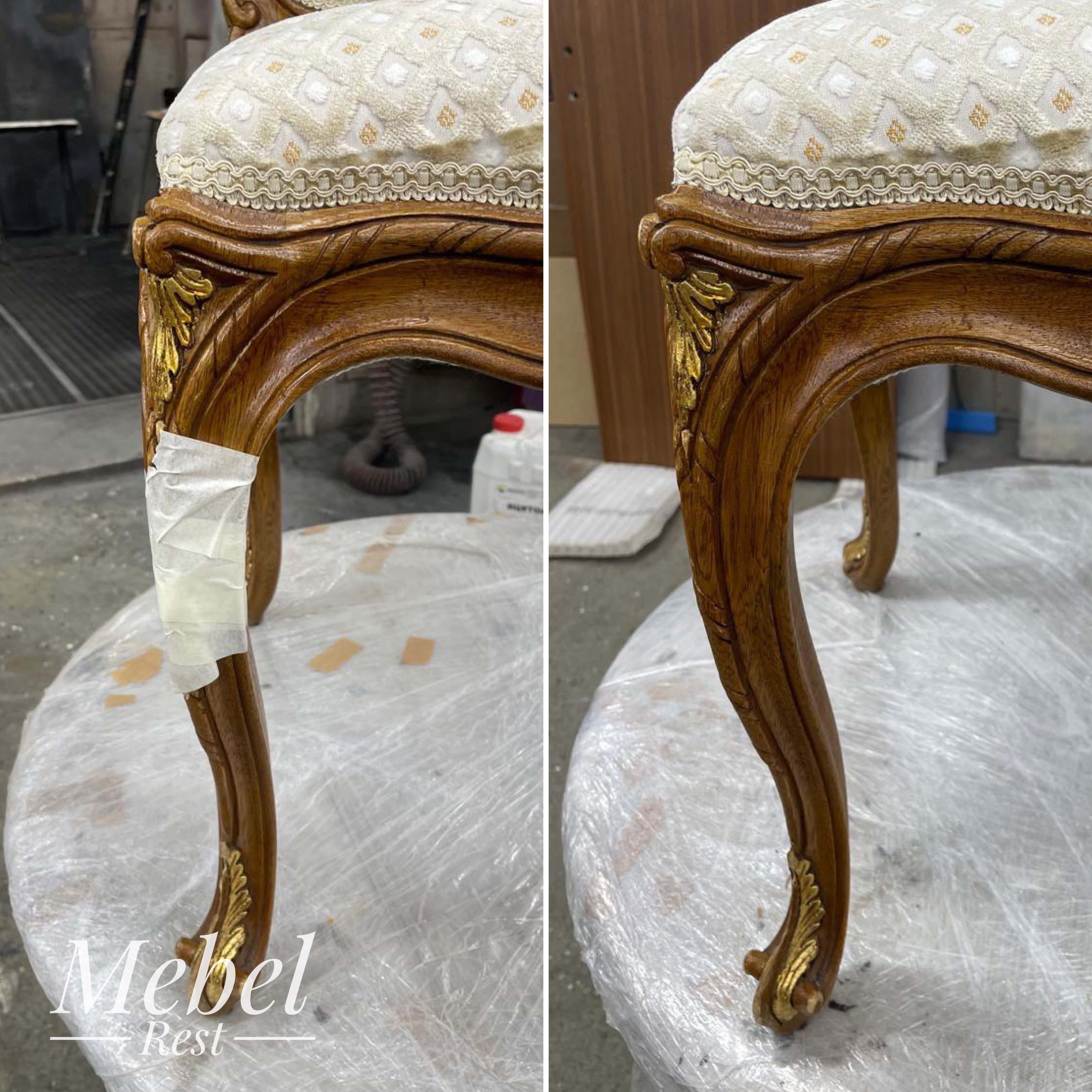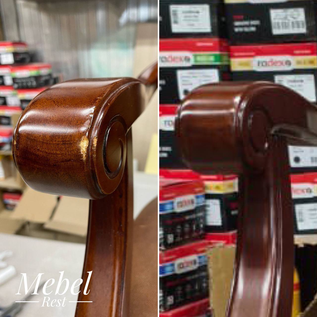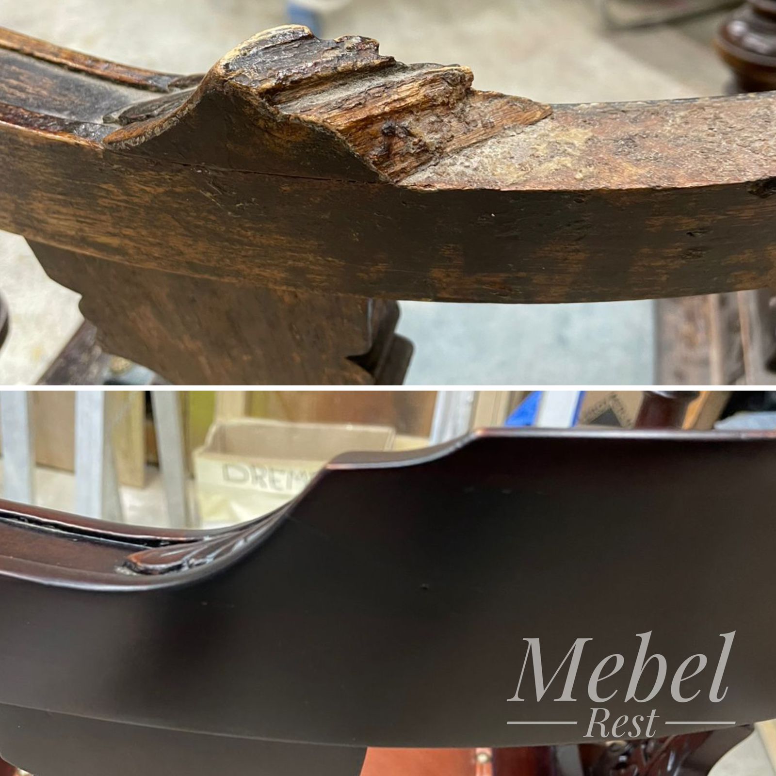 На второй день уже укрепленное место точечно было запаяно реставрационным воском, и подбирался тон фактуры дерева. На следующем этапе место реставрации было покрыто матовым водным лаком. На третий и четвертый день то же самое проделали с другим местом слома. Из-за предыдущего непрофессионального ремонта пришлось придать подлокотнику напряжение, чтобы свести две плоскости.