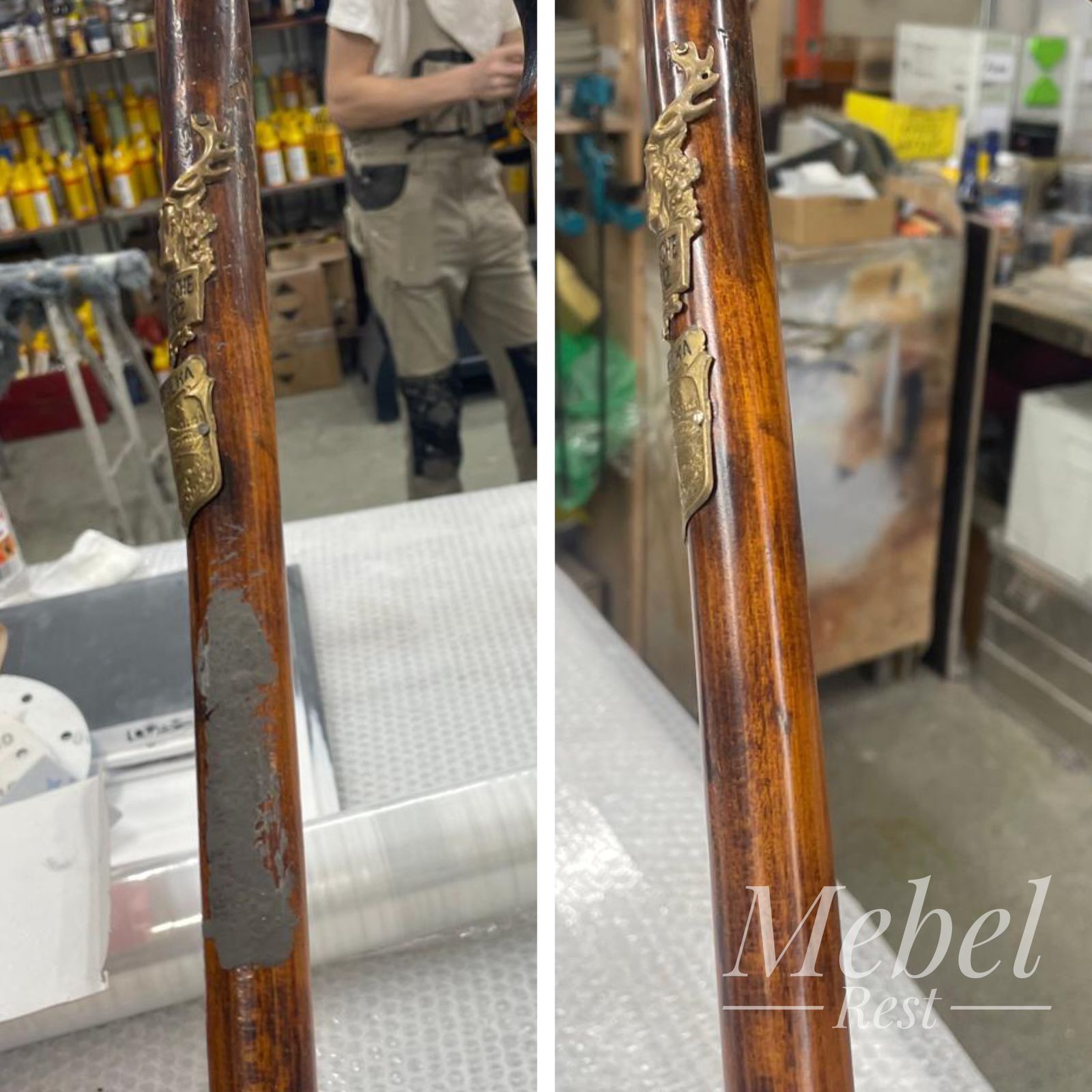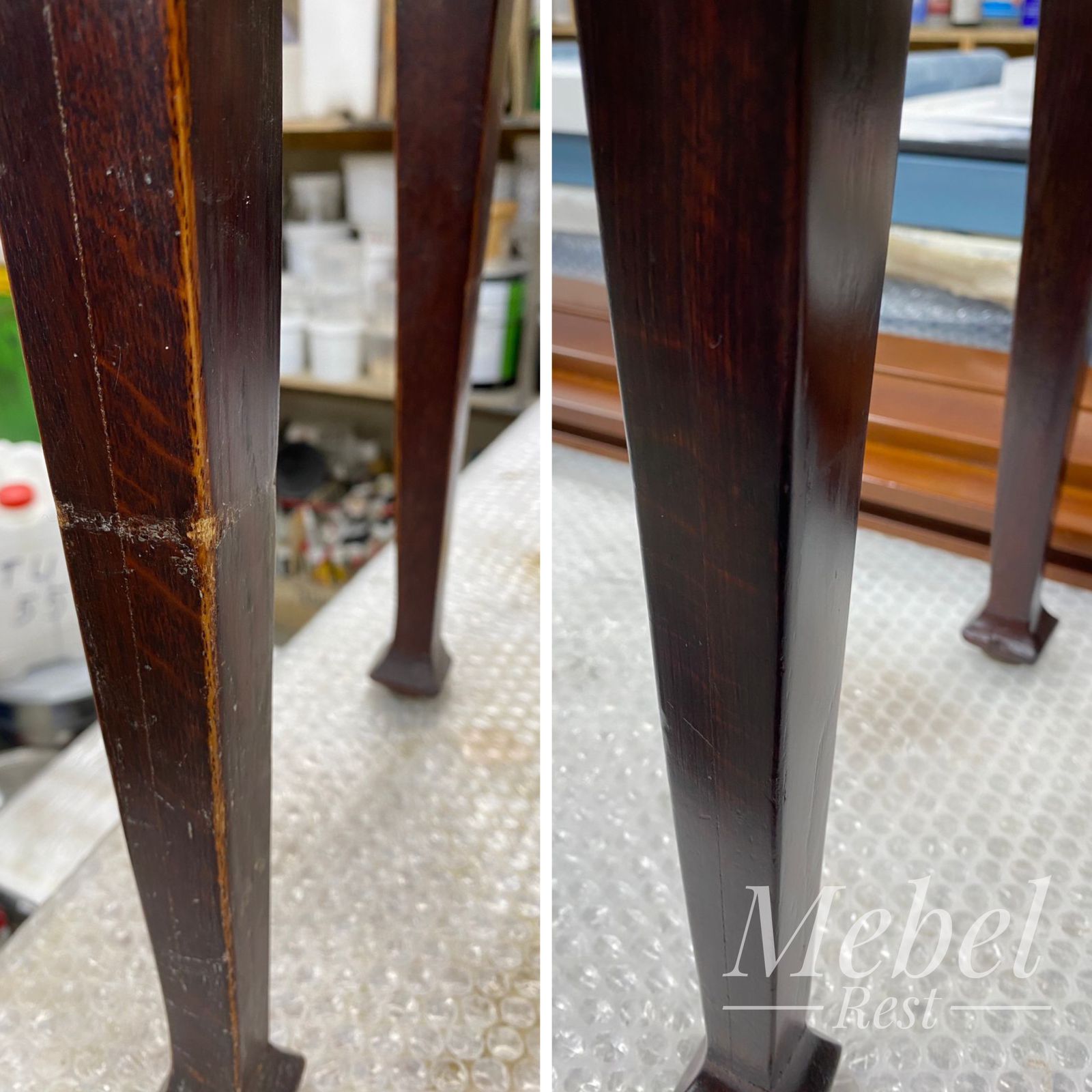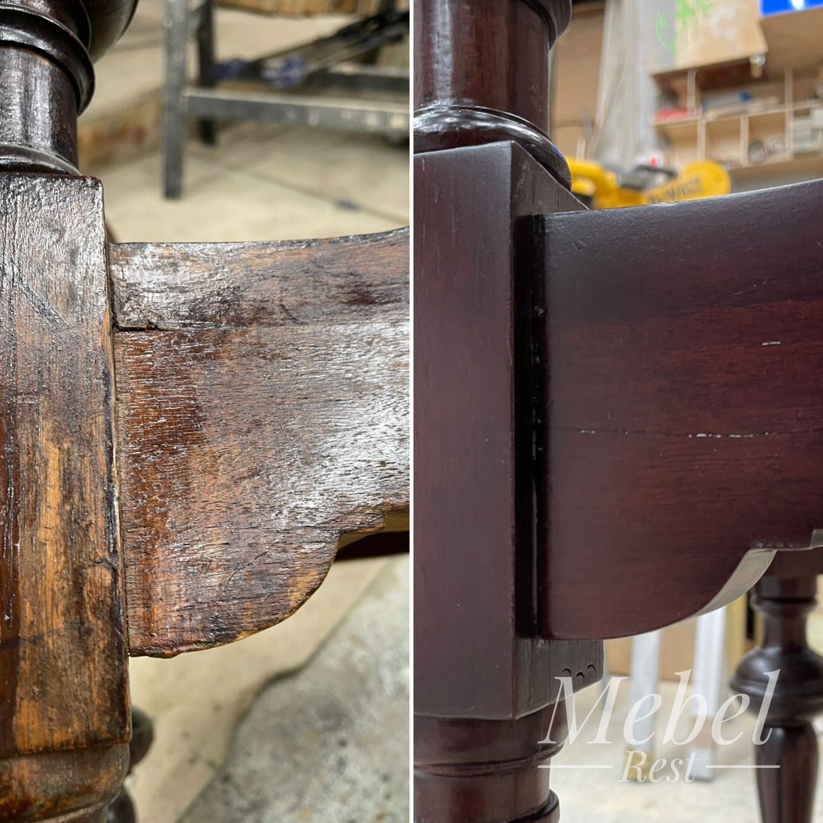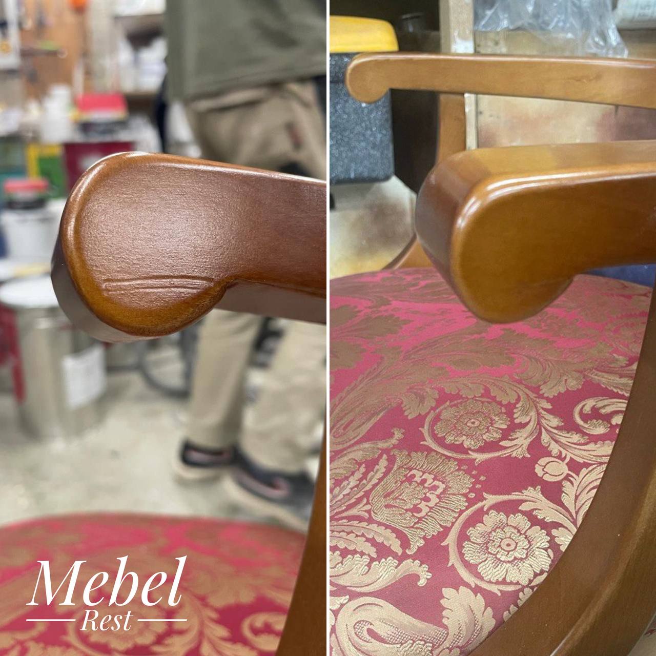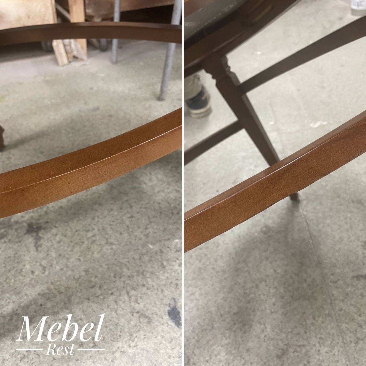 На второй день уже укрепленное место точечно было запаяно реставрационным воском, и подбирался тон фактуры дерева. На следующем этапе место реставрации было покрыто матовым водным лаком. На третий и четвертый день то же самое проделали с другим местом слома. Из-за предыдущего непрофессионального ремонта пришлось придать подлокотнику напряжение, чтобы свести две плоскости.
