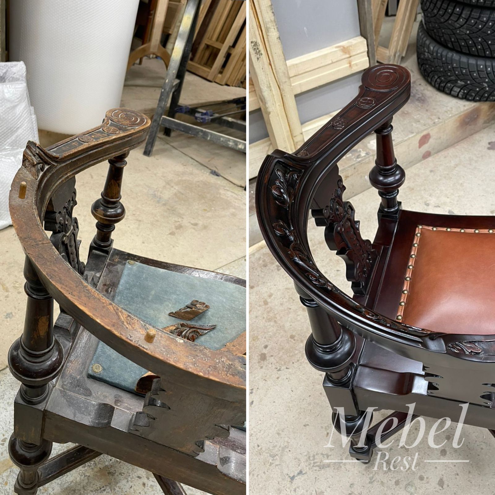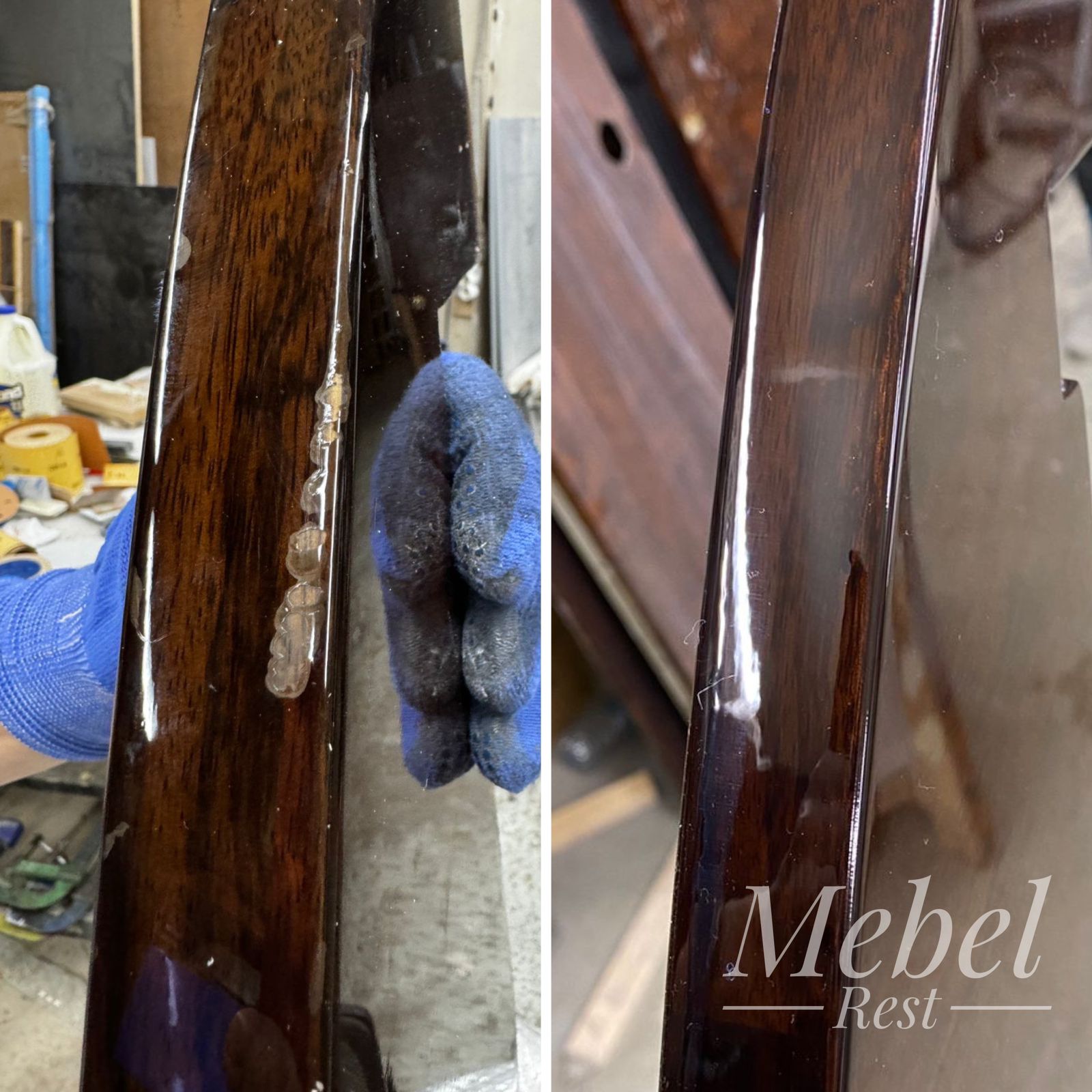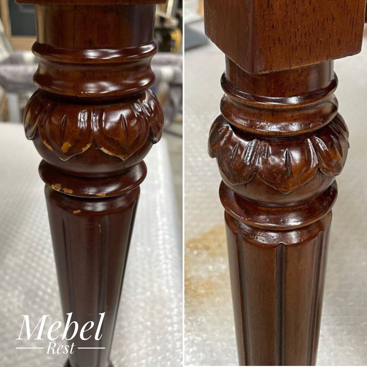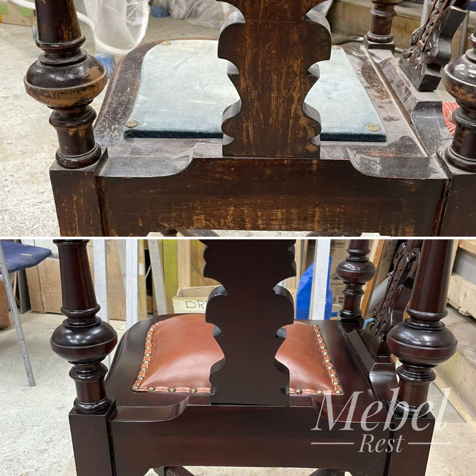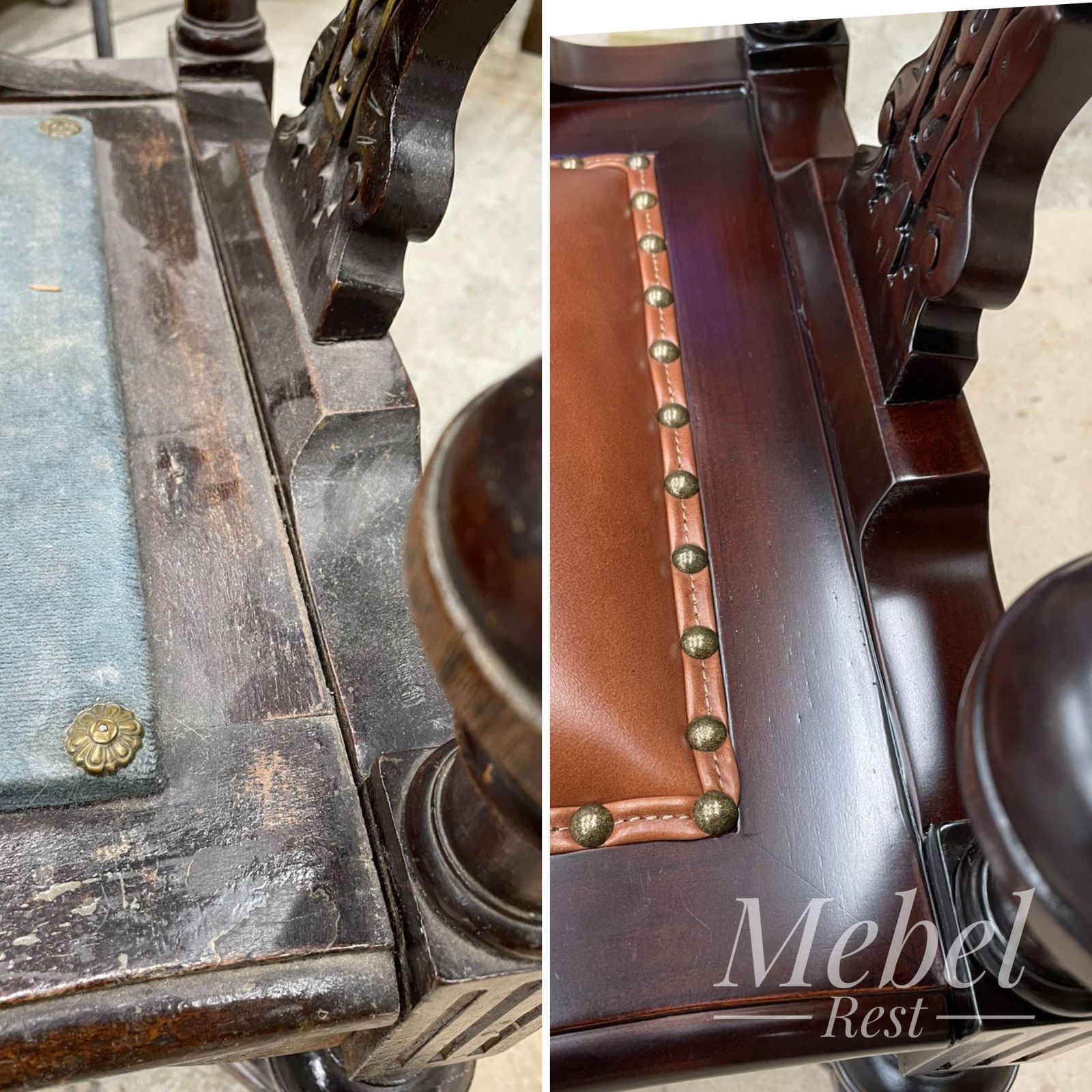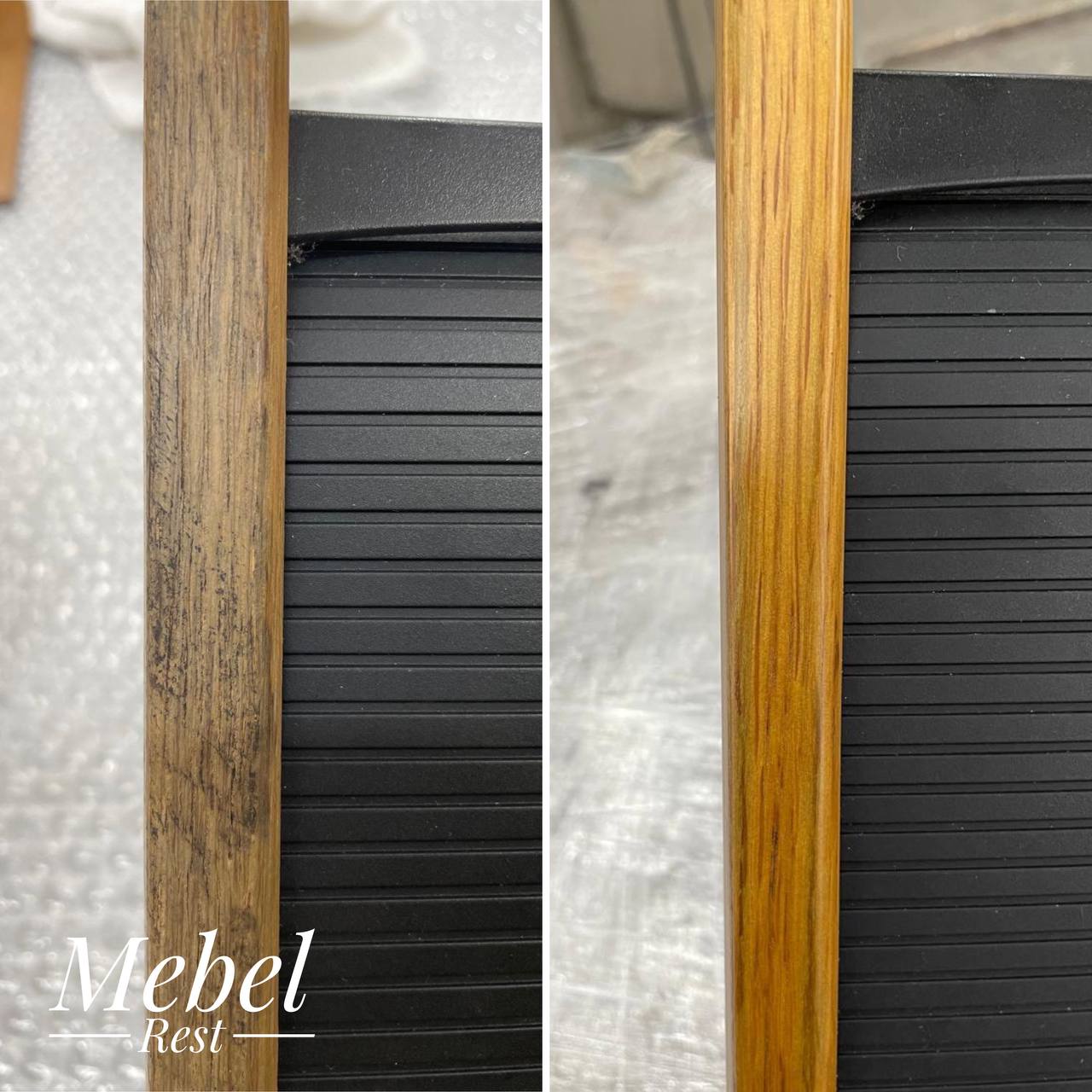 На второй день уже укрепленное место точечно было запаяно реставрационным воском, и подбирался тон фактуры дерева. На следующем этапе место реставрации было покрыто матовым водным лаком. На третий и четвертый день то же самое проделали с другим местом слома. Из-за предыдущего непрофессионального ремонта пришлось придать подлокотнику напряжение, чтобы свести две плоскости.