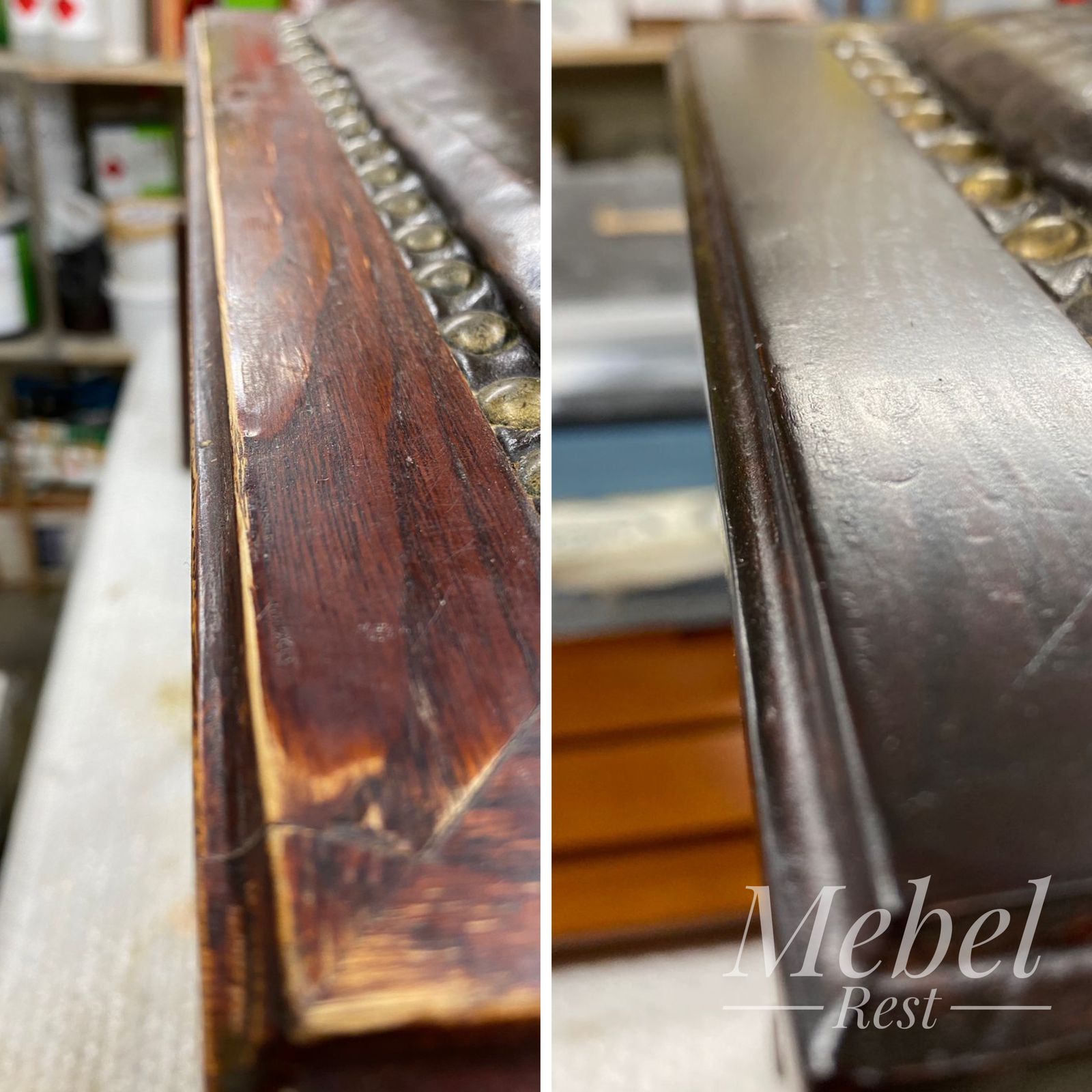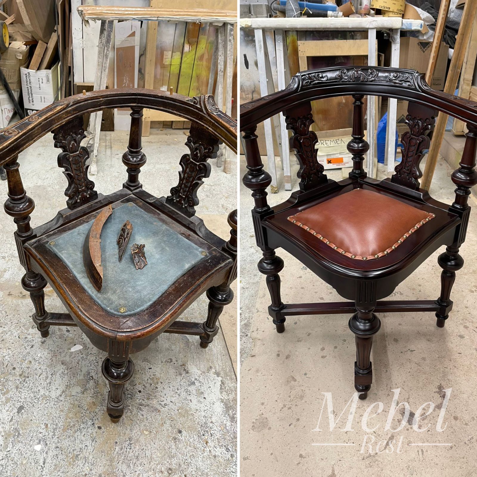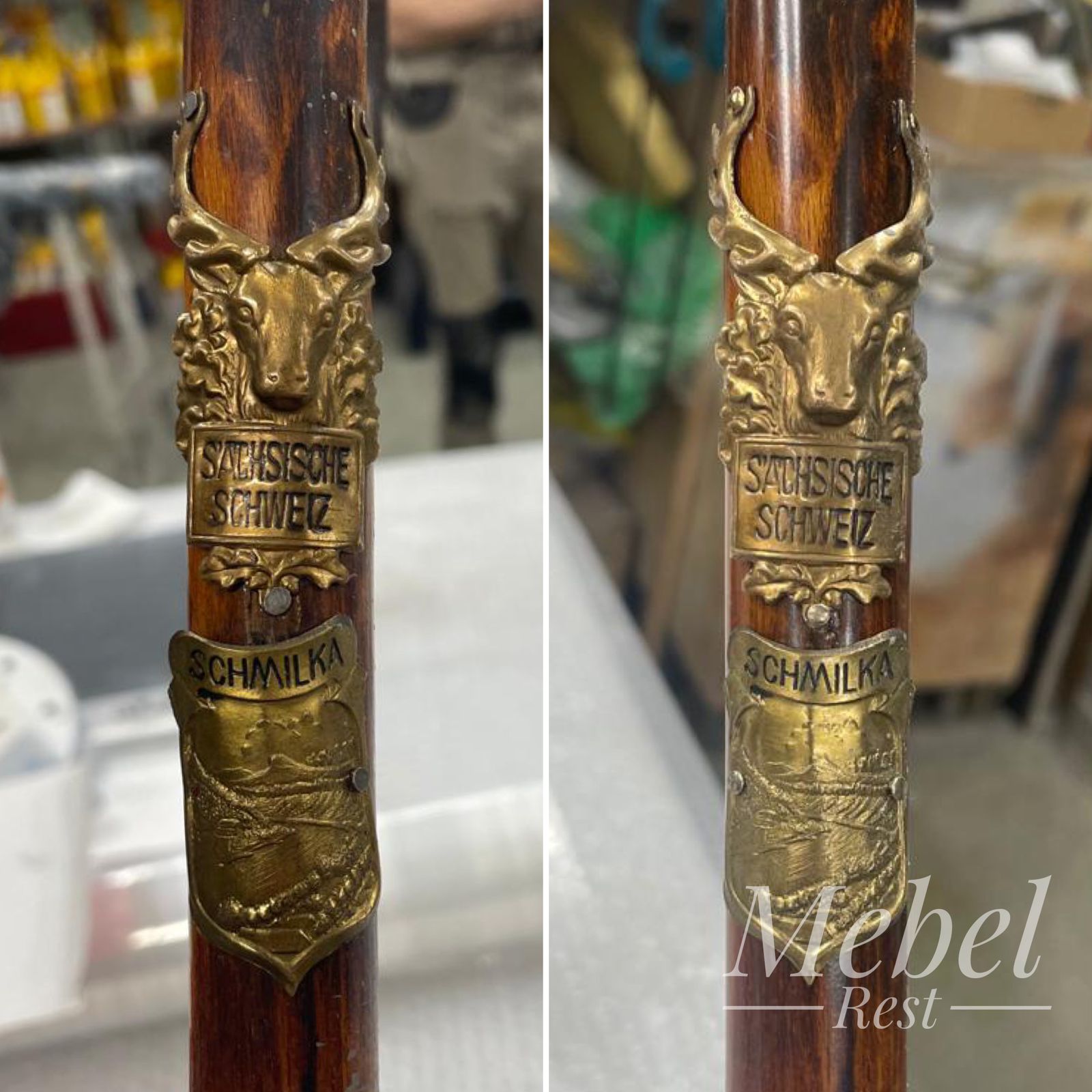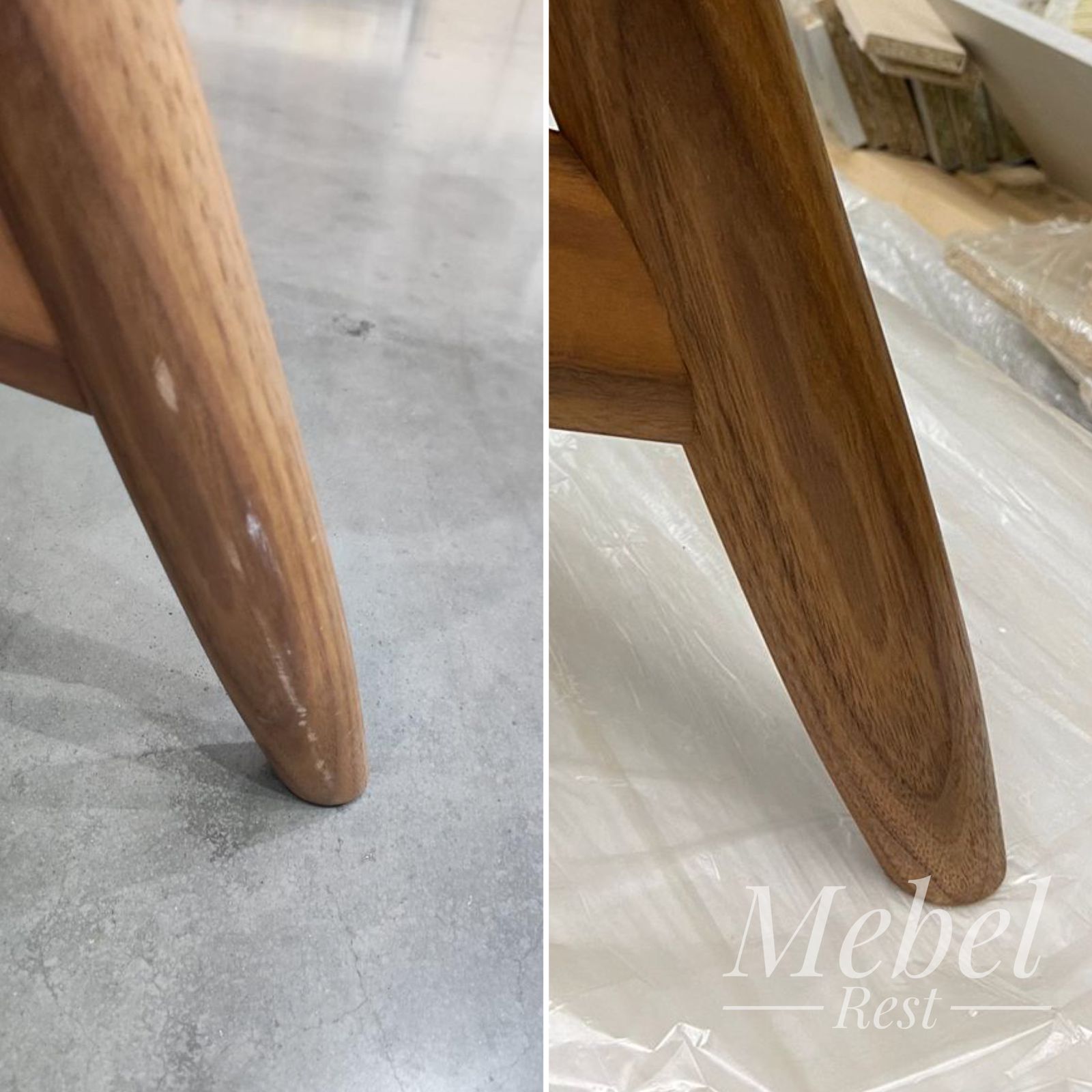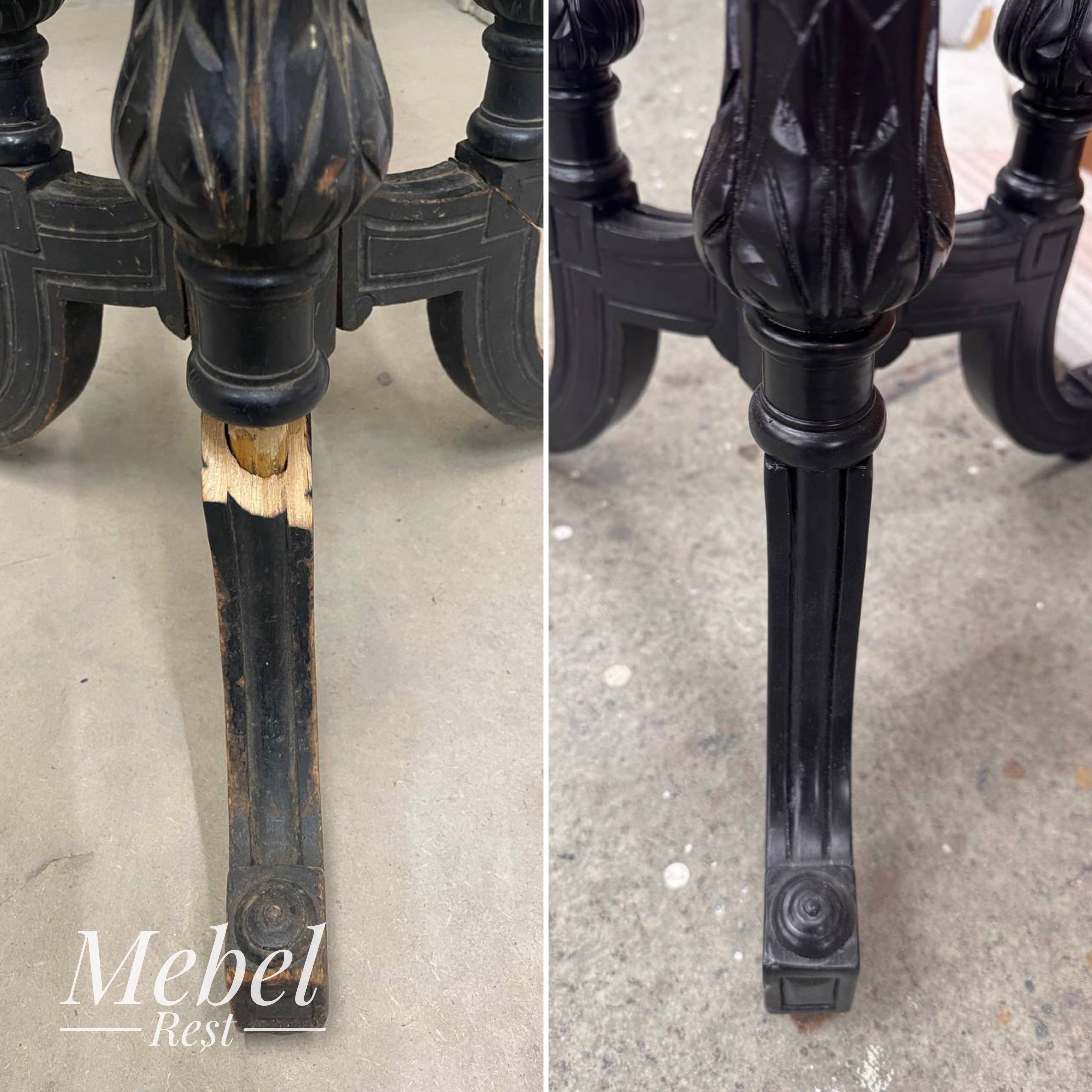 На второй день уже укрепленное место точечно было запаяно реставрационным воском, и подбирался тон фактуры дерева. На следующем этапе место реставрации было покрыто матовым водным лаком. На третий и четвертый день то же самое проделали с другим местом слома. Из-за предыдущего непрофессионального ремонта пришлось придать подлокотнику напряжение, чтобы свести две плоскости.