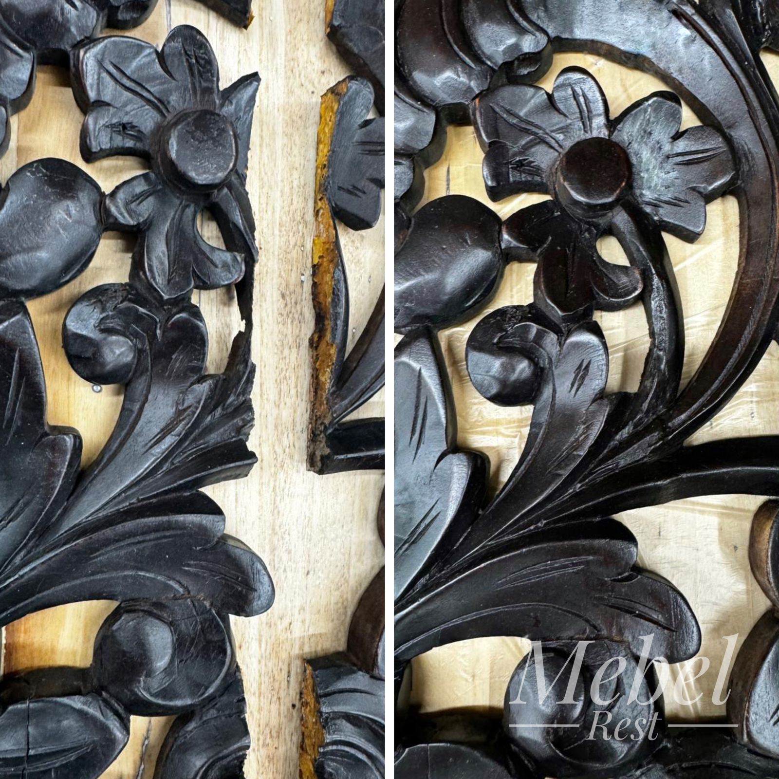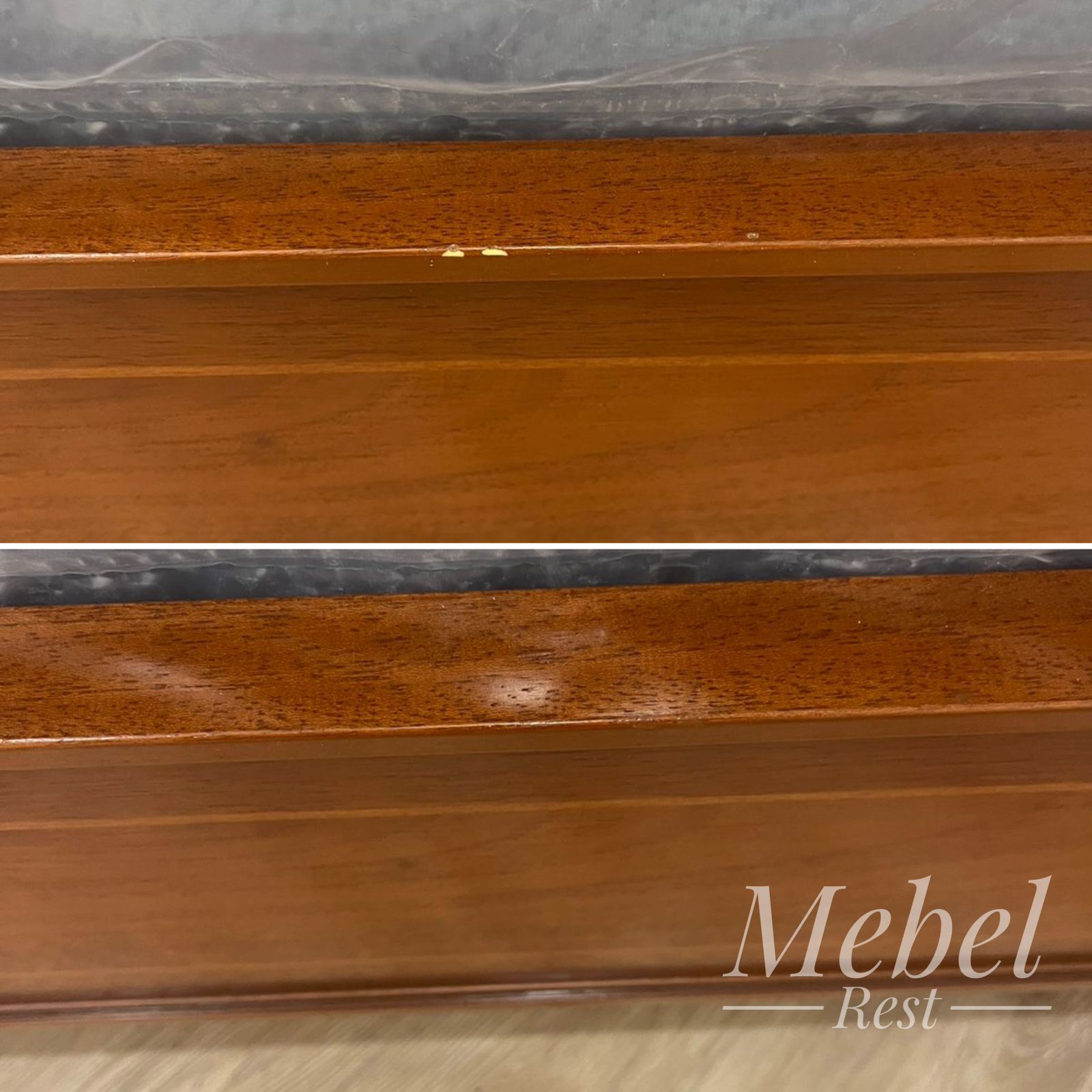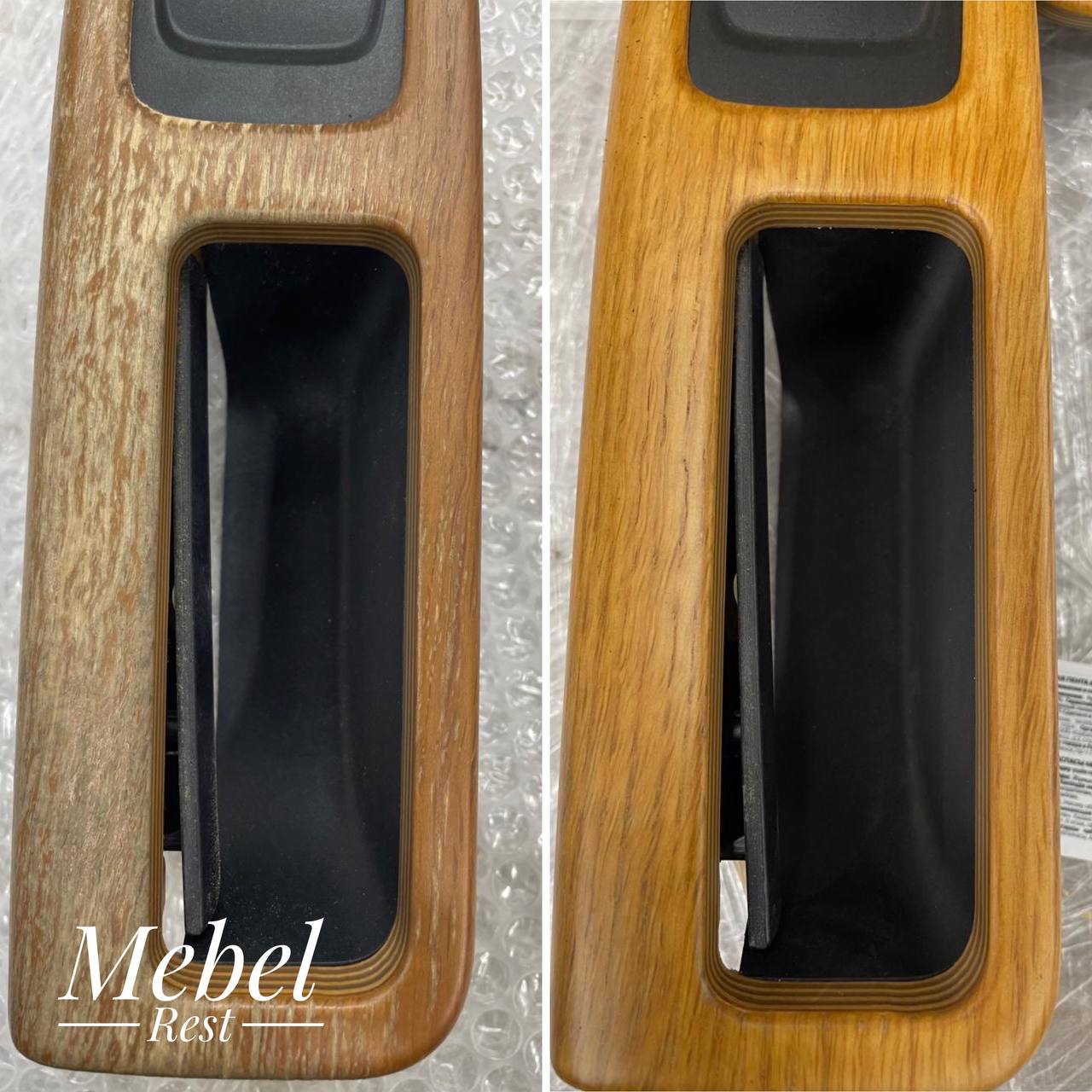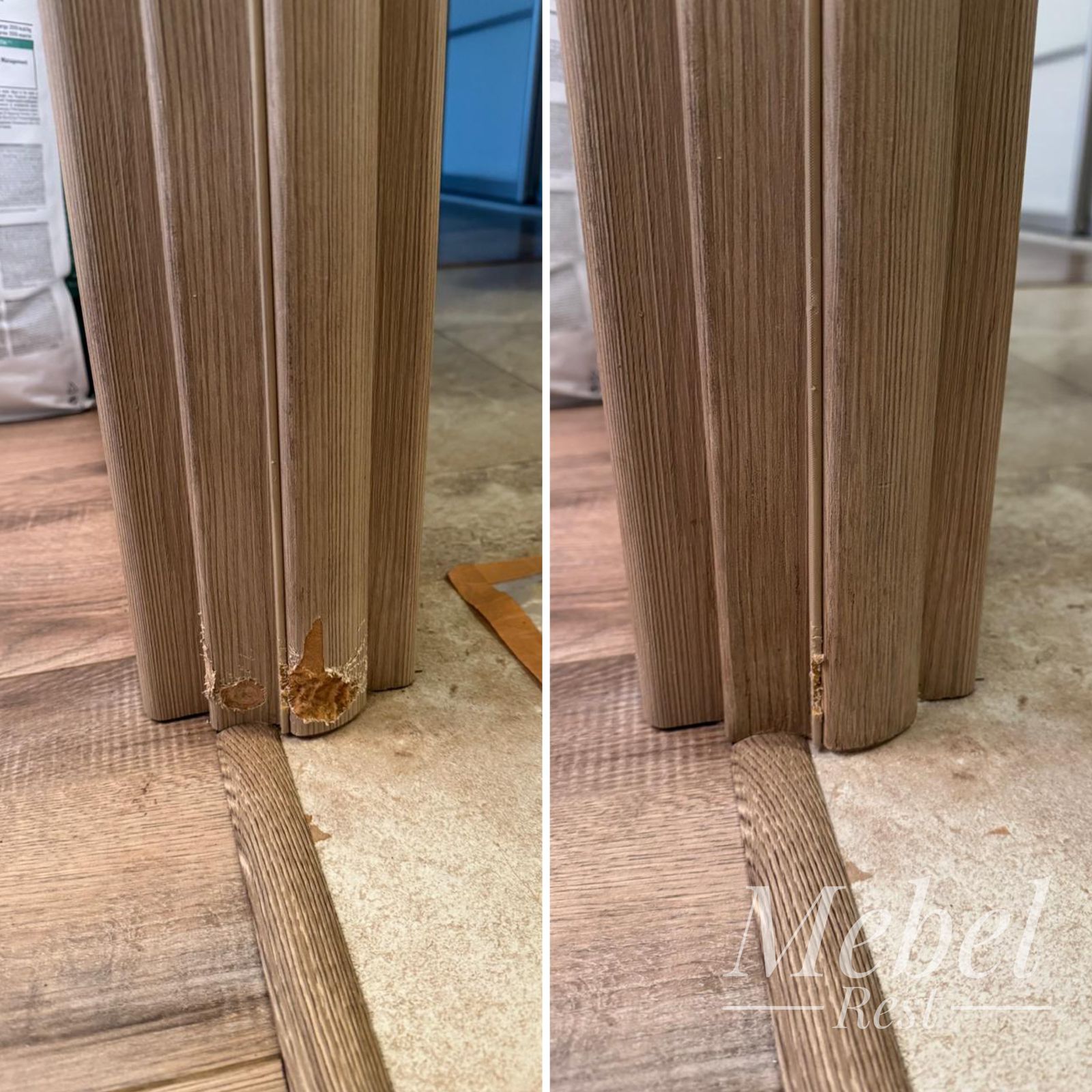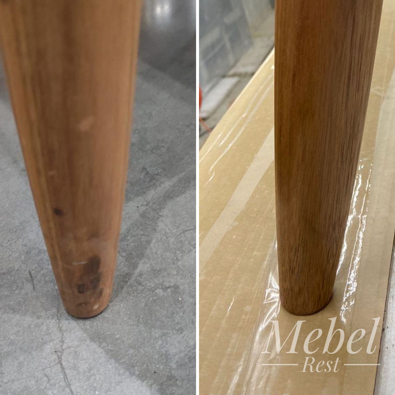 На второй день уже укрепленное место точечно было запаяно реставрационным воском, и подбирался тон фактуры дерева. На следующем этапе место реставрации было покрыто матовым водным лаком. На третий и четвертый день то же самое проделали с другим местом слома. Из-за предыдущего непрофессионального ремонта пришлось придать подлокотнику напряжение, чтобы свести две плоскости.