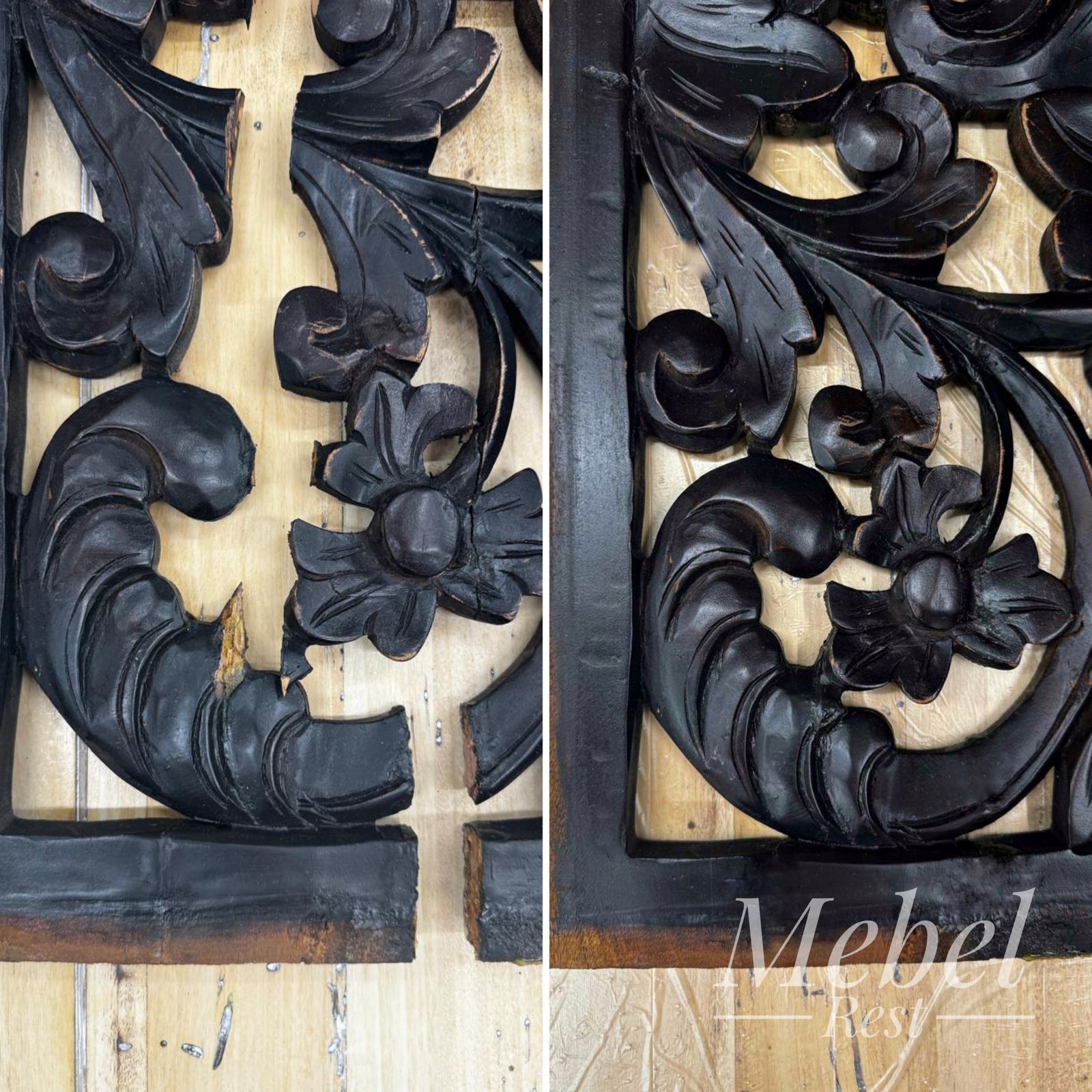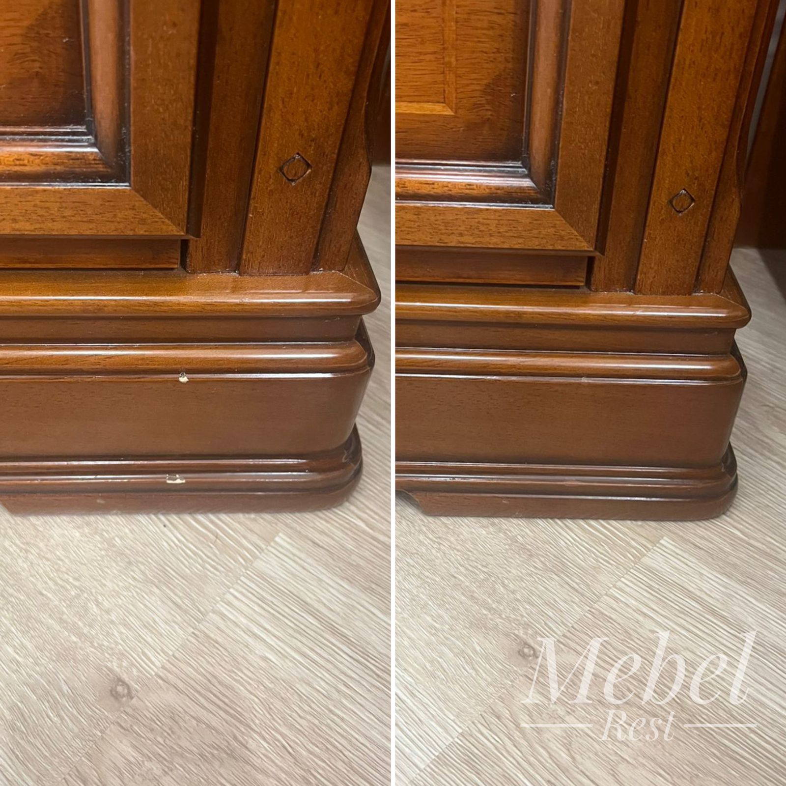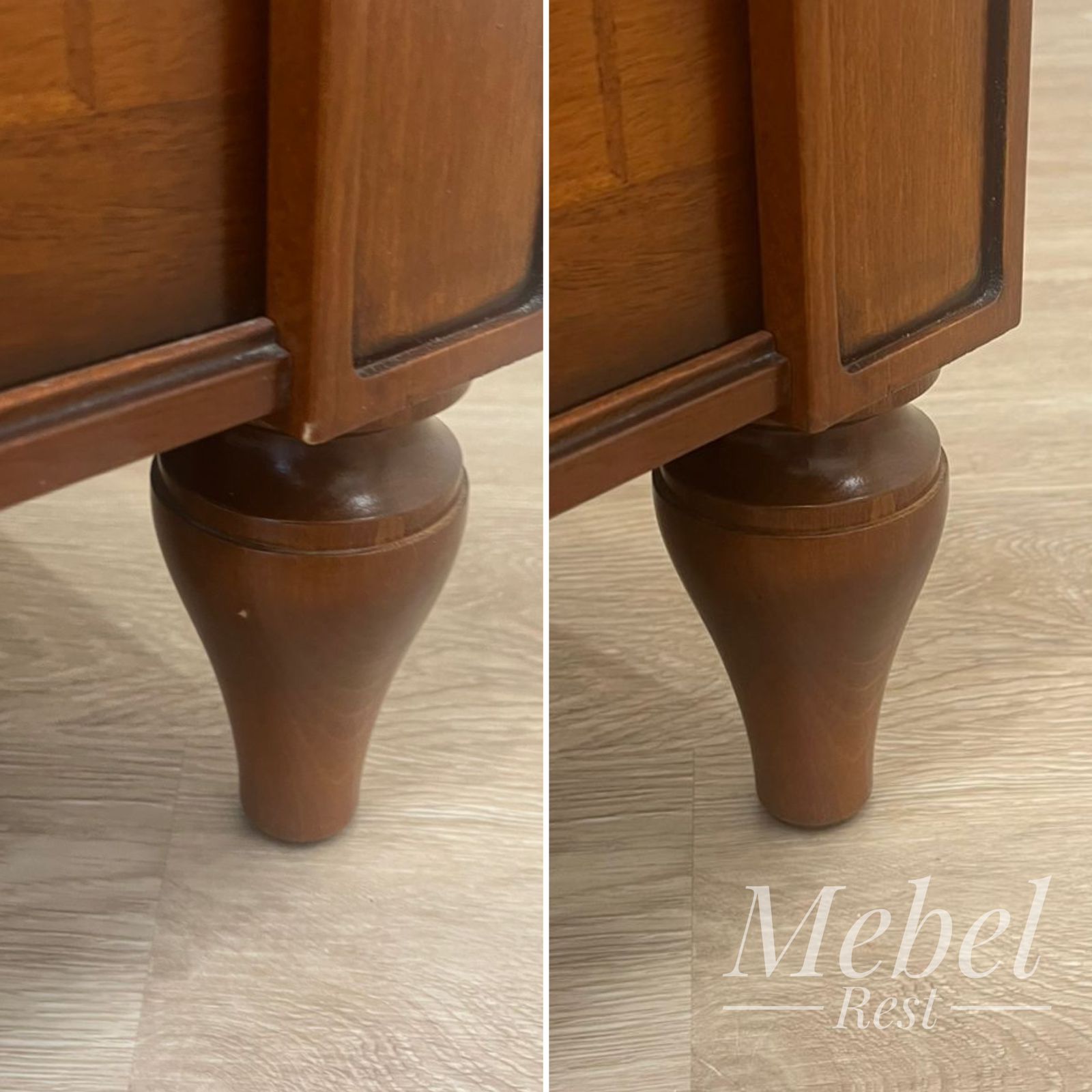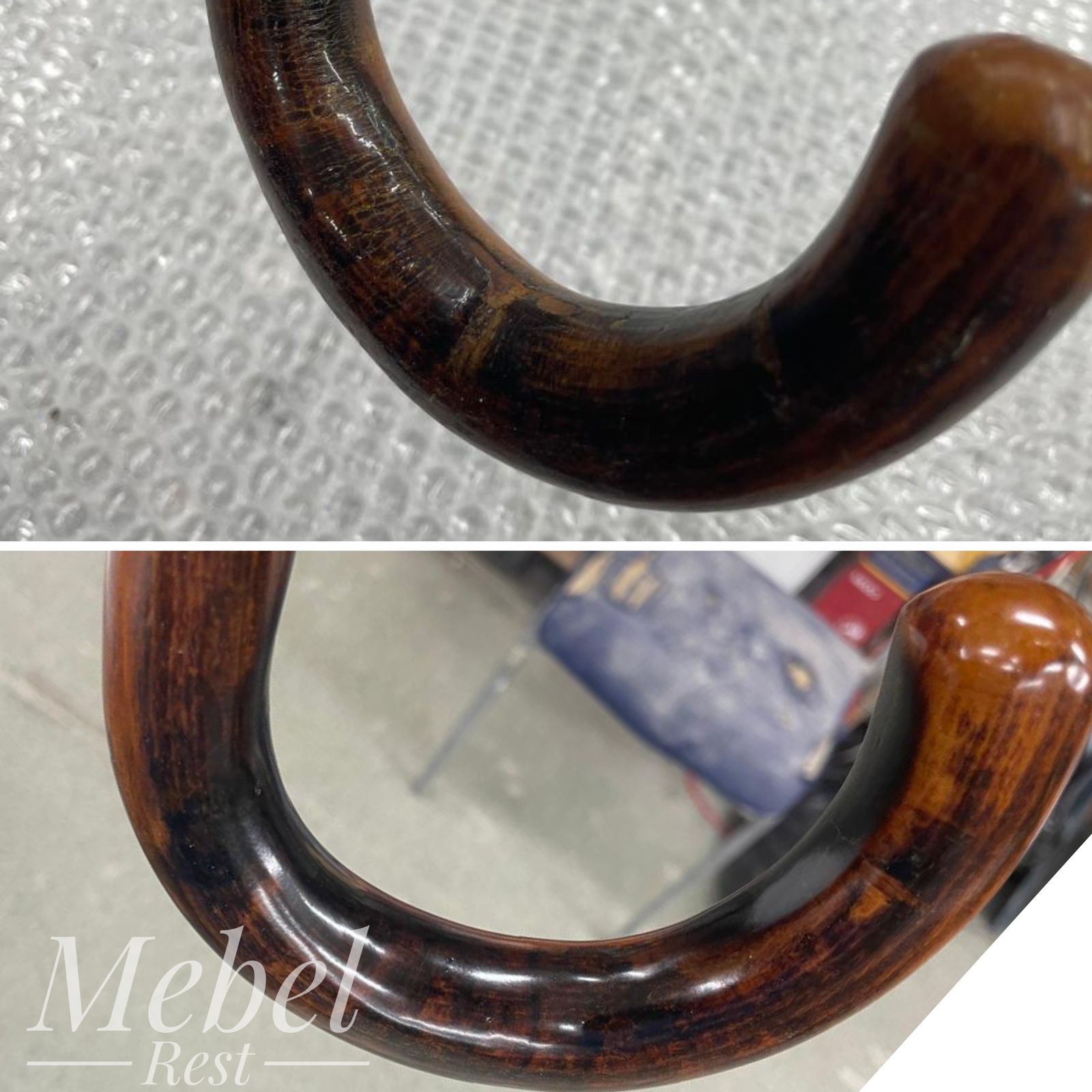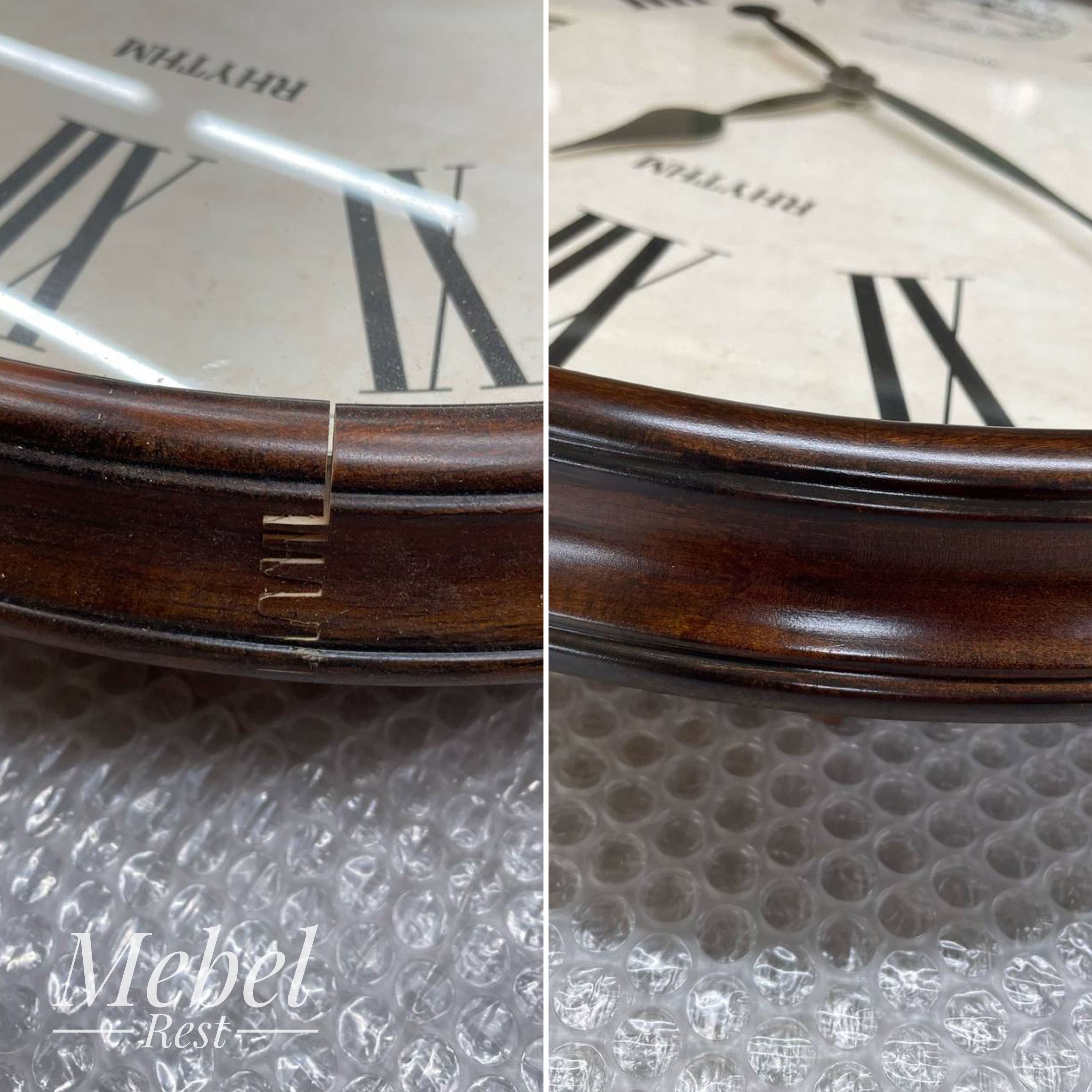 На второй день уже укрепленное место точечно было запаяно реставрационным воском, и подбирался тон фактуры дерева. На следующем этапе место реставрации было покрыто матовым водным лаком. На третий и четвертый день то же самое проделали с другим местом слома. Из-за предыдущего непрофессионального ремонта пришлось придать подлокотнику напряжение, чтобы свести две плоскости.