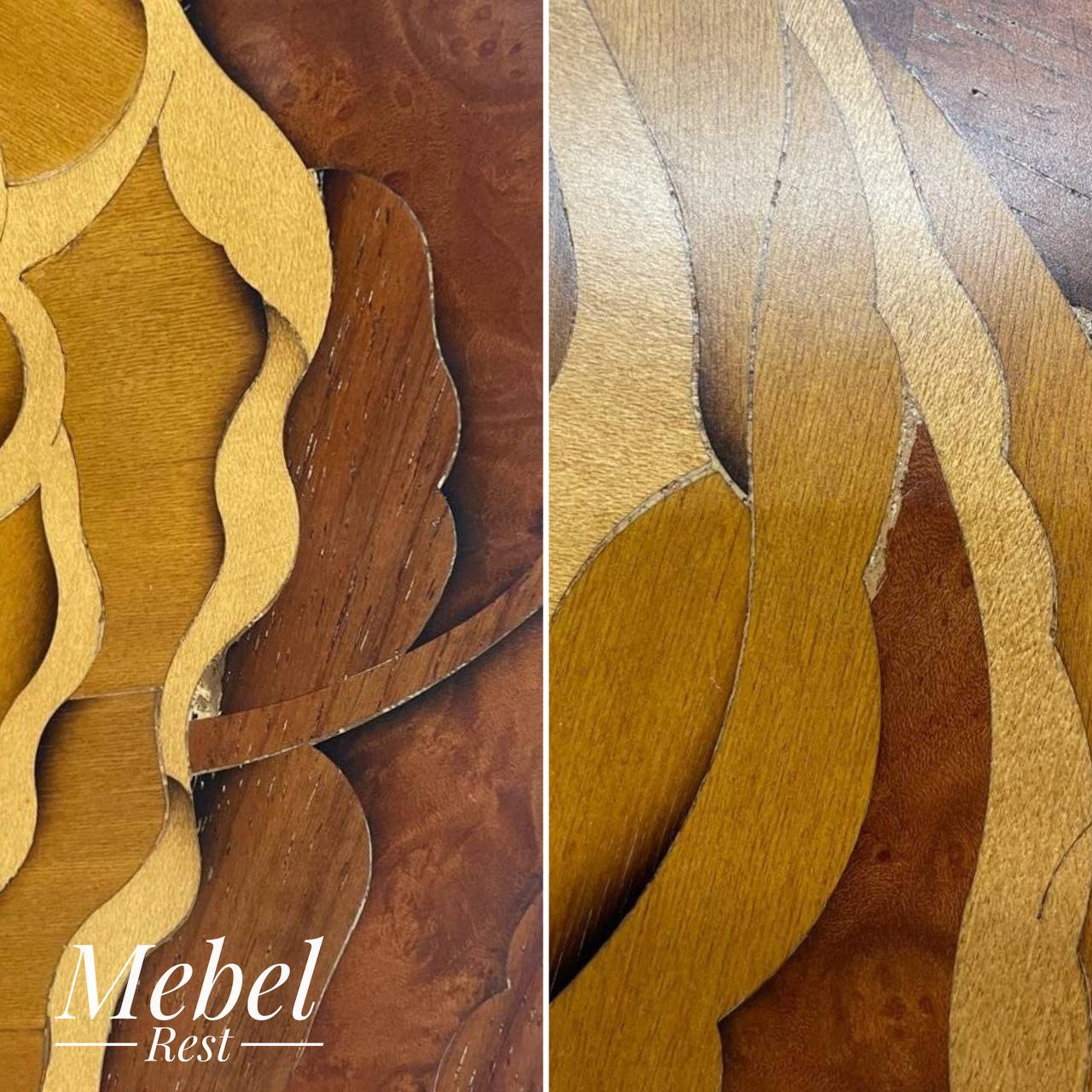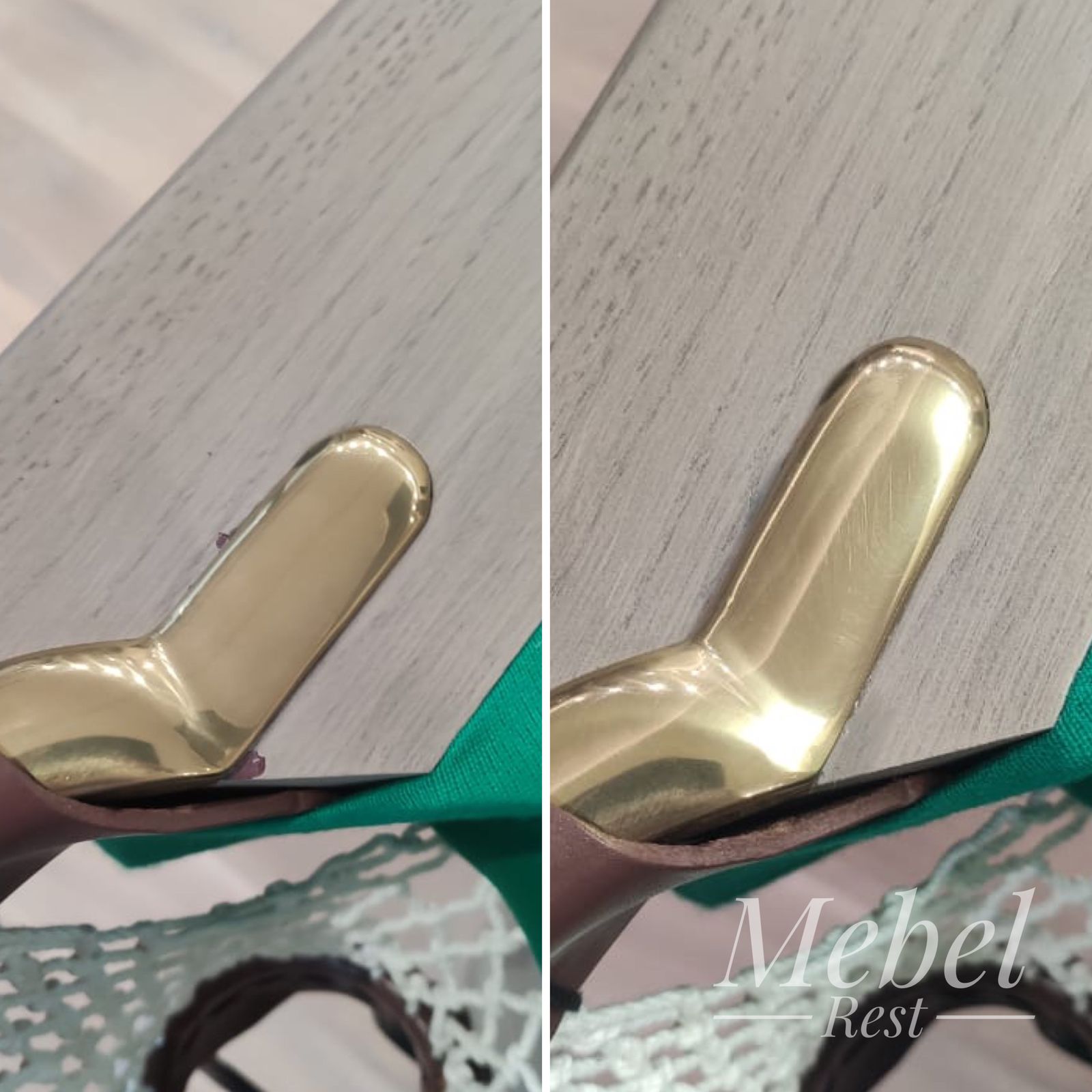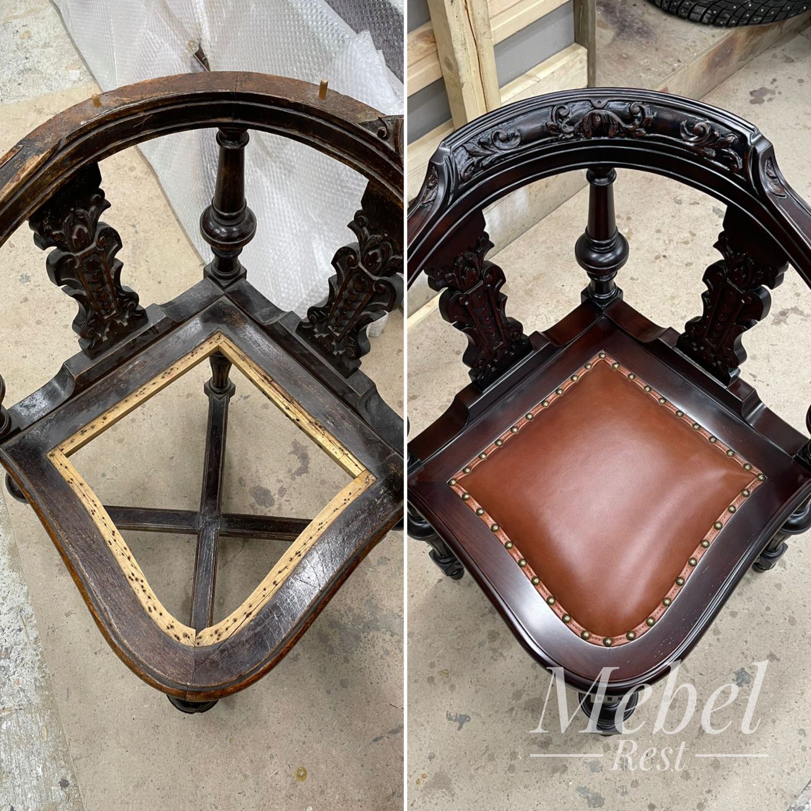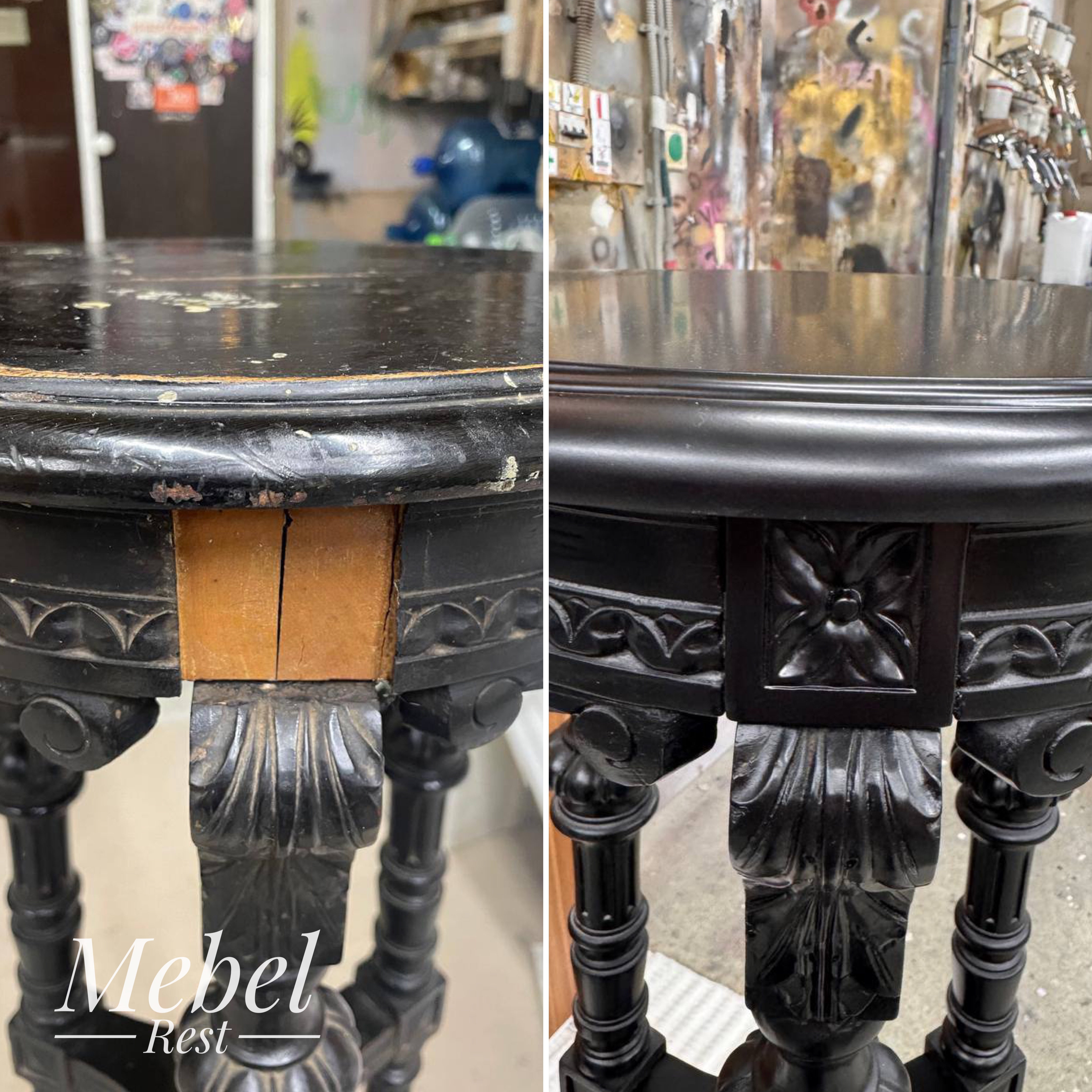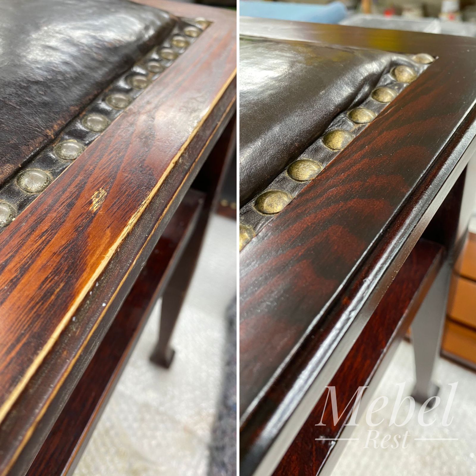 На второй день уже укрепленное место точечно было запаяно реставрационным воском, и подбирался тон фактуры дерева. На следующем этапе место реставрации было покрыто матовым водным лаком. На третий и четвертый день то же самое проделали с другим местом слома. Из-за предыдущего непрофессионального ремонта пришлось придать подлокотнику напряжение, чтобы свести две плоскости.