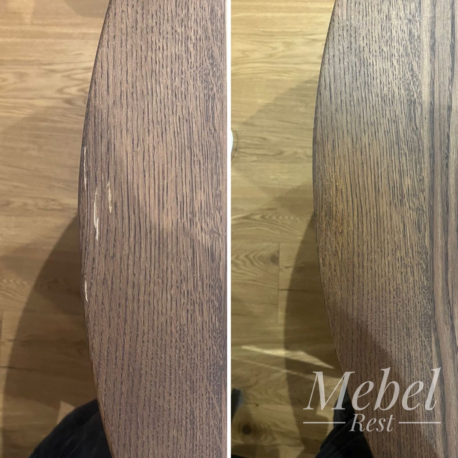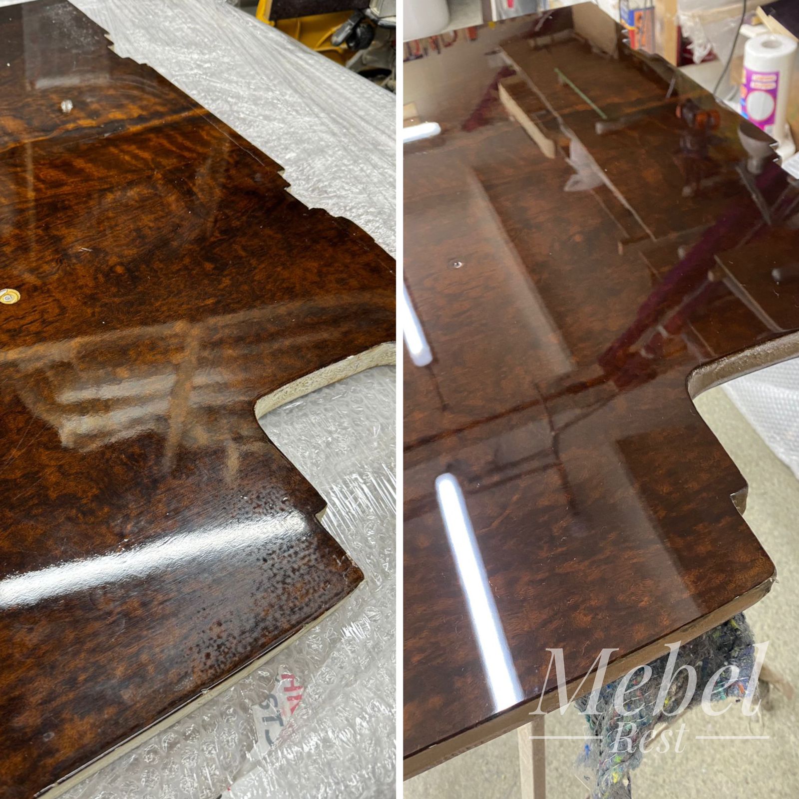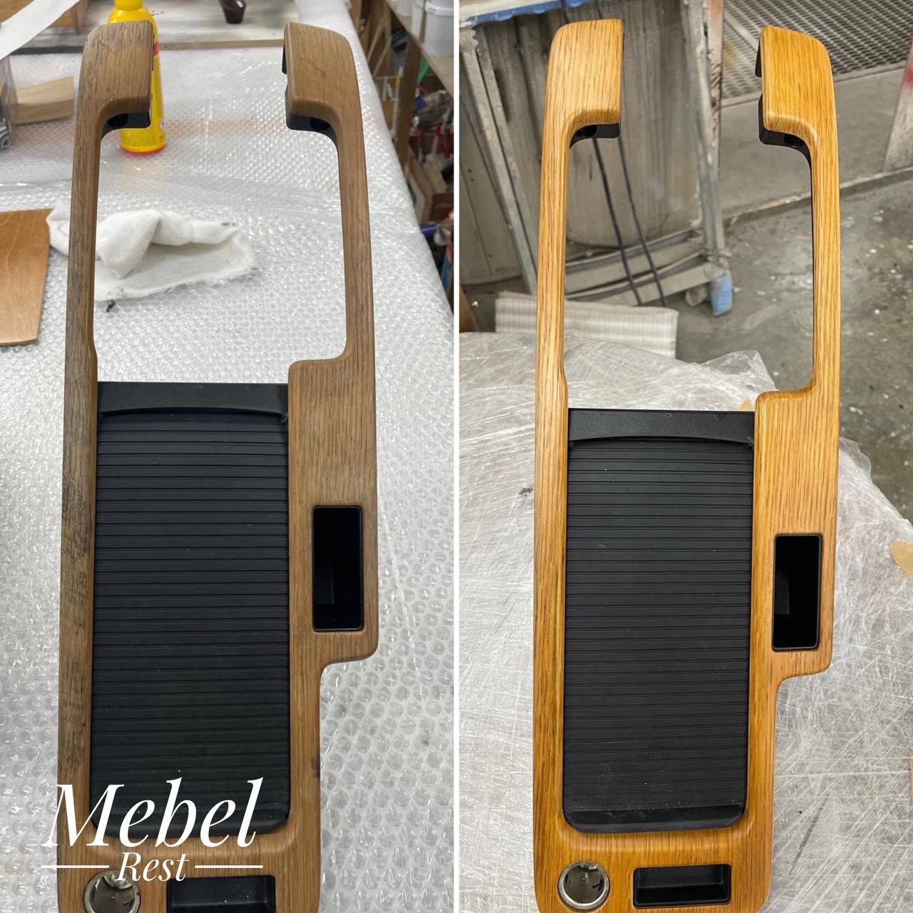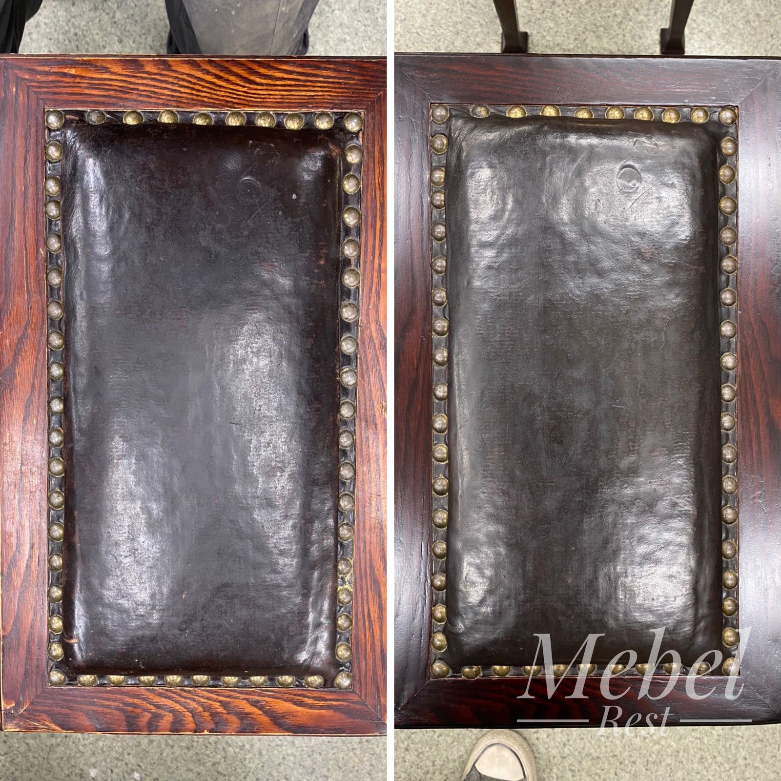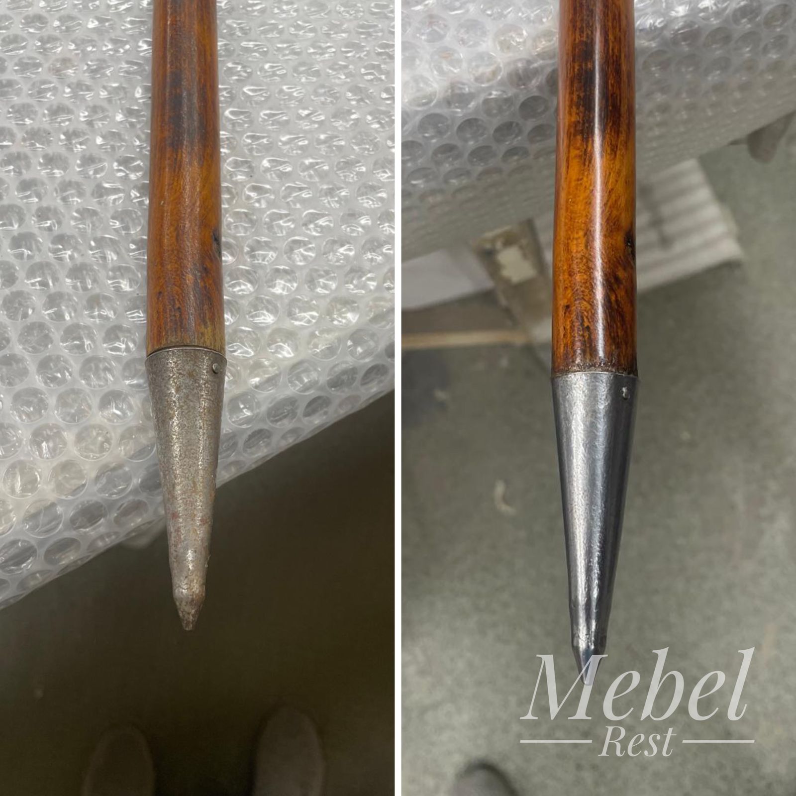На второй день уже укрепленное место точечно было запаяно реставрационным воском, и подбирался тон фактуры дерева. На следующем этапе место реставрации было покрыто матовым водным лаком. На третий и четвертый день то же самое проделали с другим местом слома. Из-за предыдущего непрофессионального ремонта пришлось придать подлокотнику напряжение, чтобы свести две плоскости.