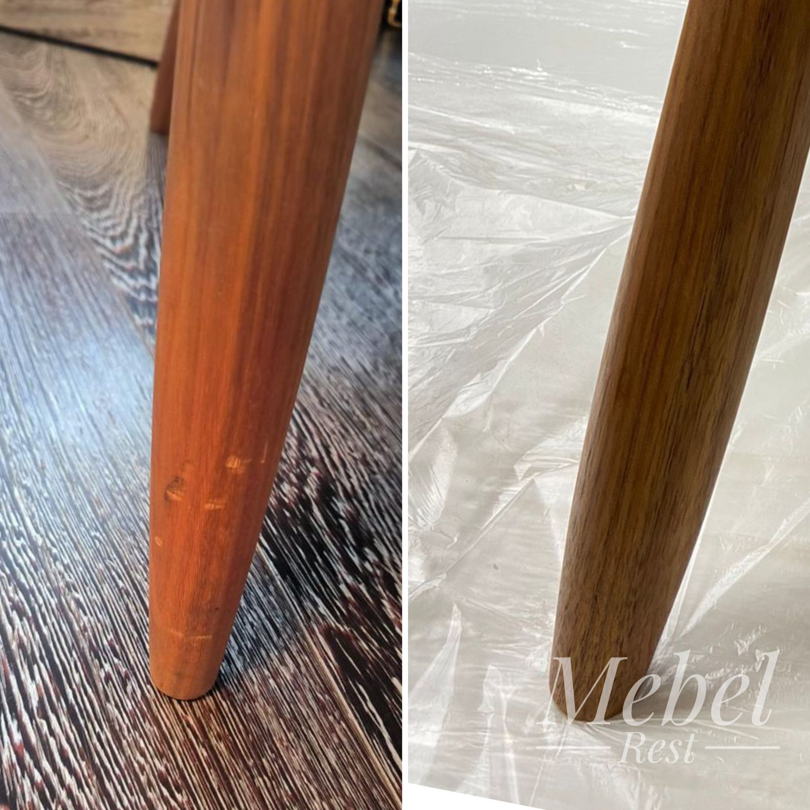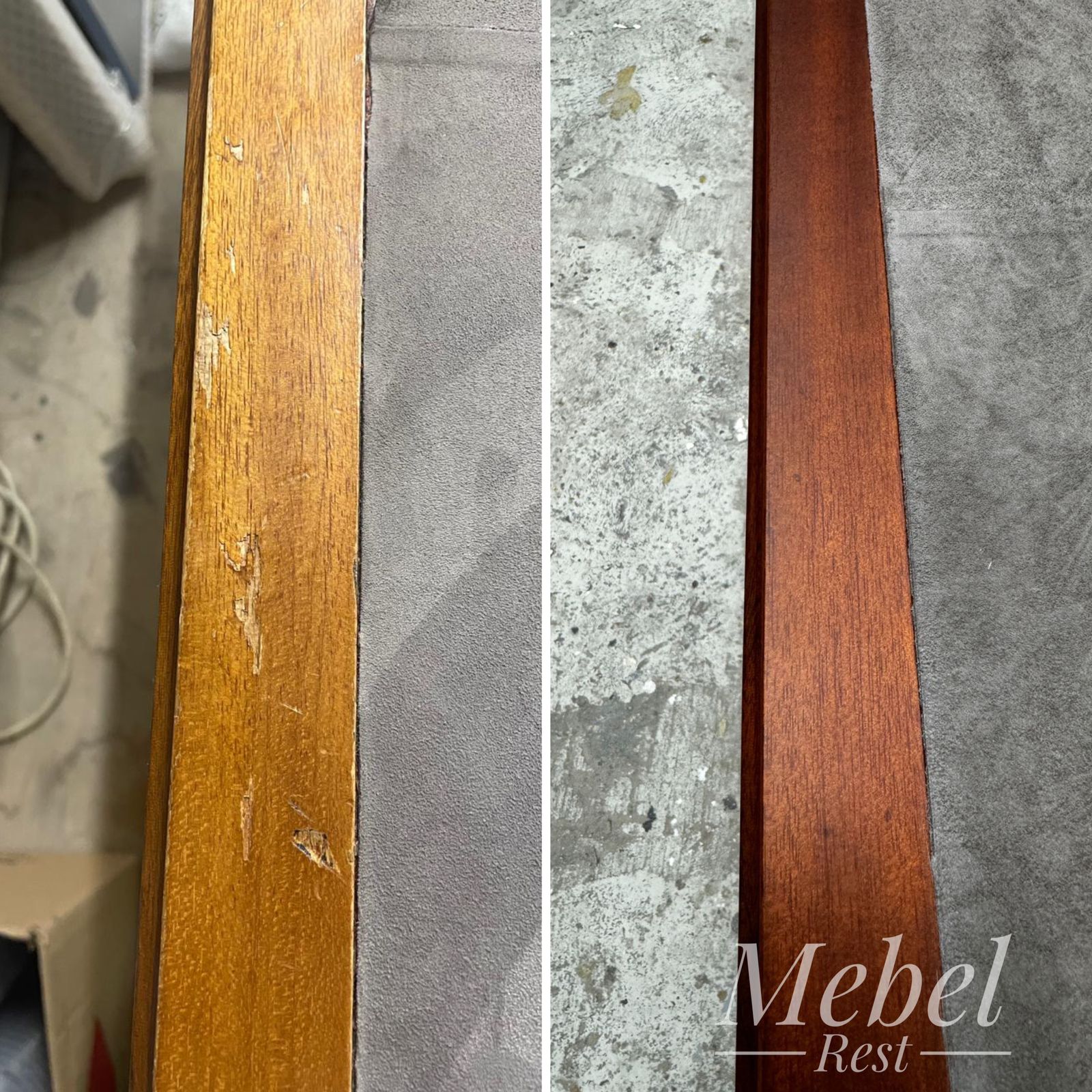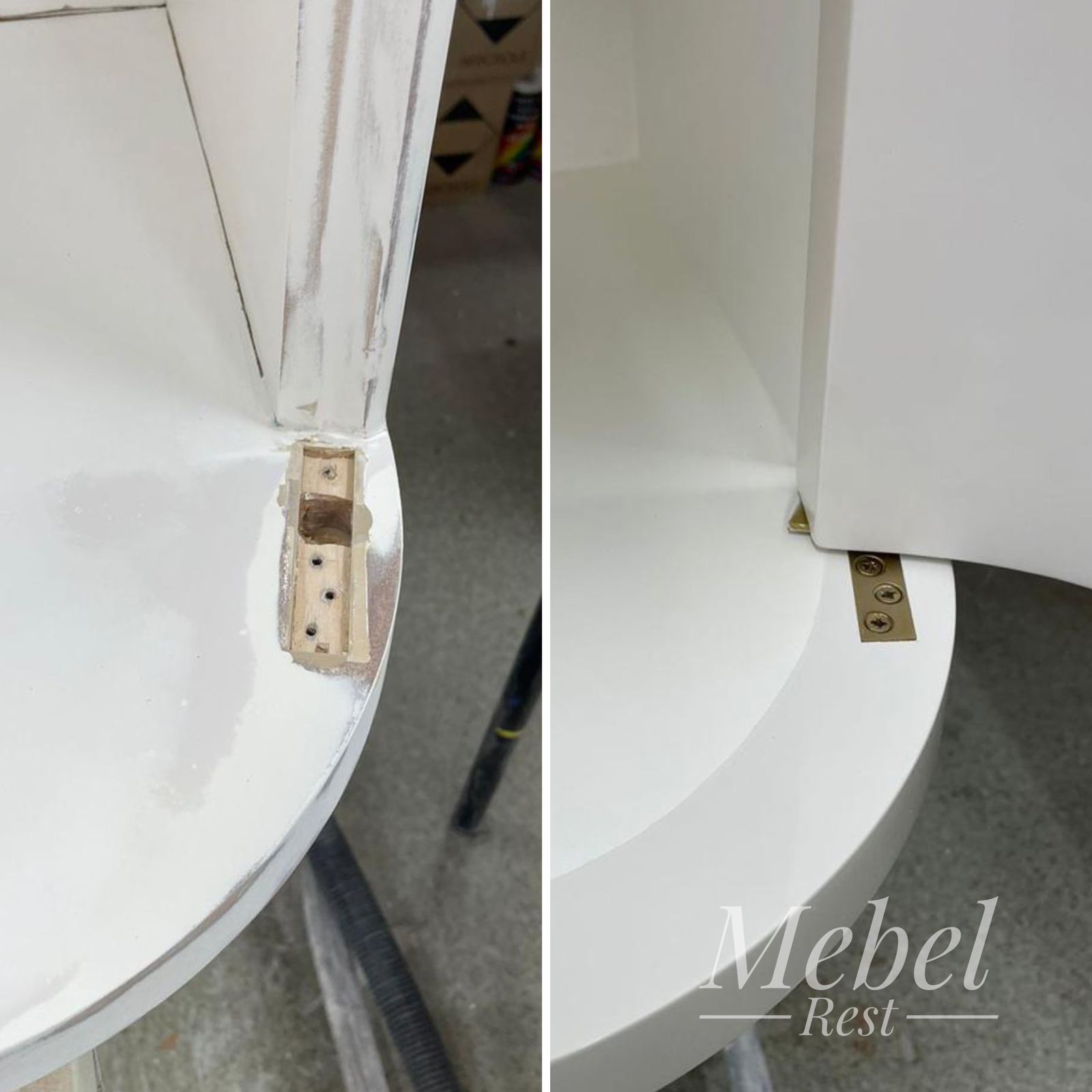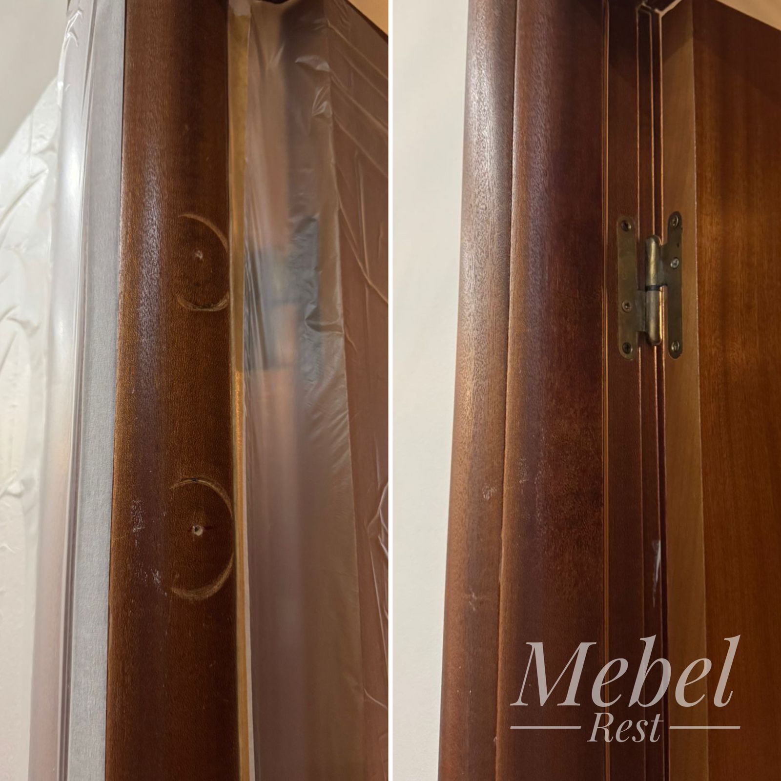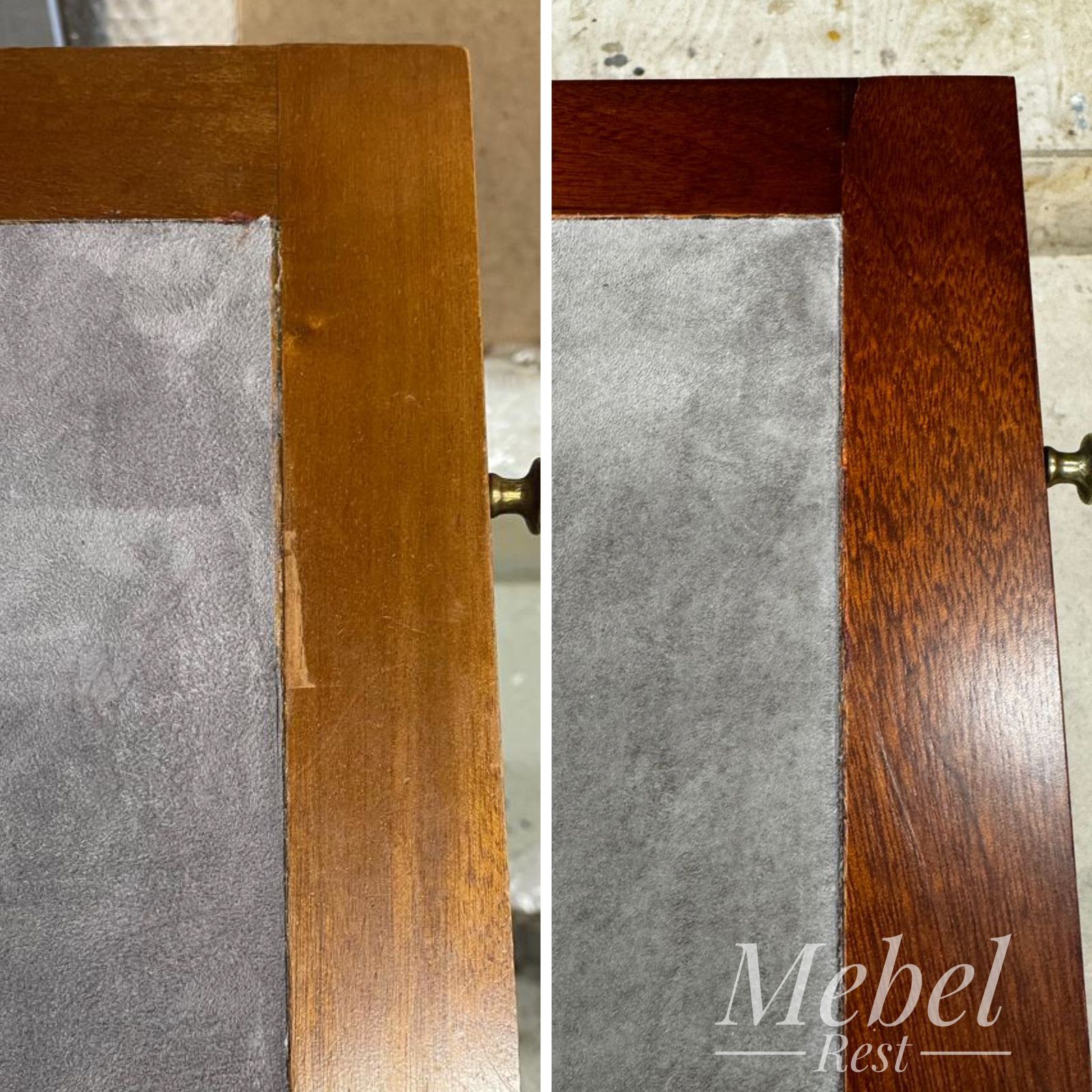 На второй день уже укрепленное место точечно было запаяно реставрационным воском, и подбирался тон фактуры дерева. На следующем этапе место реставрации было покрыто матовым водным лаком. На третий и четвертый день то же самое проделали с другим местом слома. Из-за предыдущего непрофессионального ремонта пришлось придать подлокотнику напряжение, чтобы свести две плоскости.