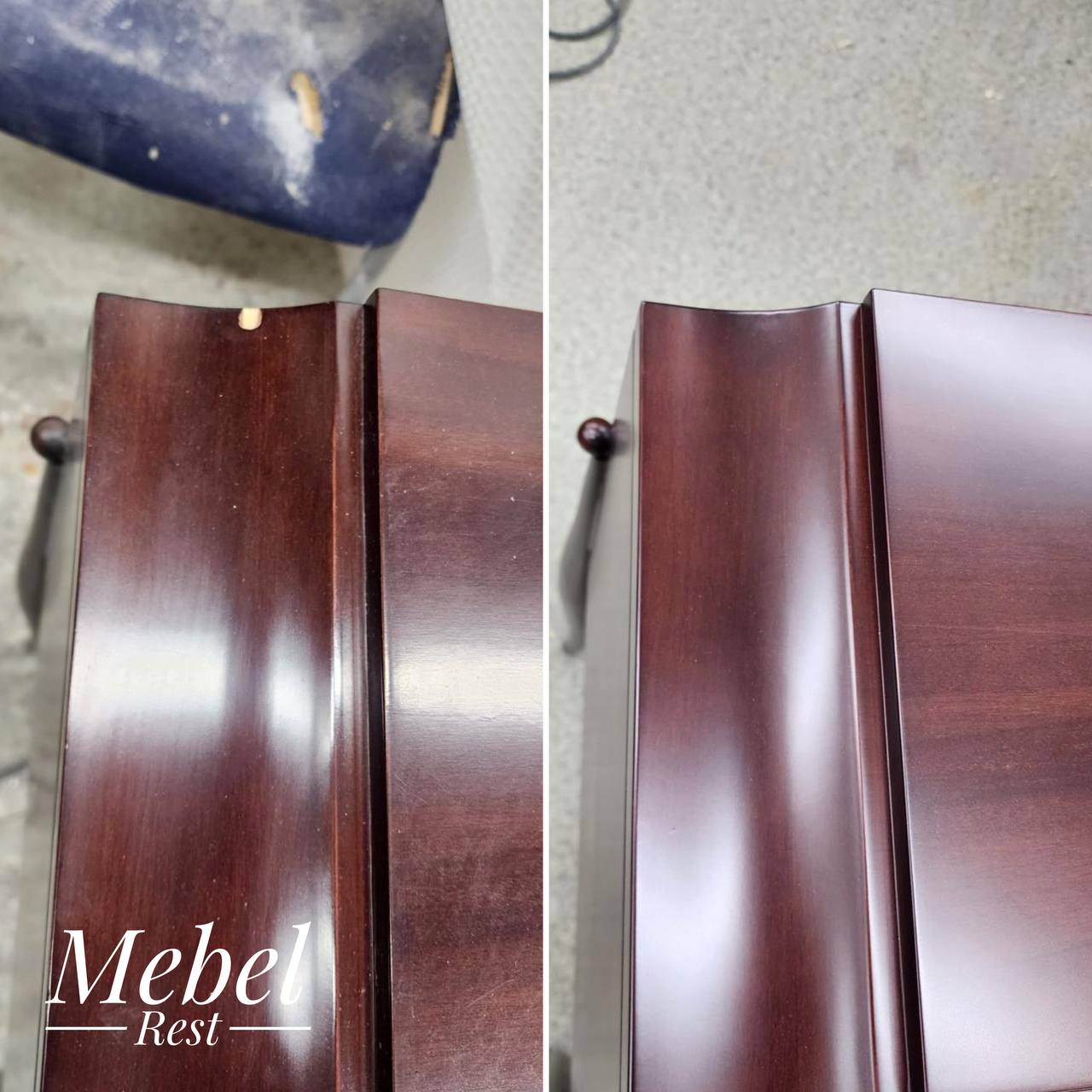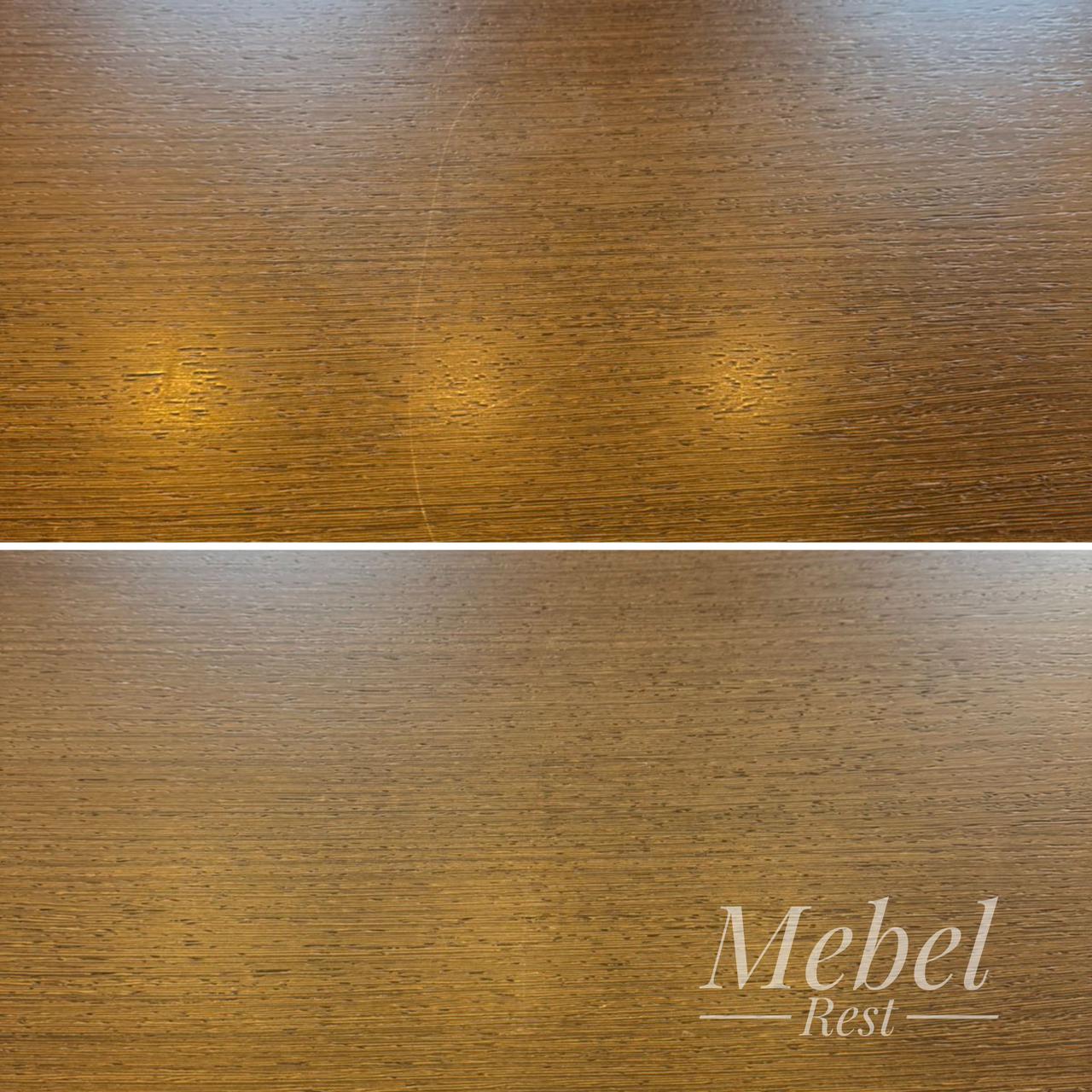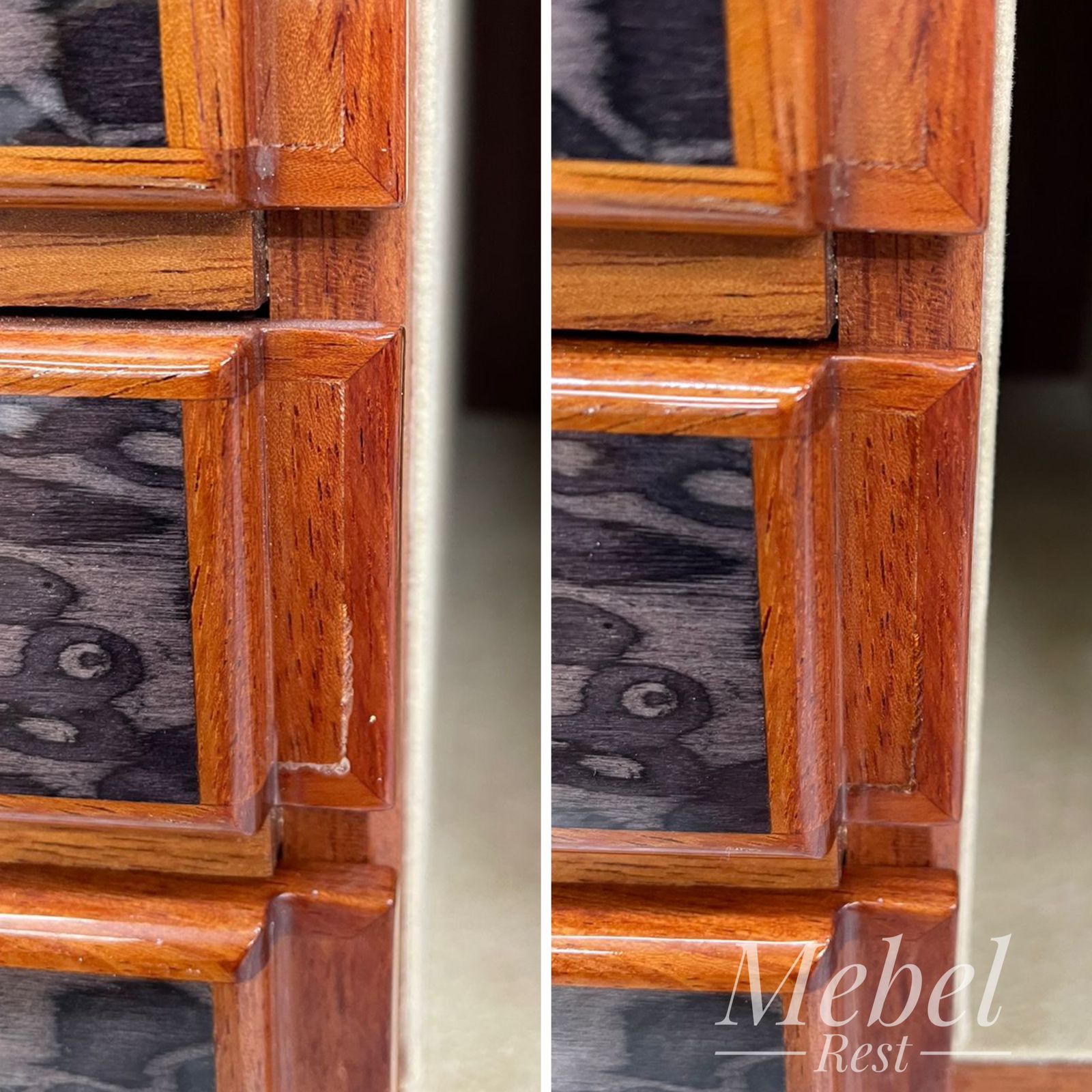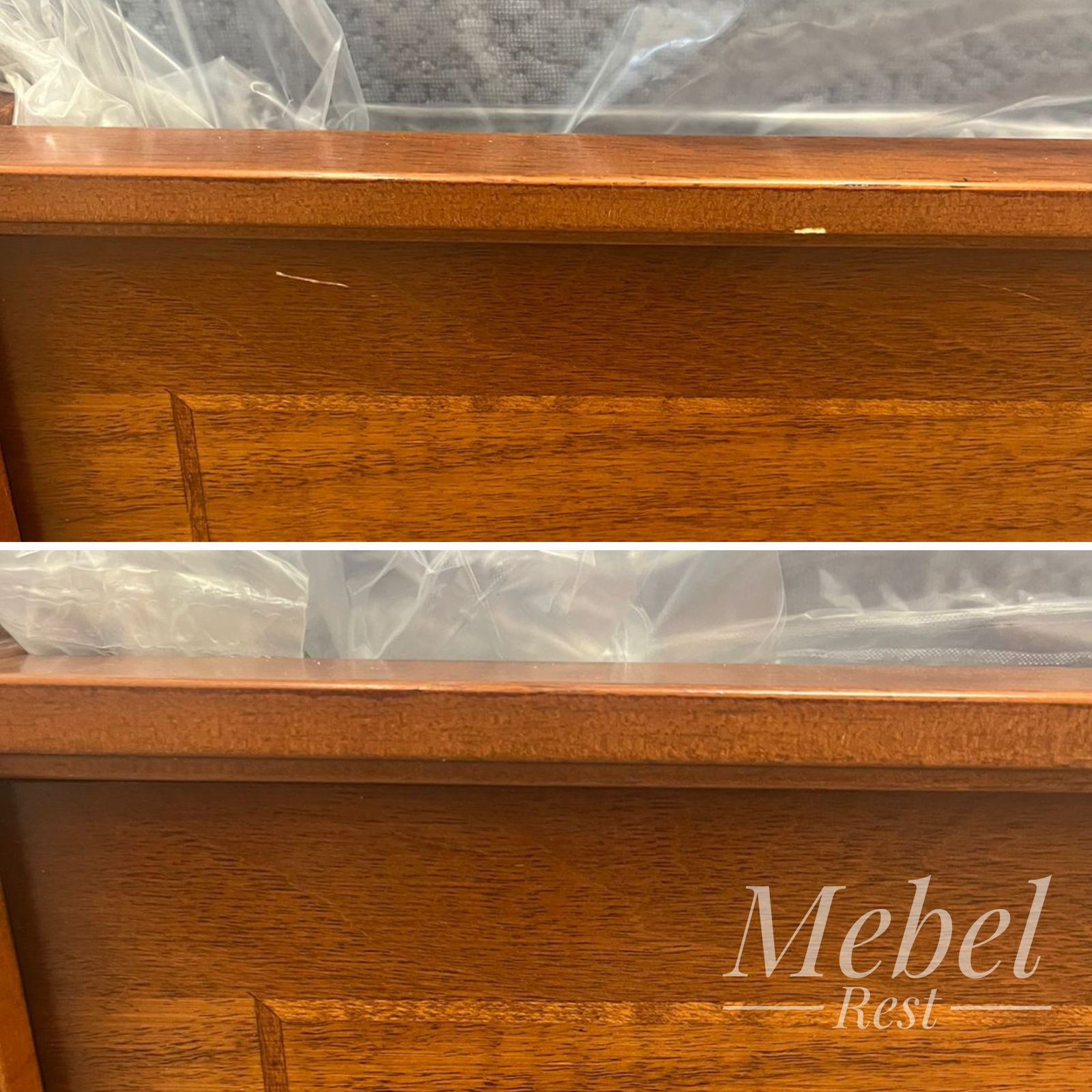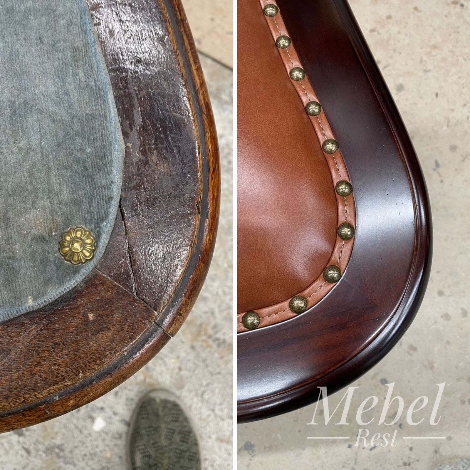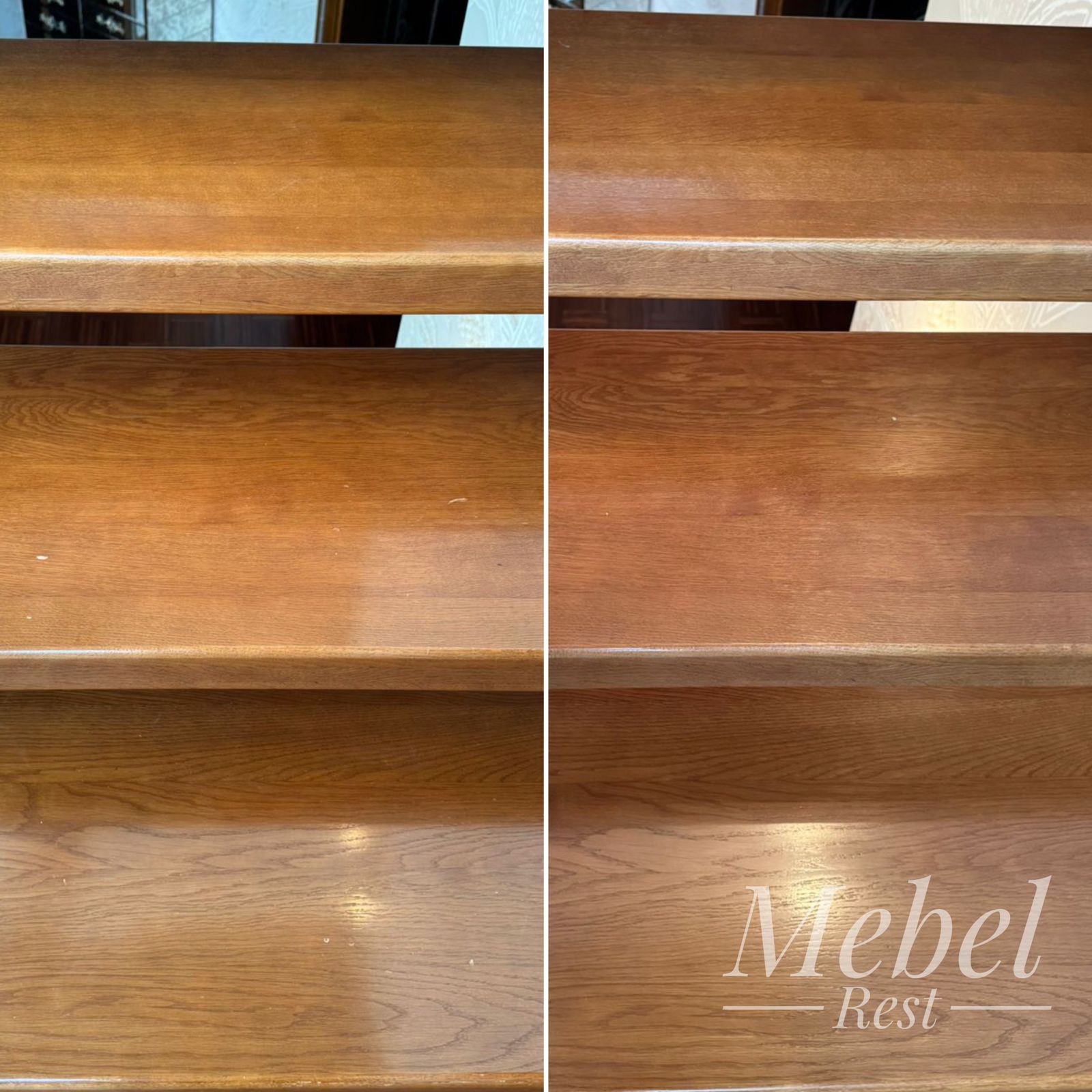 На второй день уже укрепленное место точечно было запаяно реставрационным воском, и подбирался тон фактуры дерева. На следующем этапе место реставрации было покрыто матовым водным лаком. На третий и четвертый день то же самое проделали с другим местом слома. Из-за предыдущего непрофессионального ремонта пришлось придать подлокотнику напряжение, чтобы свести две плоскости.