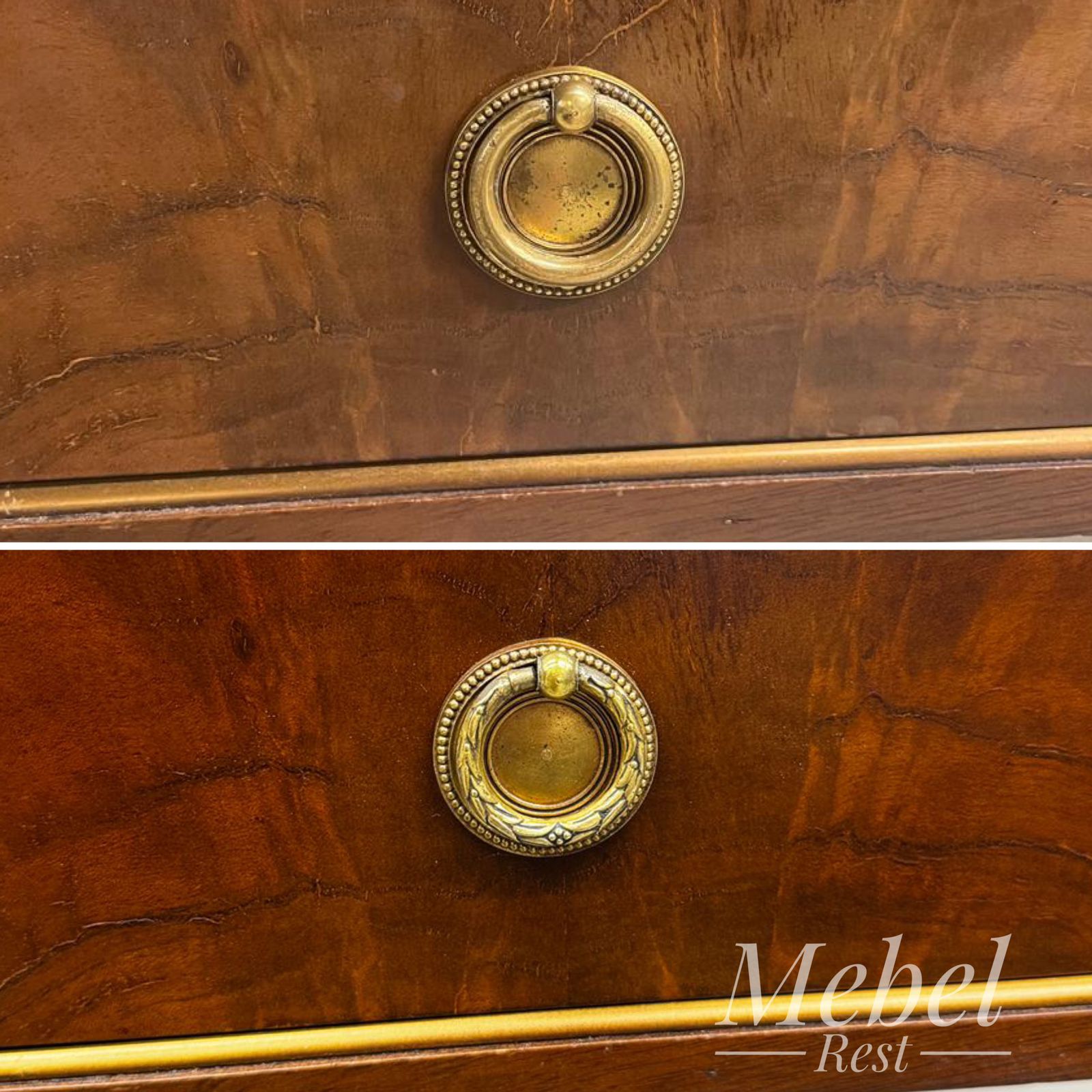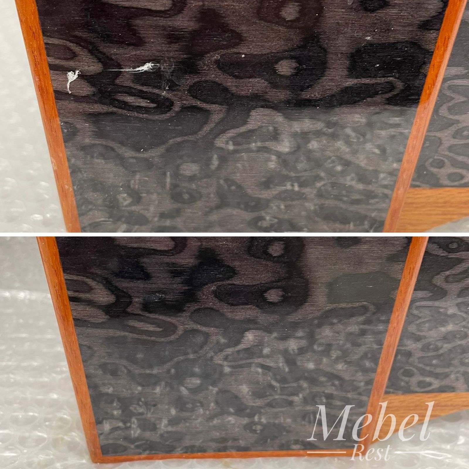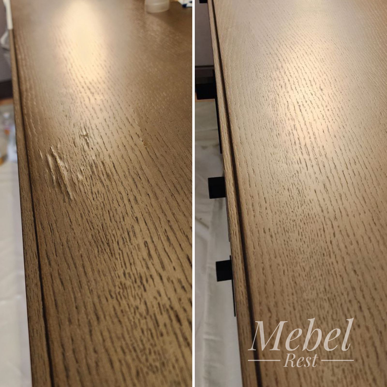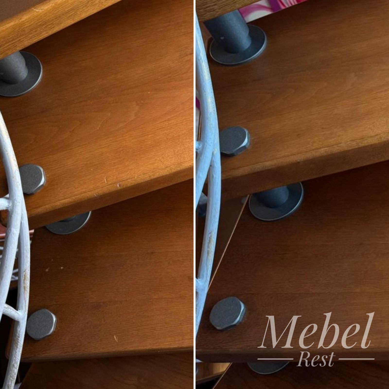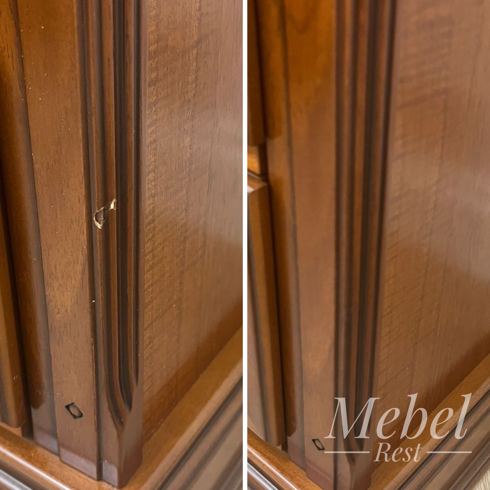 На второй день уже укрепленное место точечно было запаяно реставрационным воском, и подбирался тон фактуры дерева. На следующем этапе место реставрации было покрыто матовым водным лаком. На третий и четвертый день то же самое проделали с другим местом слома. Из-за предыдущего непрофессионального ремонта пришлось придать подлокотнику напряжение, чтобы свести две плоскости.