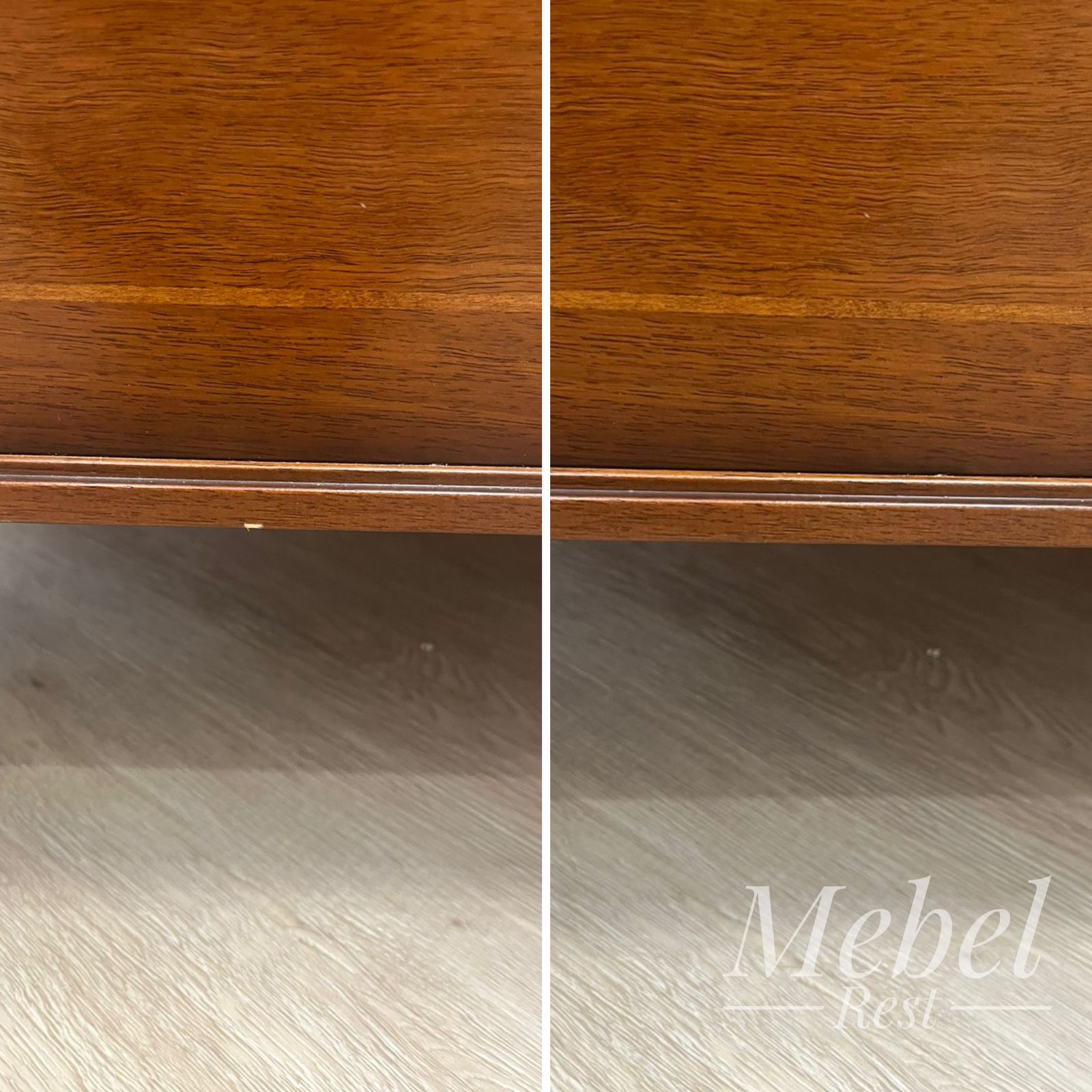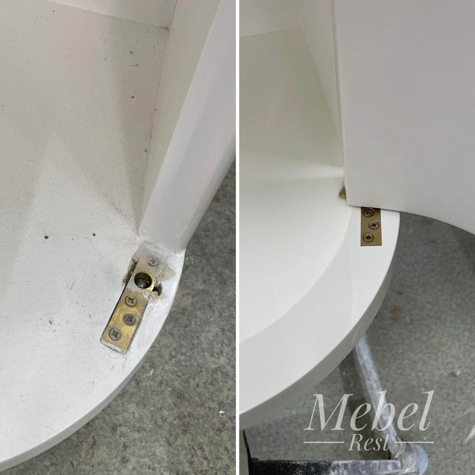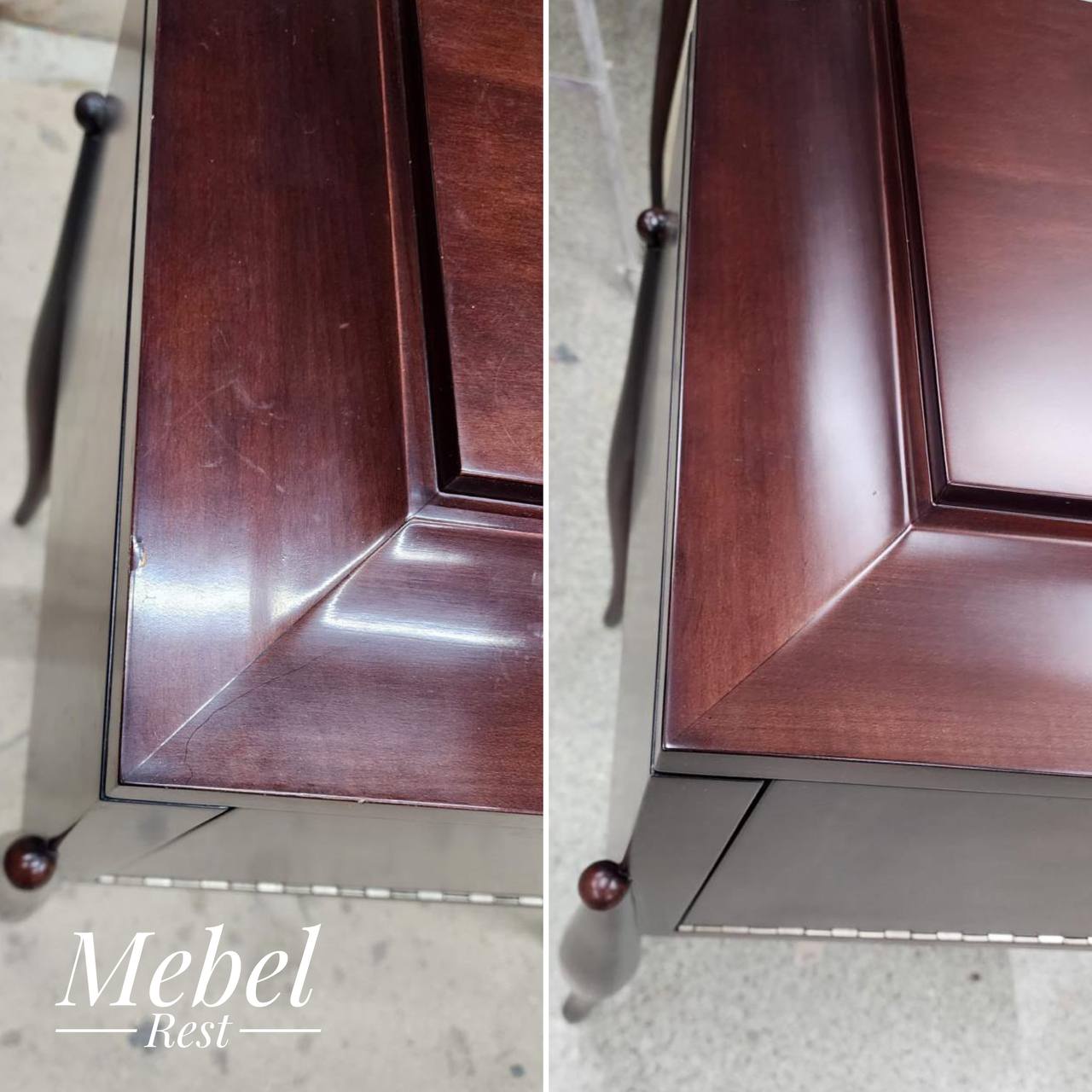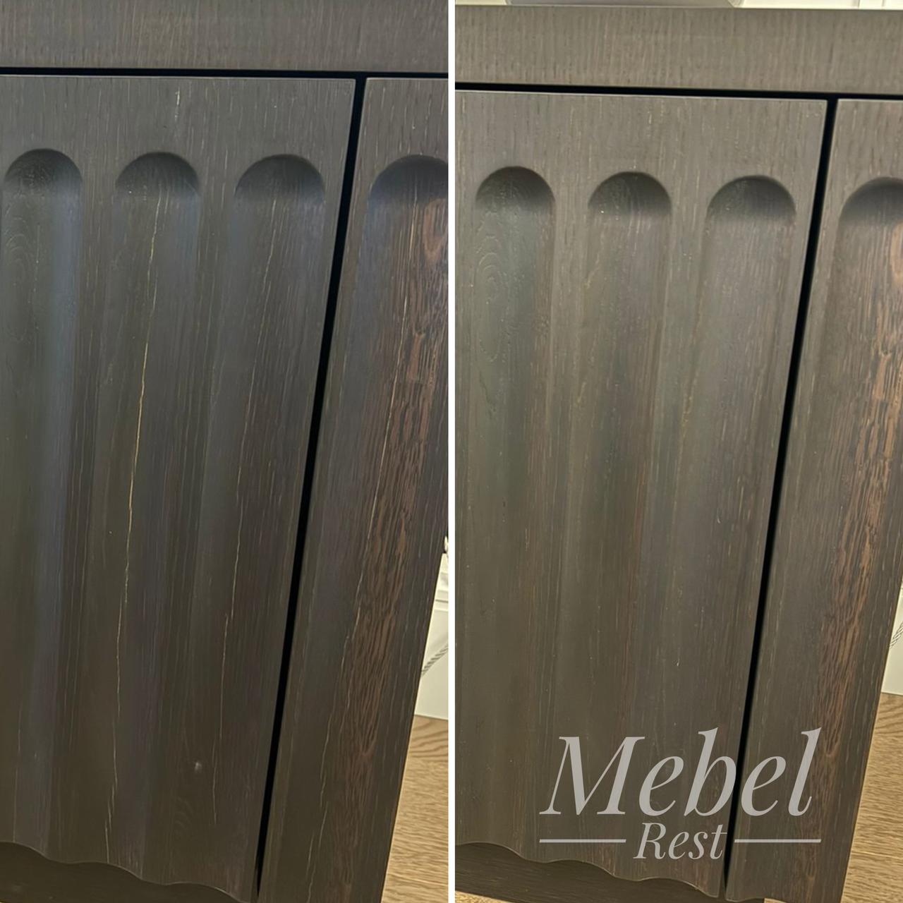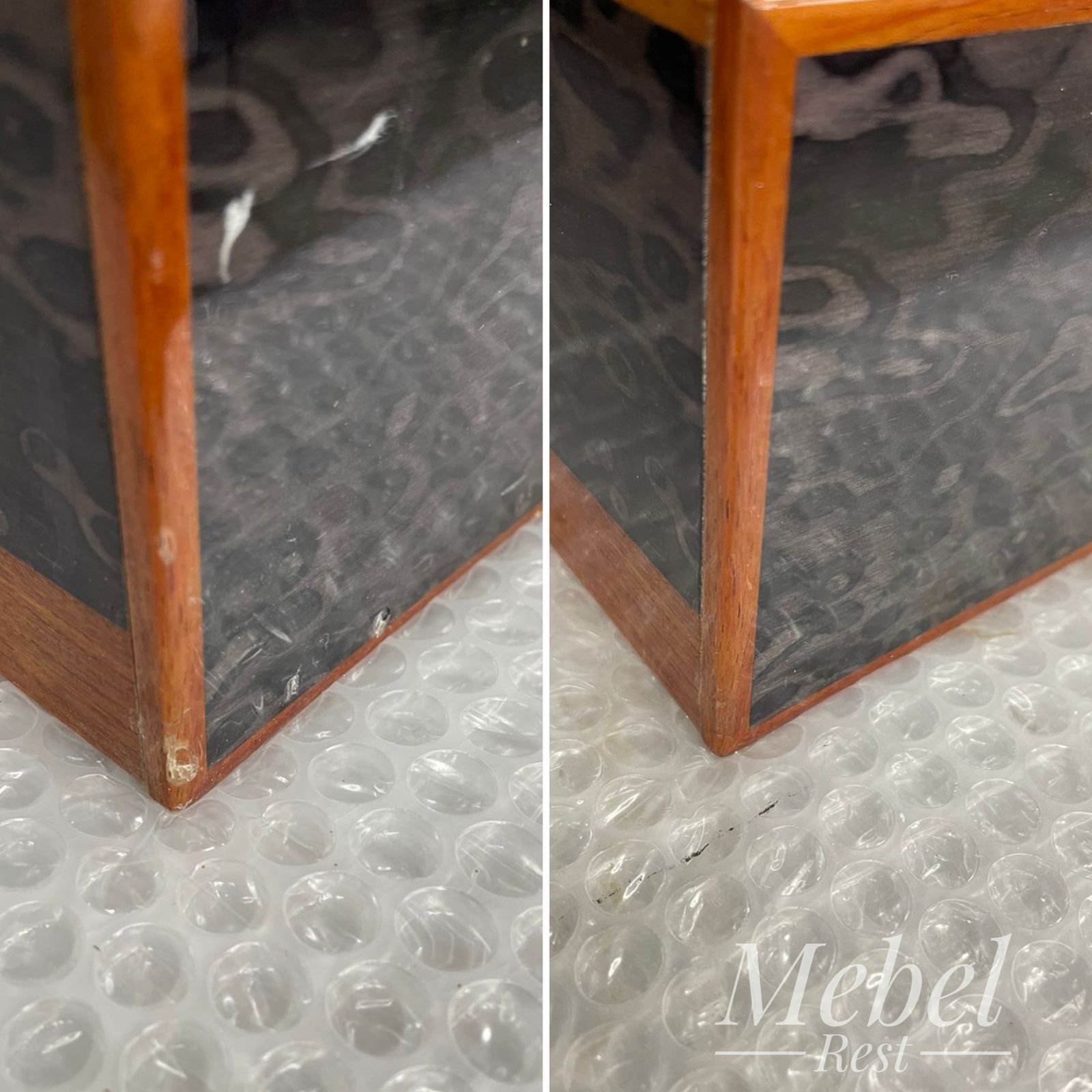 На второй день уже укрепленное место точечно было запаяно реставрационным воском, и подбирался тон фактуры дерева. На следующем этапе место реставрации было покрыто матовым водным лаком. На третий и четвертый день то же самое проделали с другим местом слома. Из-за предыдущего непрофессионального ремонта пришлось придать подлокотнику напряжение, чтобы свести две плоскости.