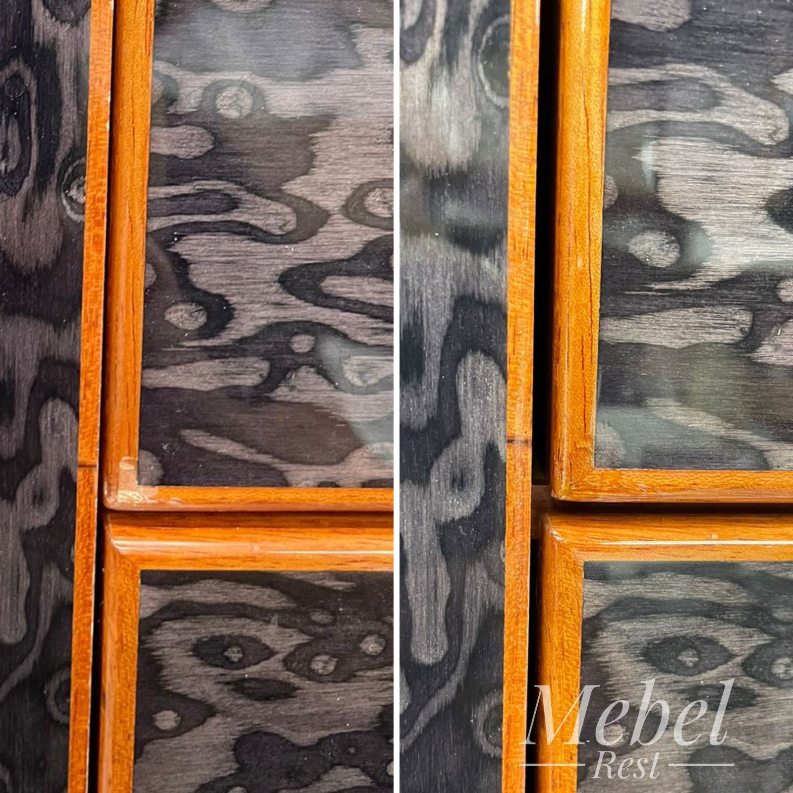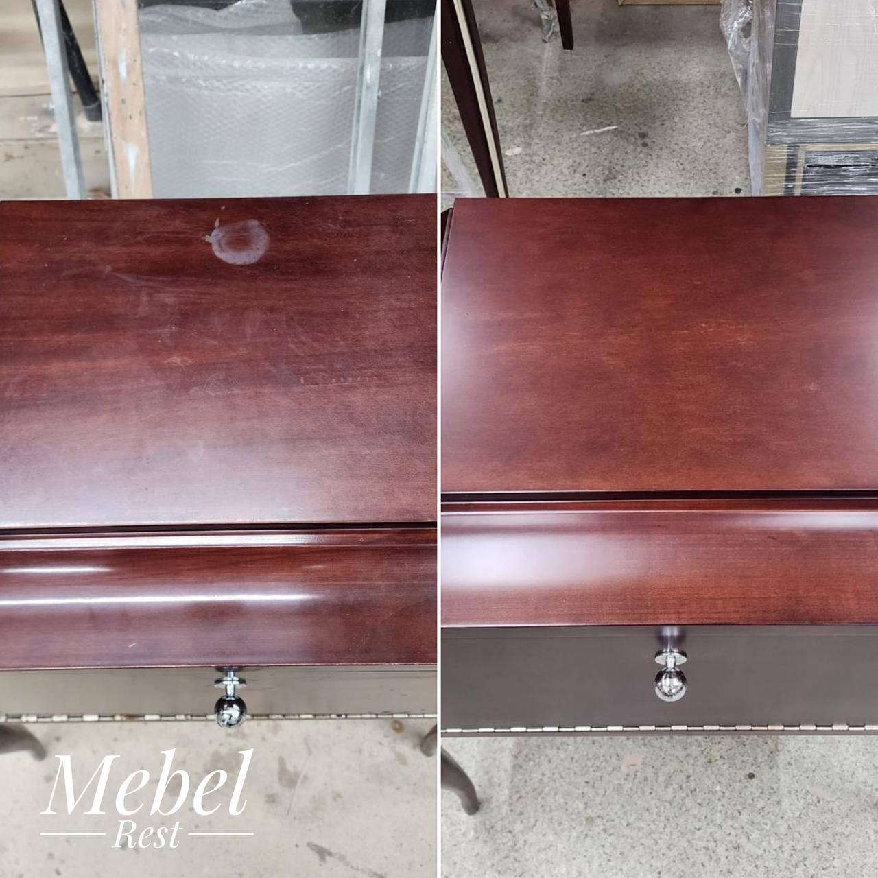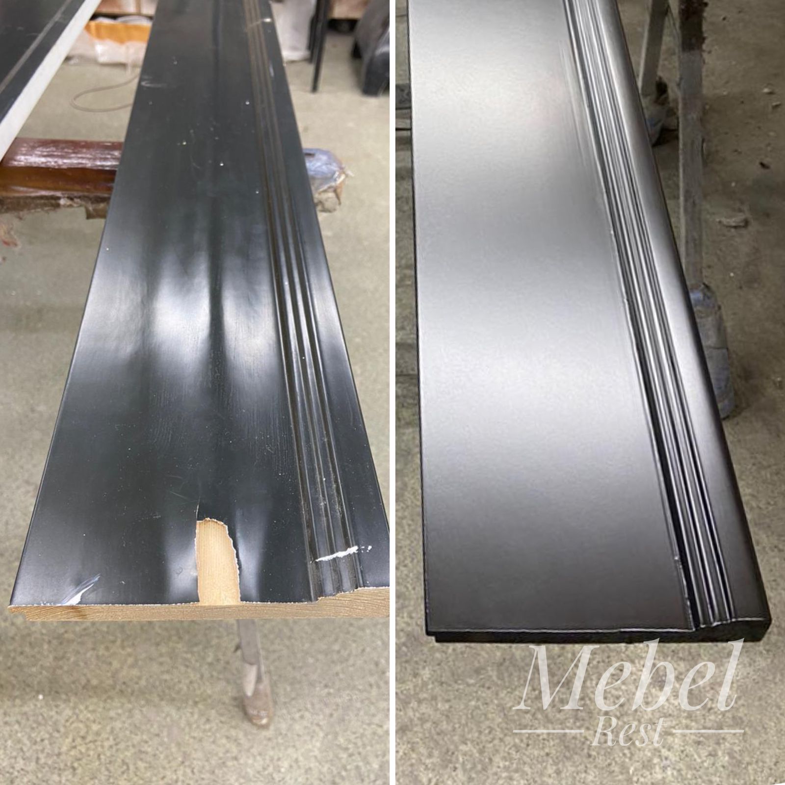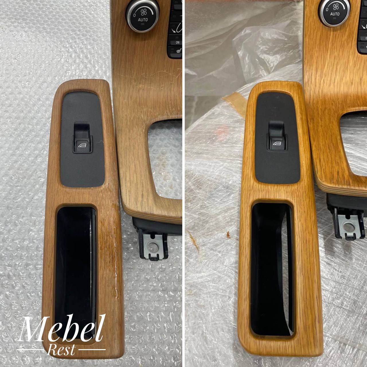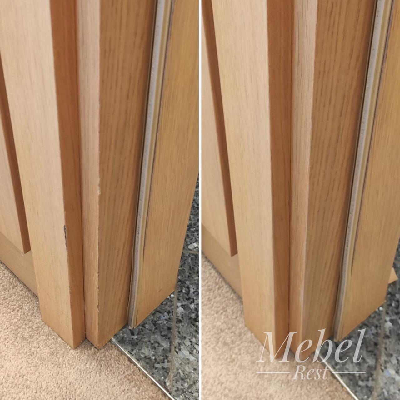 На второй день уже укрепленное место точечно было запаяно реставрационным воском, и подбирался тон фактуры дерева. На следующем этапе место реставрации было покрыто матовым водным лаком. На третий и четвертый день то же самое проделали с другим местом слома. Из-за предыдущего непрофессионального ремонта пришлось придать подлокотнику напряжение, чтобы свести две плоскости.