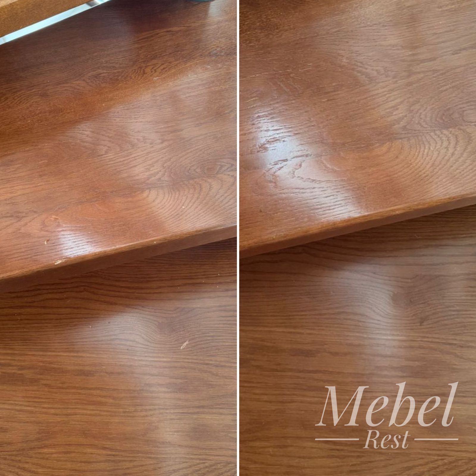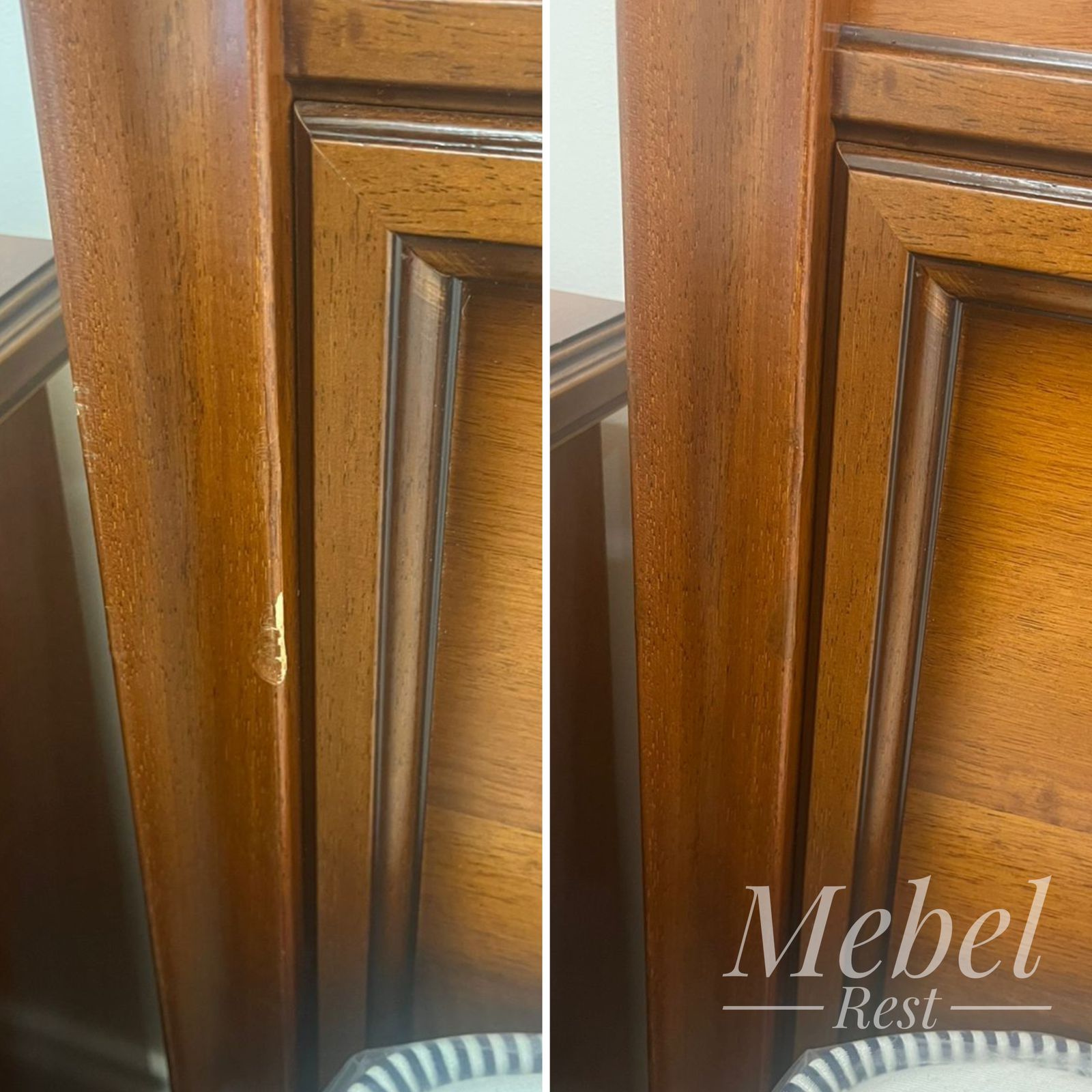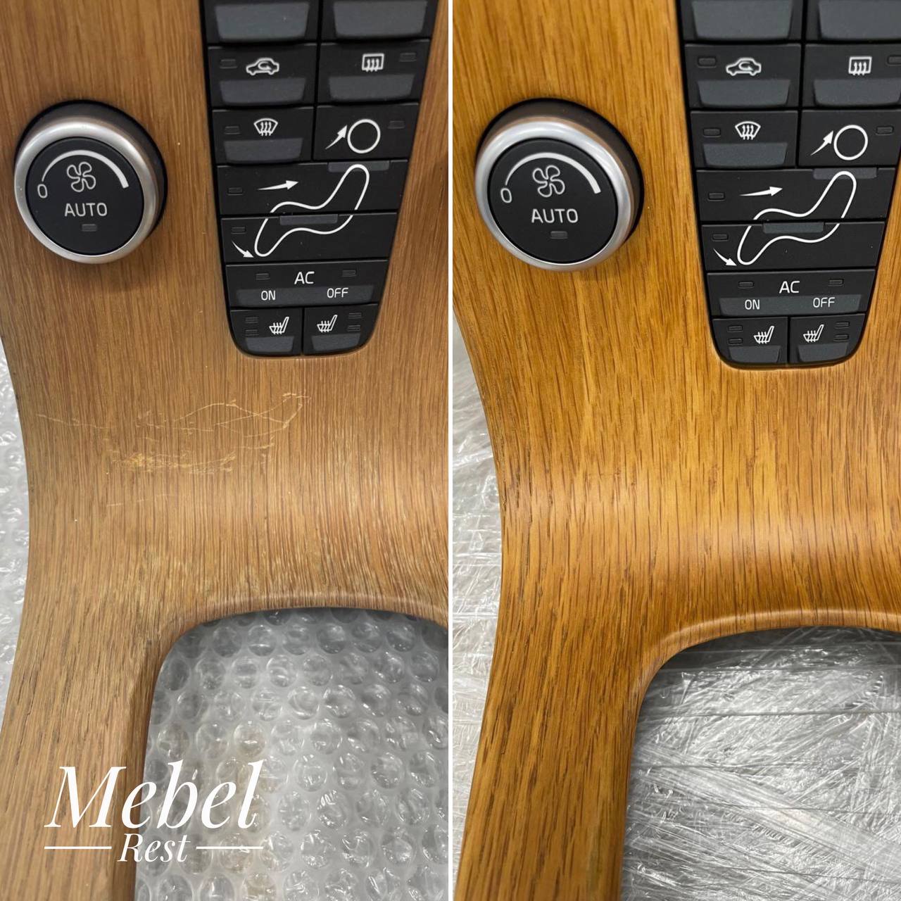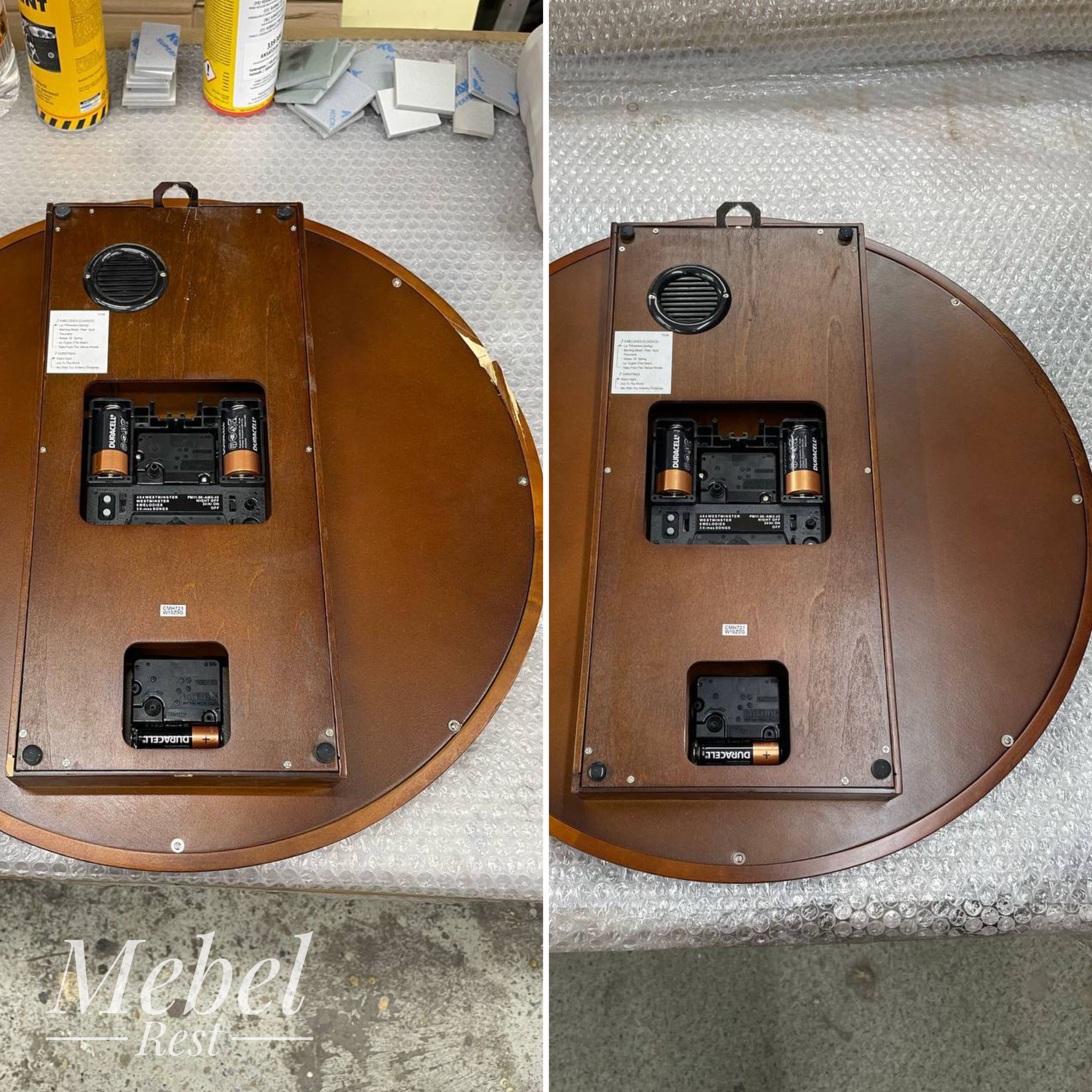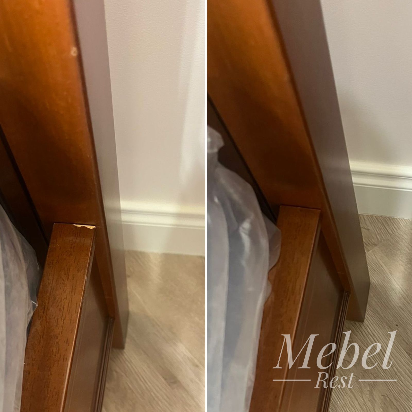 На второй день уже укрепленное место точечно было запаяно реставрационным воском, и подбирался тон фактуры дерева. На следующем этапе место реставрации было покрыто матовым водным лаком. На третий и четвертый день то же самое проделали с другим местом слома. Из-за предыдущего непрофессионального ремонта пришлось придать подлокотнику напряжение, чтобы свести две плоскости.