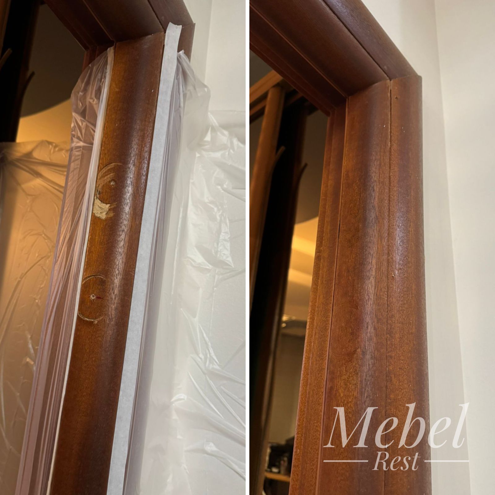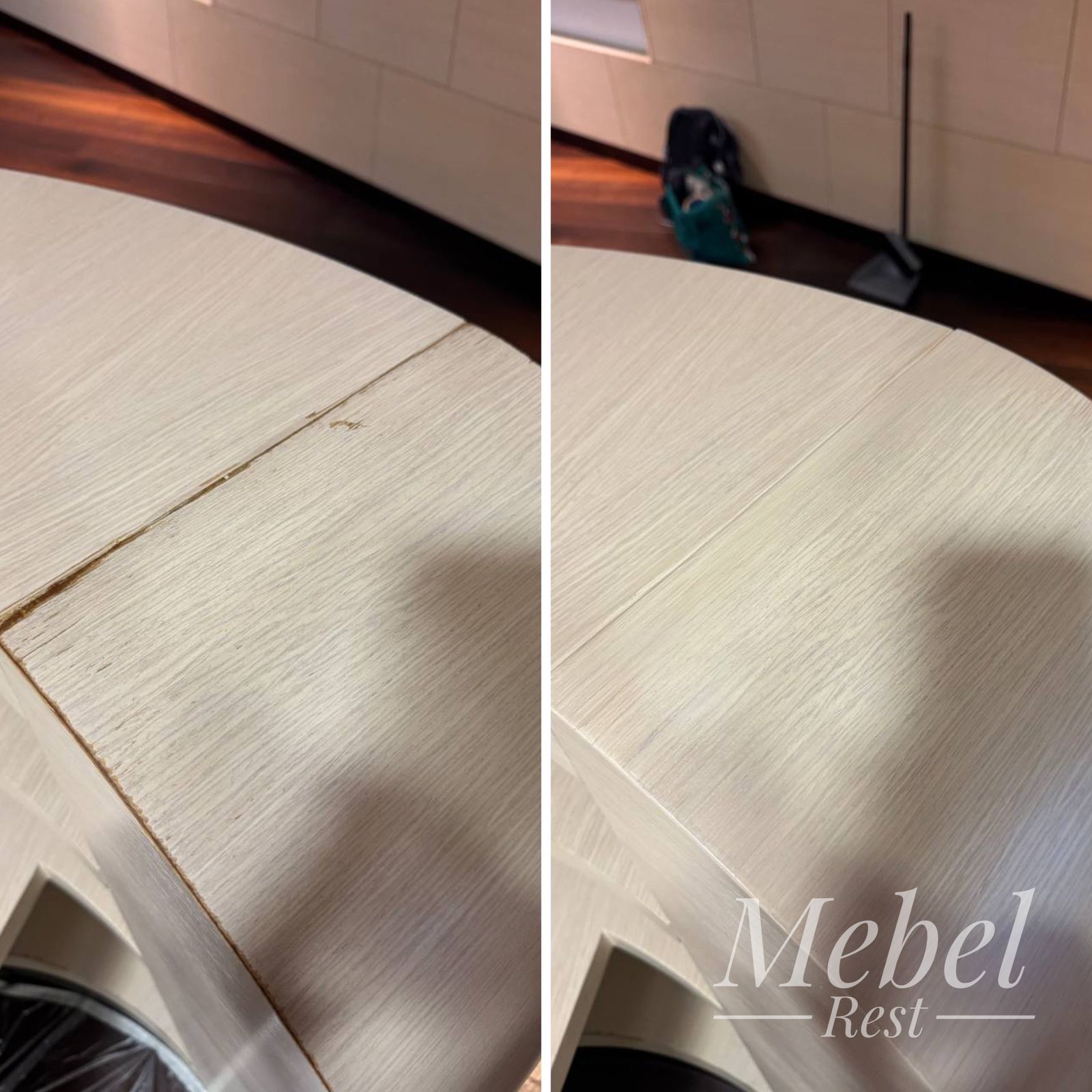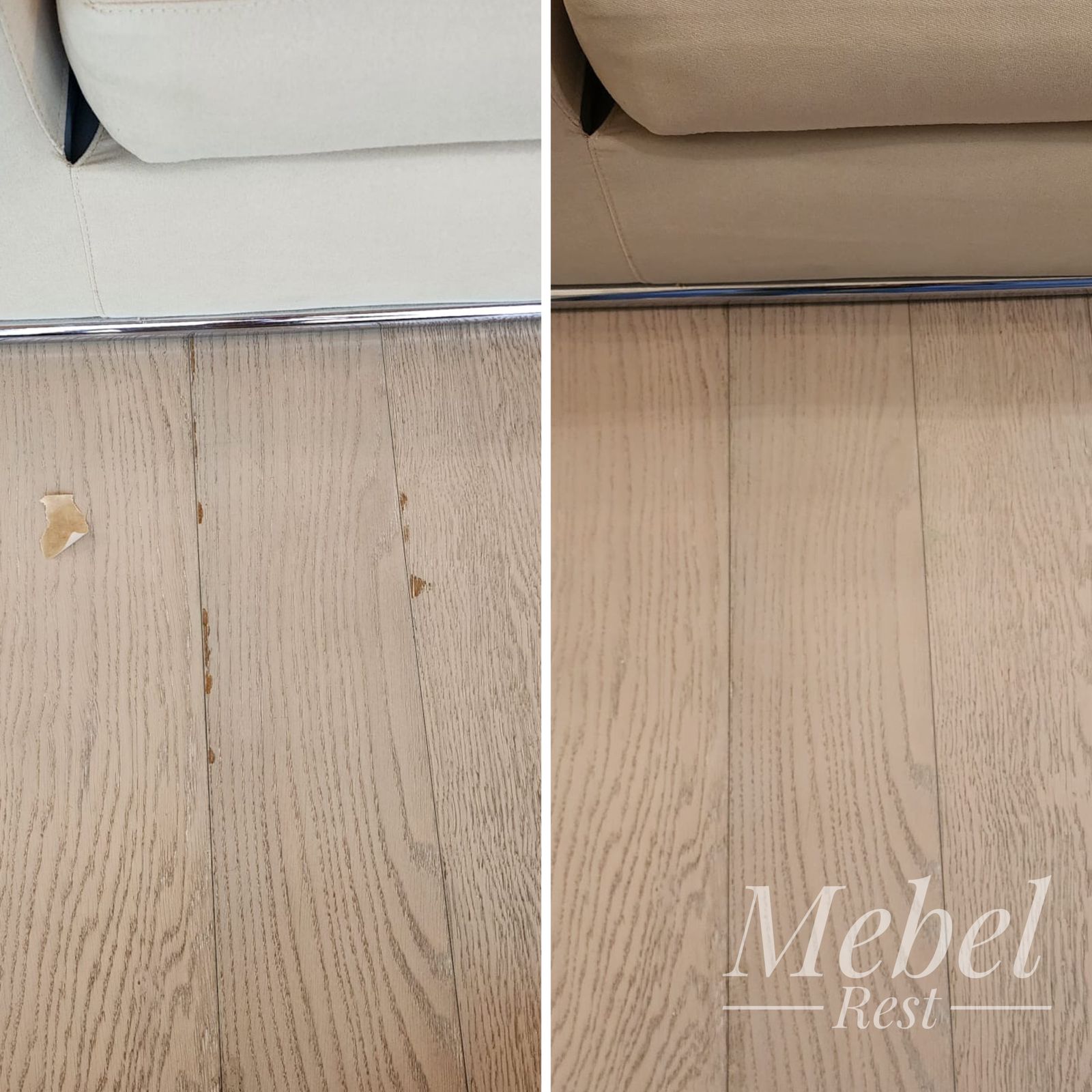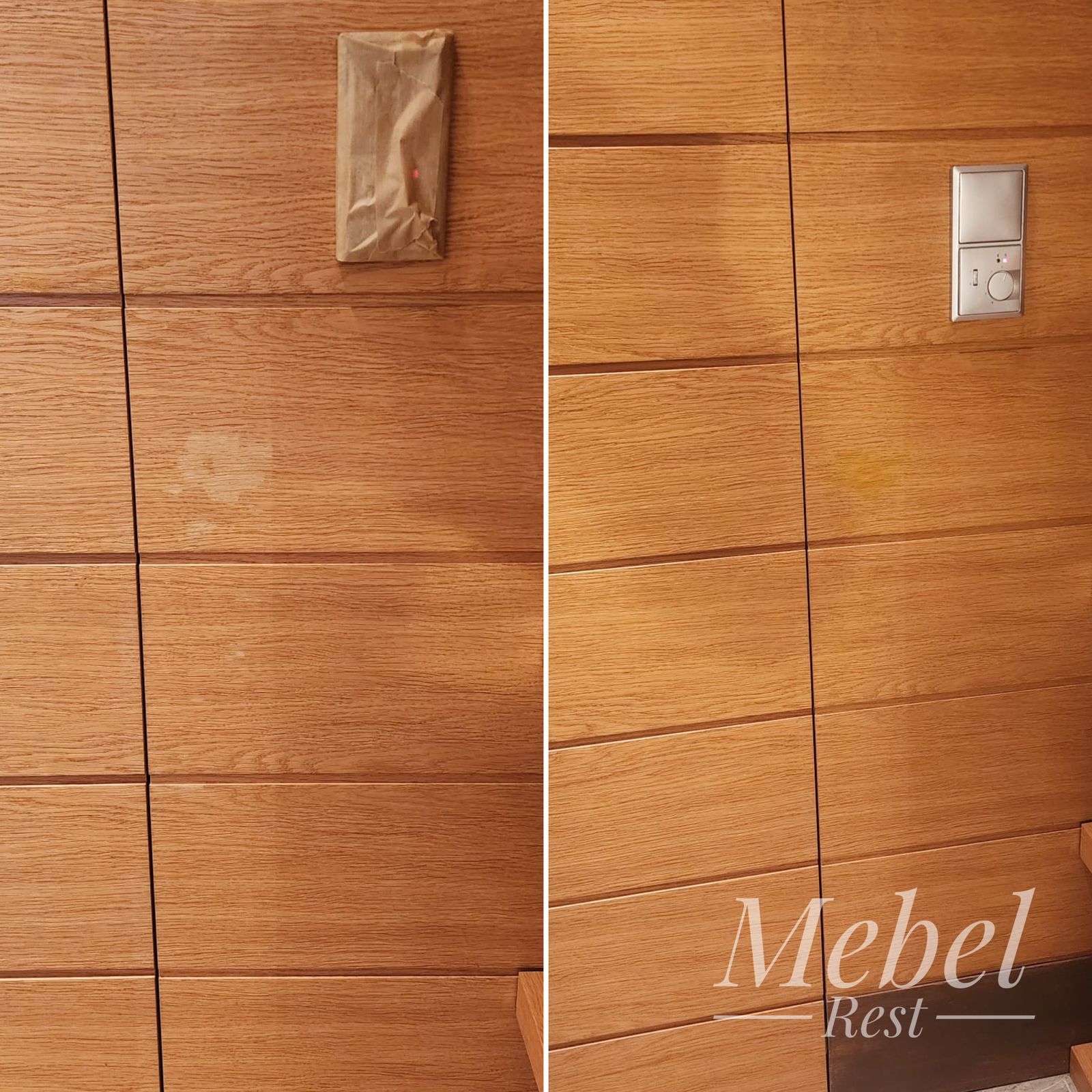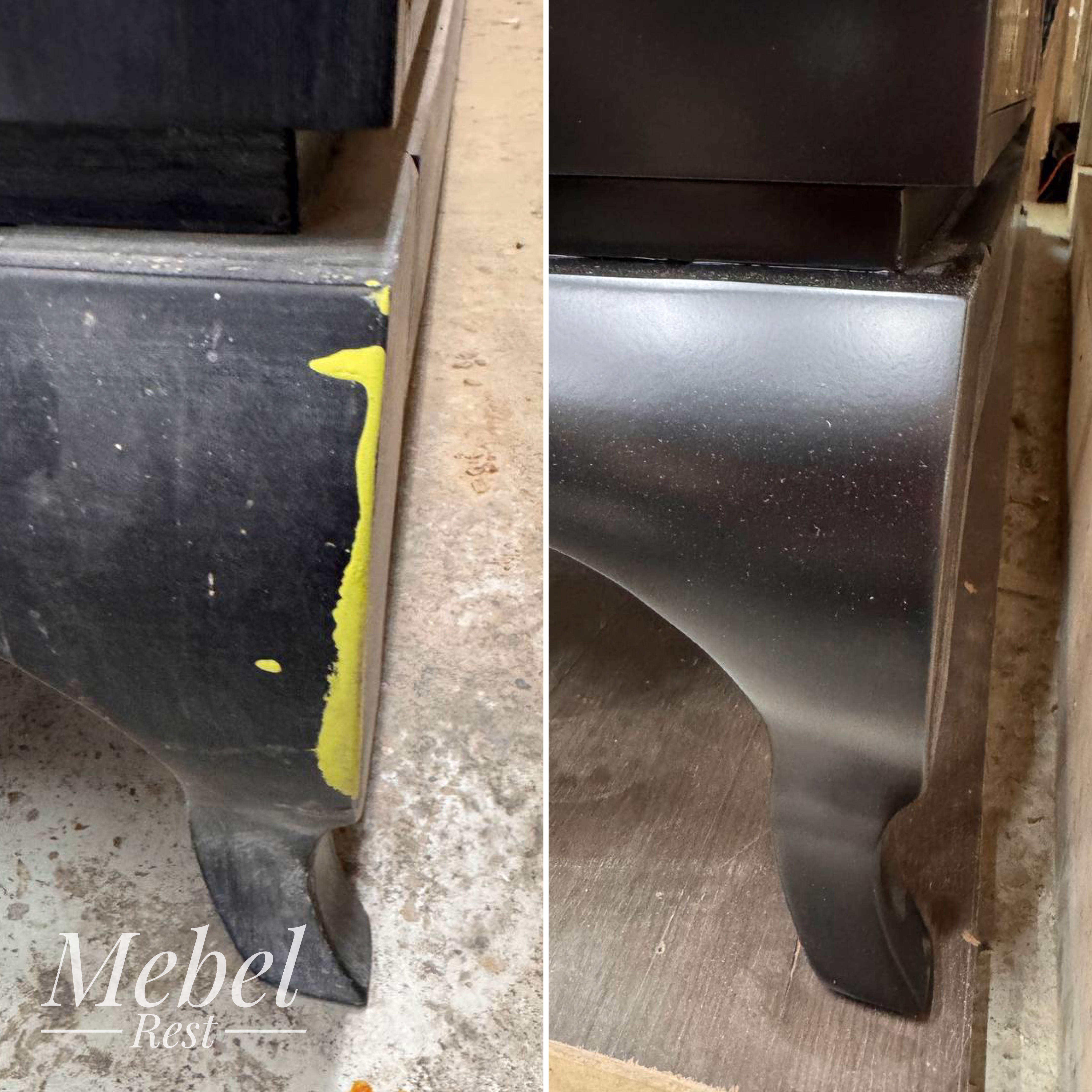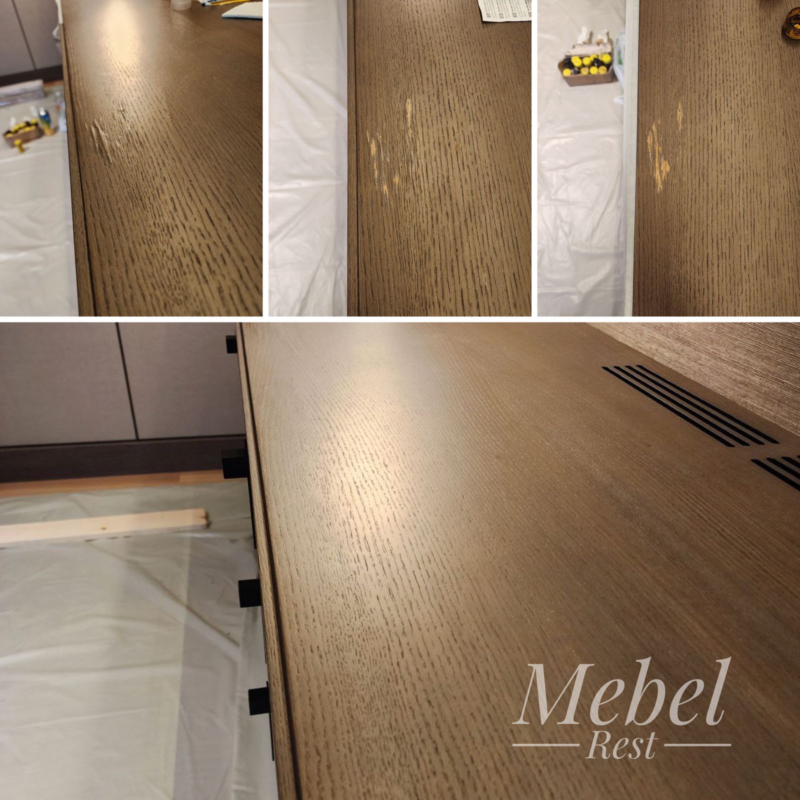 На второй день уже укрепленное место точечно было запаяно реставрационным воском, и подбирался тон фактуры дерева. На следующем этапе место реставрации было покрыто матовым водным лаком. На третий и четвертый день то же самое проделали с другим местом слома. Из-за предыдущего непрофессионального ремонта пришлось придать подлокотнику напряжение, чтобы свести две плоскости.