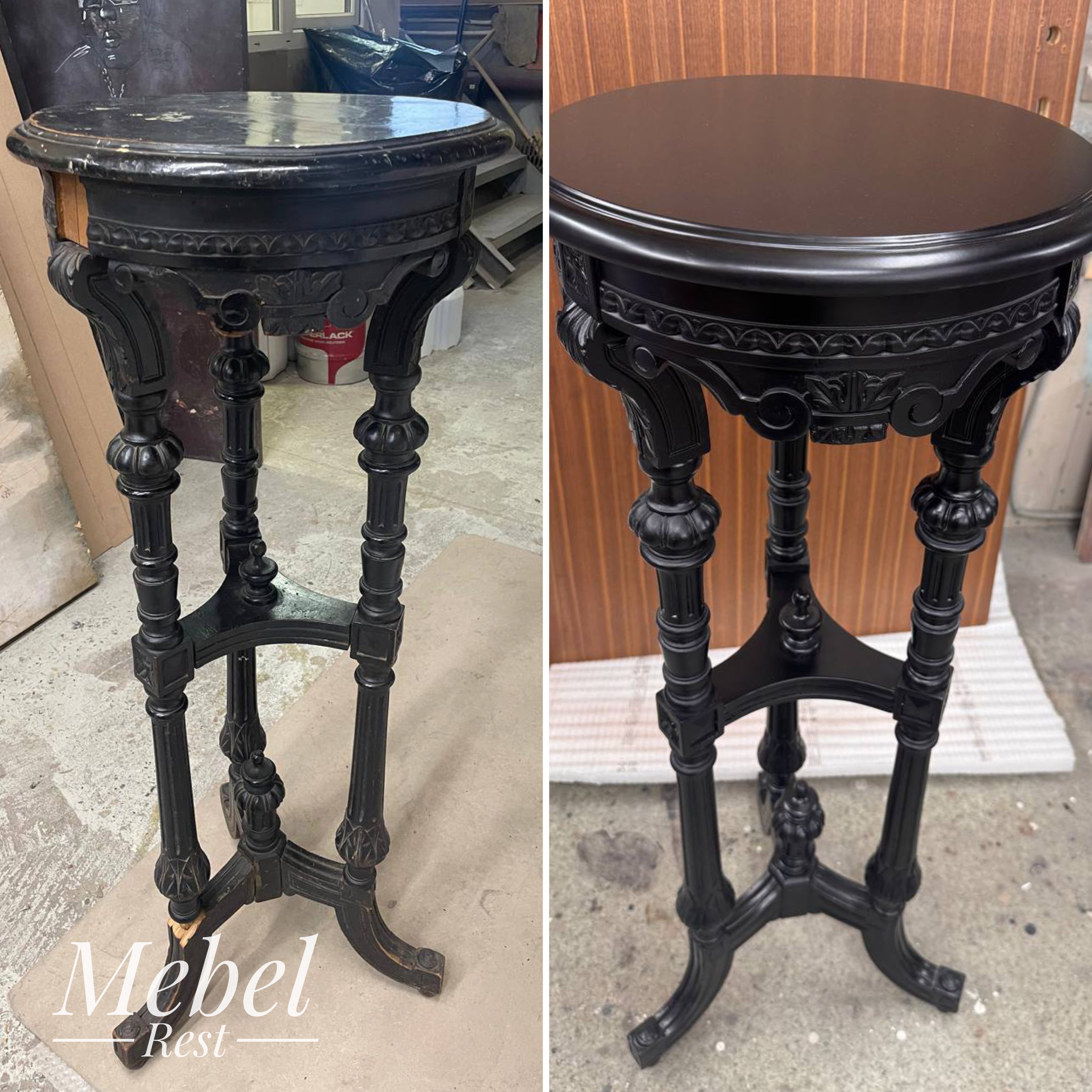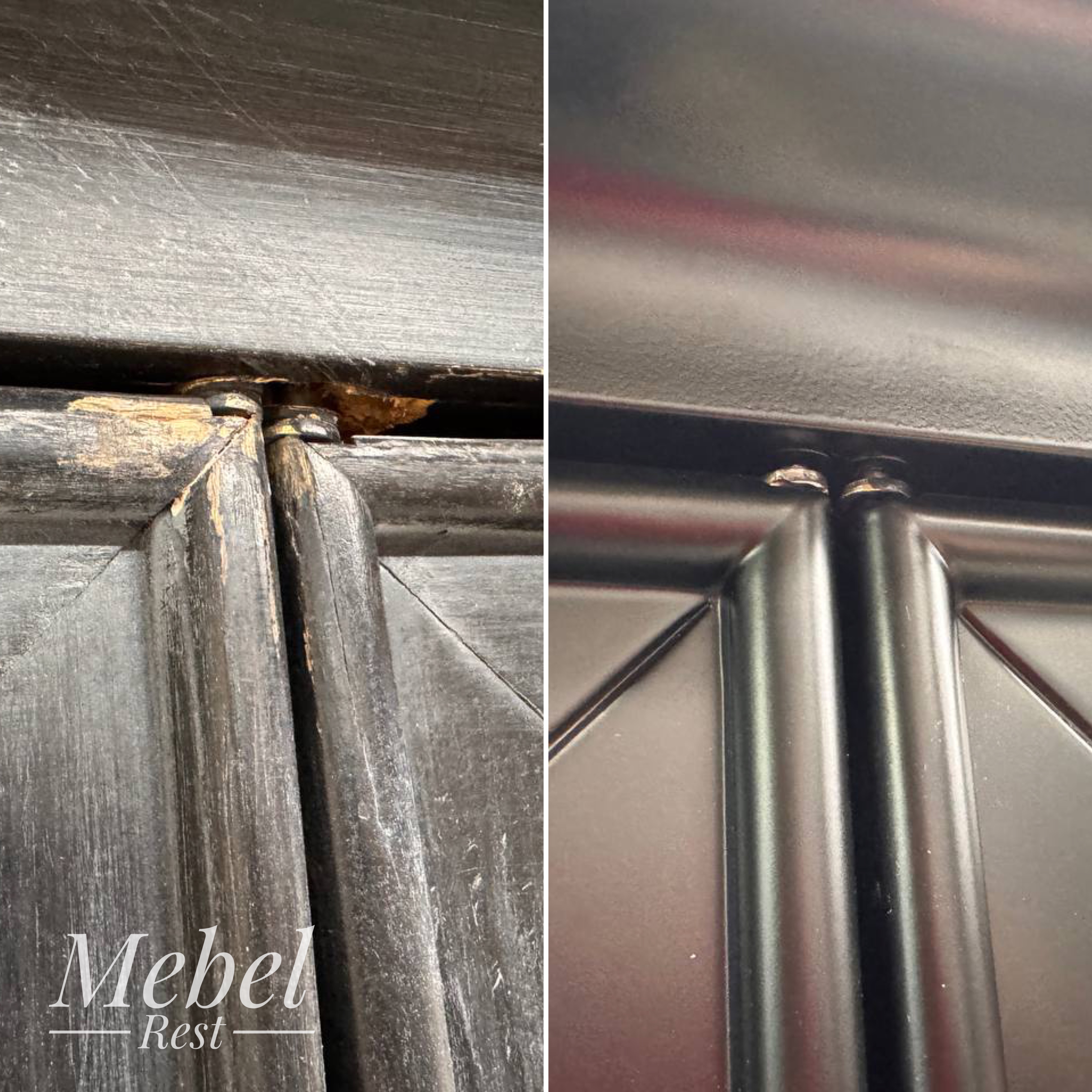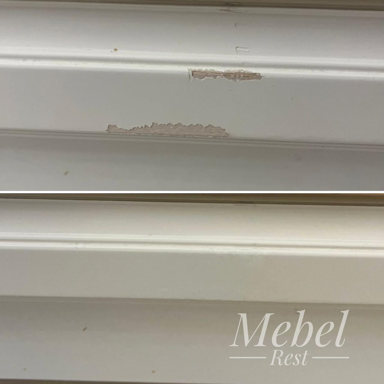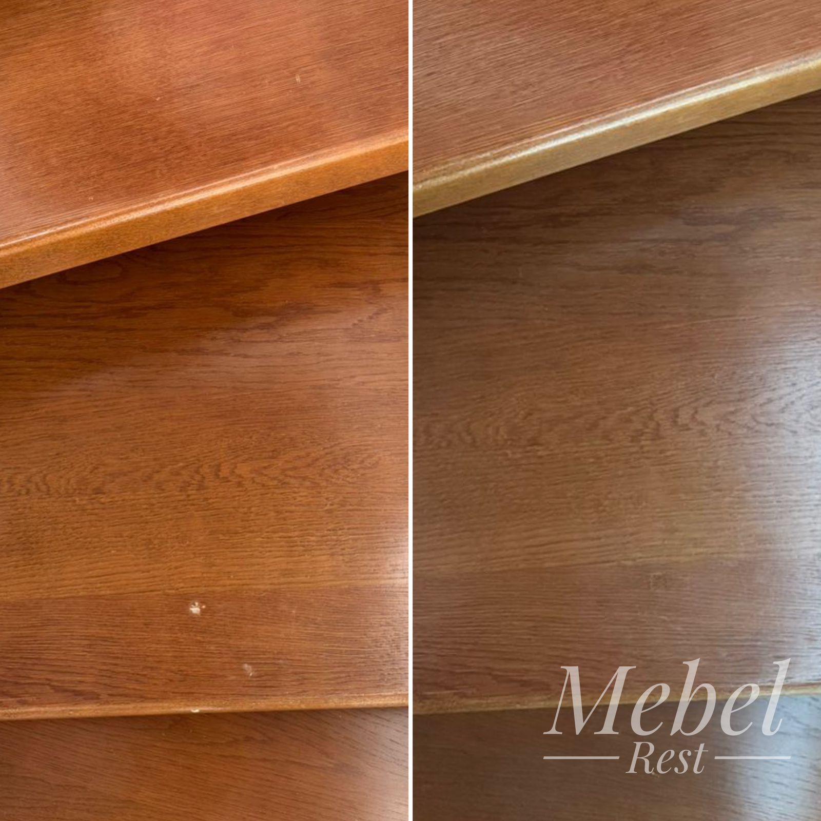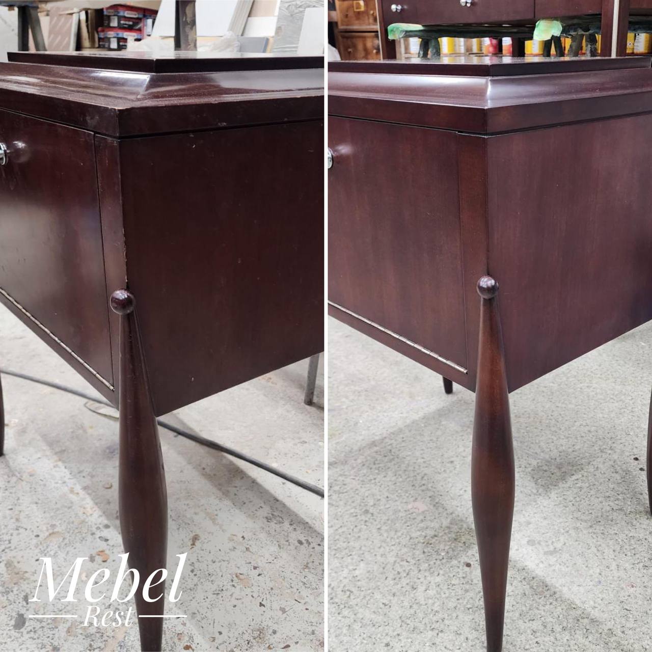 На второй день уже укрепленное место точечно было запаяно реставрационным воском, и подбирался тон фактуры дерева. На следующем этапе место реставрации было покрыто матовым водным лаком. На третий и четвертый день то же самое проделали с другим местом слома. Из-за предыдущего непрофессионального ремонта пришлось придать подлокотнику напряжение, чтобы свести две плоскости.