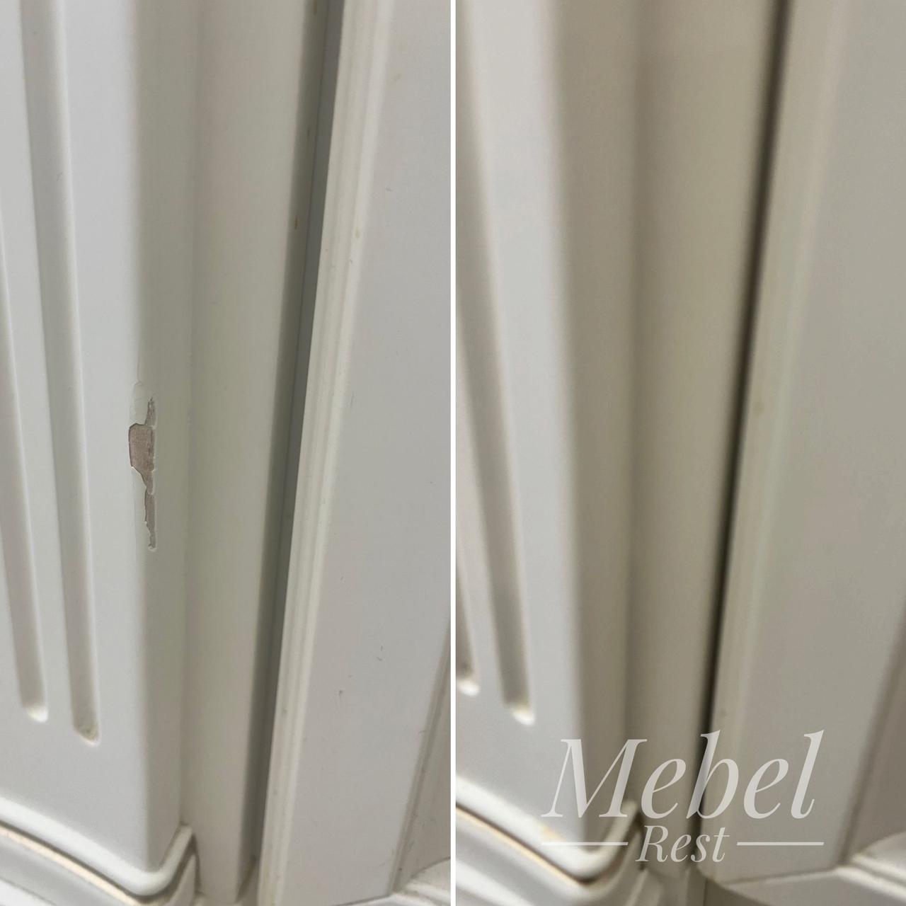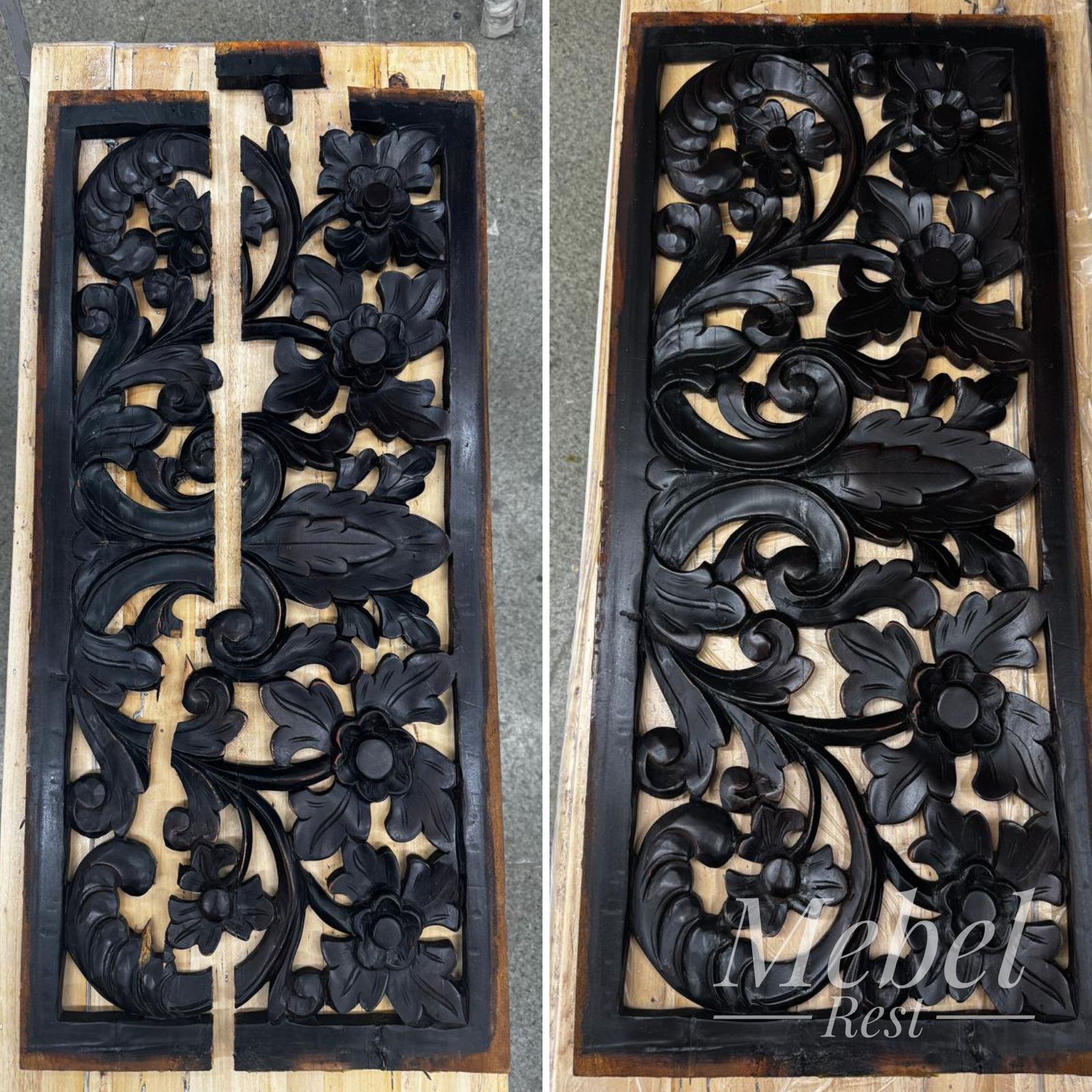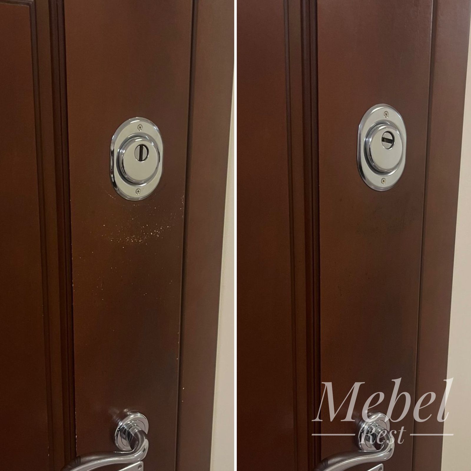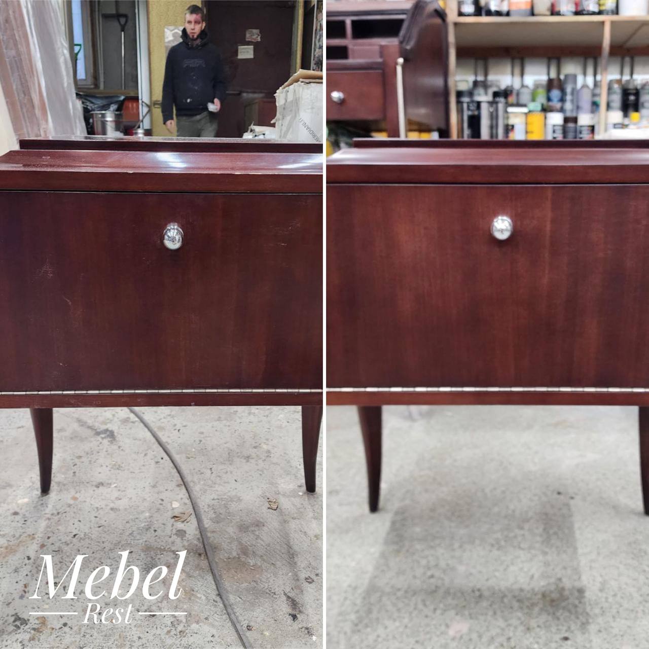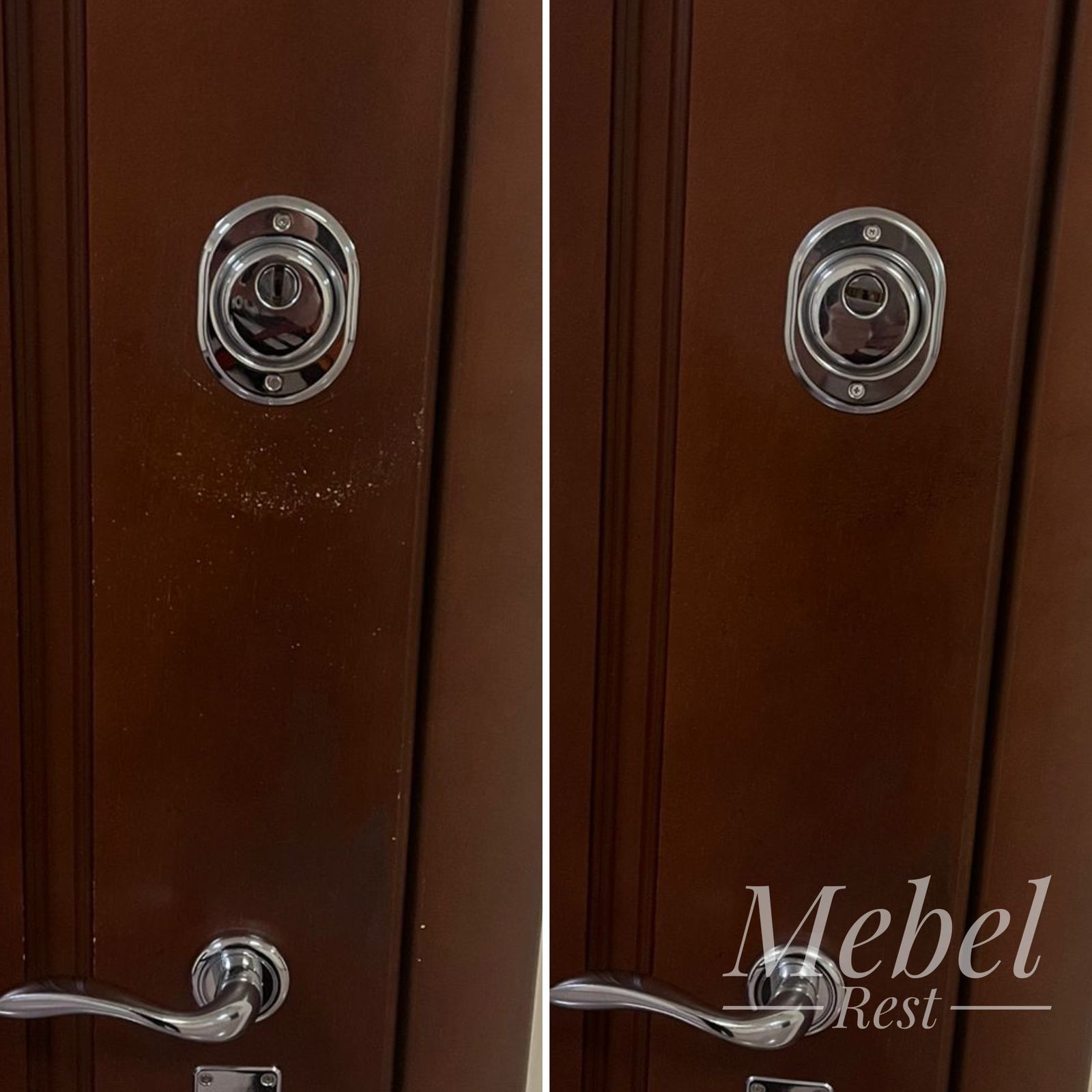На второй день уже укрепленное место точечно было запаяно реставрационным воском, и подбирался тон фактуры дерева. На следующем этапе место реставрации было покрыто матовым водным лаком. На третий и четвертый день то же самое проделали с другим местом слома. Из-за предыдущего непрофессионального ремонта пришлось придать подлокотнику напряжение, чтобы свести две плоскости.